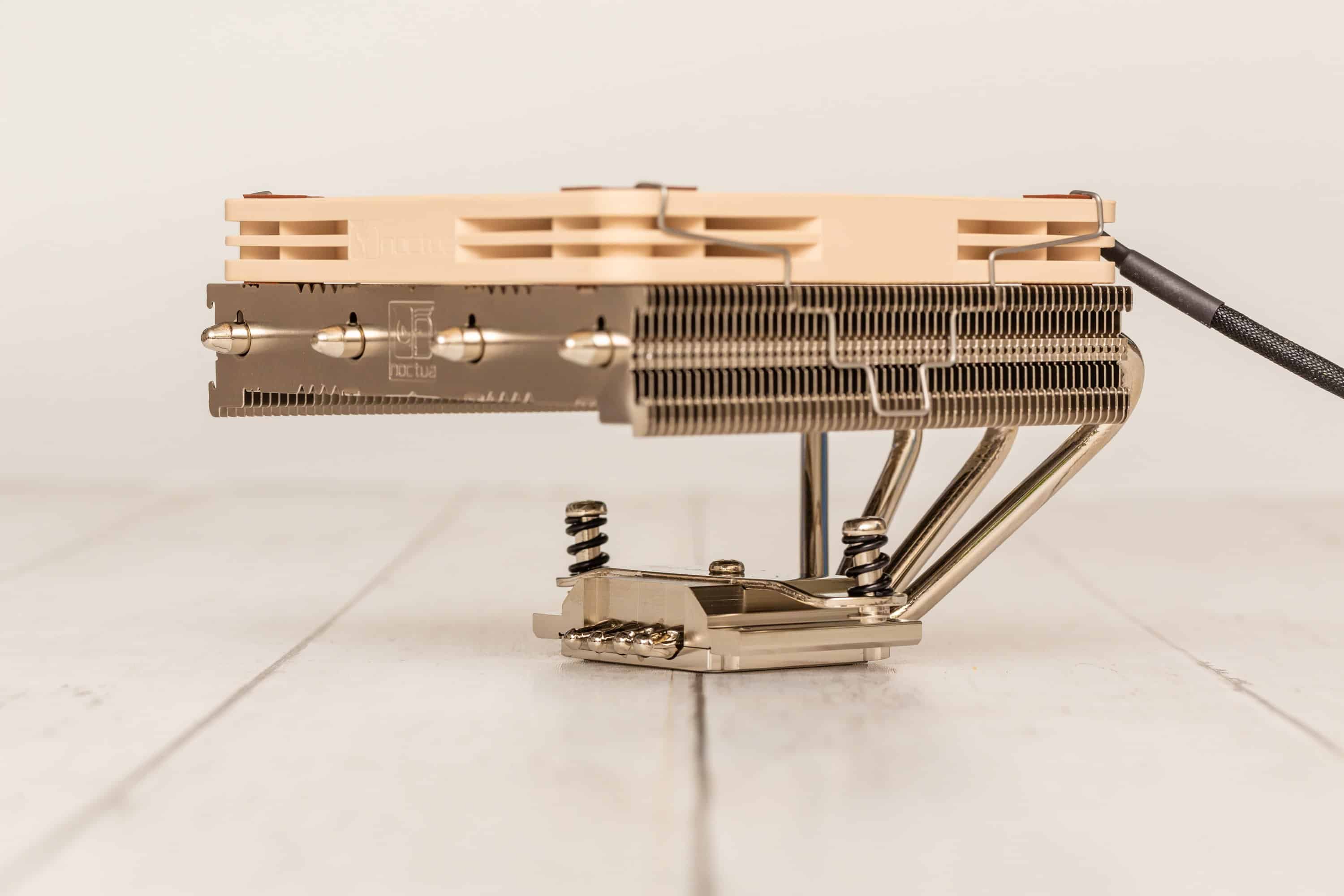 Vom Aufbau her besitzt der Noctua NH-L12S eine vernickelte Kupfer-Kontaktfläche, die mit vier Heatpipes verbunden ist. Diese gehen zu einer Seite heraus und knicken sich insgesamt um 180°, um auf der anderen Seiten mit den Kühllamellen verbunden zu werden. Der mit einer Dicke von nur 15 mm recht schmal ausfallende Lüfter wird nun mit zwei Klammern befestigt. Was die Farbe angeht, landet man mit dem vernickelten Kühlkörper und dem braun-beigen Lüfter im charakteristischen Noctua-Bereich. Manchen gefällt es, vielen gefällt es nicht. Von diesem Kühler ist bis zu diesem Test, fast sieben Jahre nach Erscheinen des Noctua NH-L12S, noch keine schwarze chromax.black-Version erschienen. Aber hey: ist der Lüfter unter den Lamellen versteckt, sieht man die Farbe eh kaum. Ansonsten bieten nicht viele Gehäuse, die Low-Profile-Kühler benötigen, ein Sichtfenster.