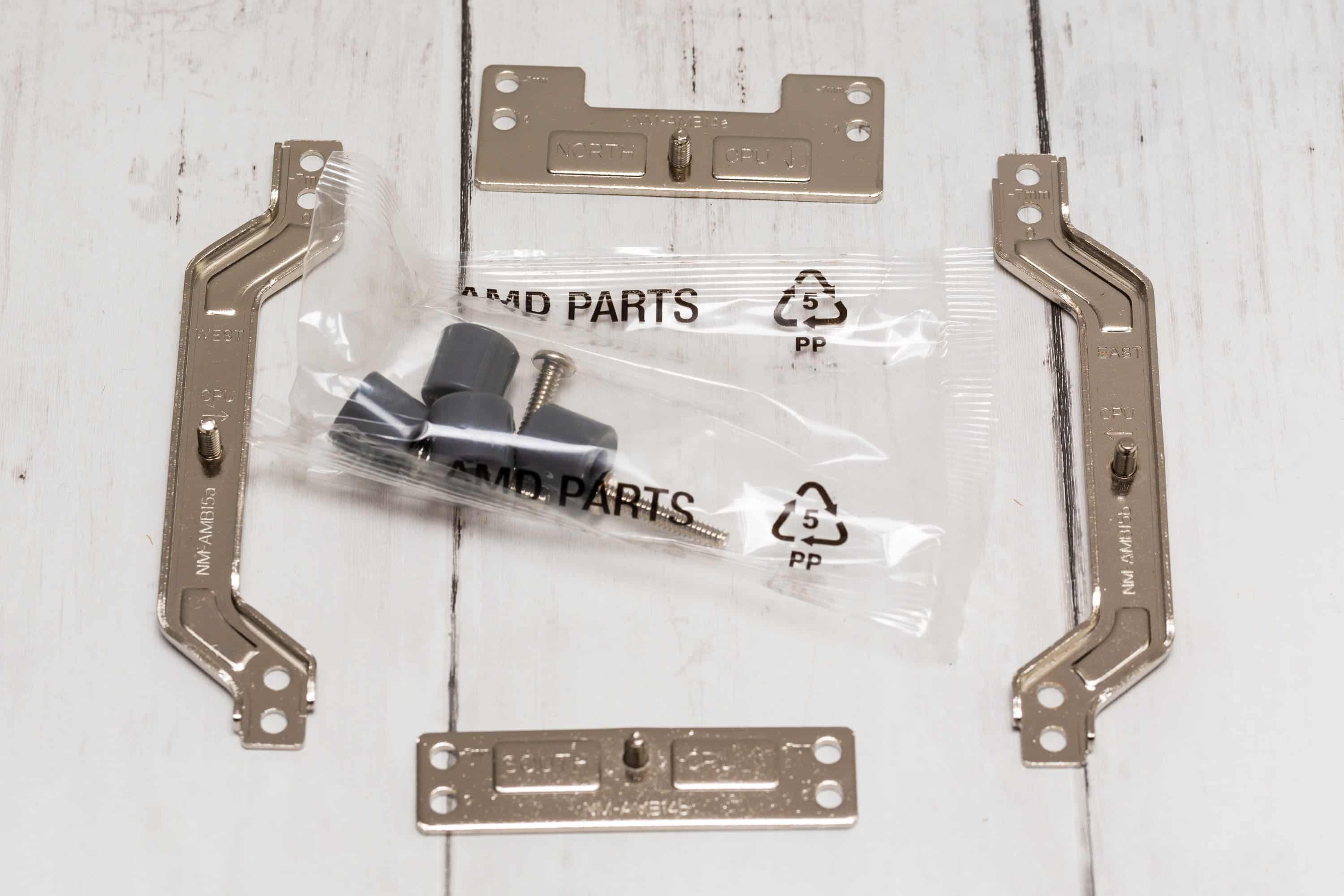 Hier gibt es nicht zwei Brackets, sondern vier Stück. Durch die rechteckige Platzierung der Löcher muss man je nach gewünschter Drehung des Kühlers eines der Paare wählen. Entweder die langen für die reguläre Position oder die kurzen für eine 90°-Drehung. Außerdem haben die AMD-Brackets jeweils zwei Löcher. Einmal für die mittige Anbringung und einmal für die Offset-Anbringung, da bei AMD-Prozessoren der aktuellen Generationen die größte Wärmeentwicklung nicht in der Mitte des Prozessors stattfindet, sondern nach unten versetzt.