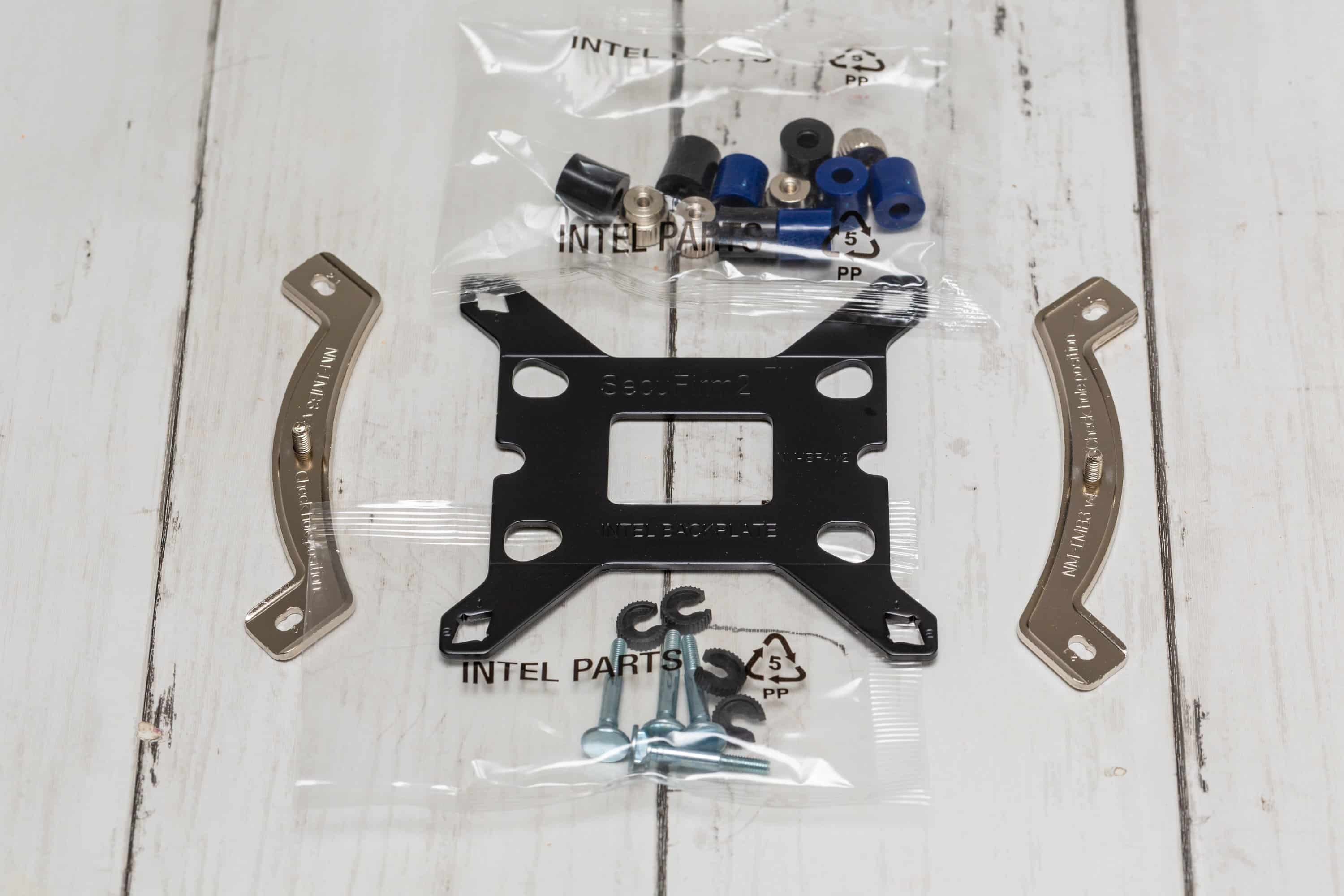 Auf Intel-Sockeln wird die mitgelieferte Metall-Backplate genutzt und je nach Lochabstand werden die Schrauben von hinten durchgeschoben und mit Clips gesichert. Auf der anderen Seite des Mainboards werden Abstandshalter aufgesteckt – je nach Sockel gibt es unterschiedliche Modelle in blau oder schwarz.