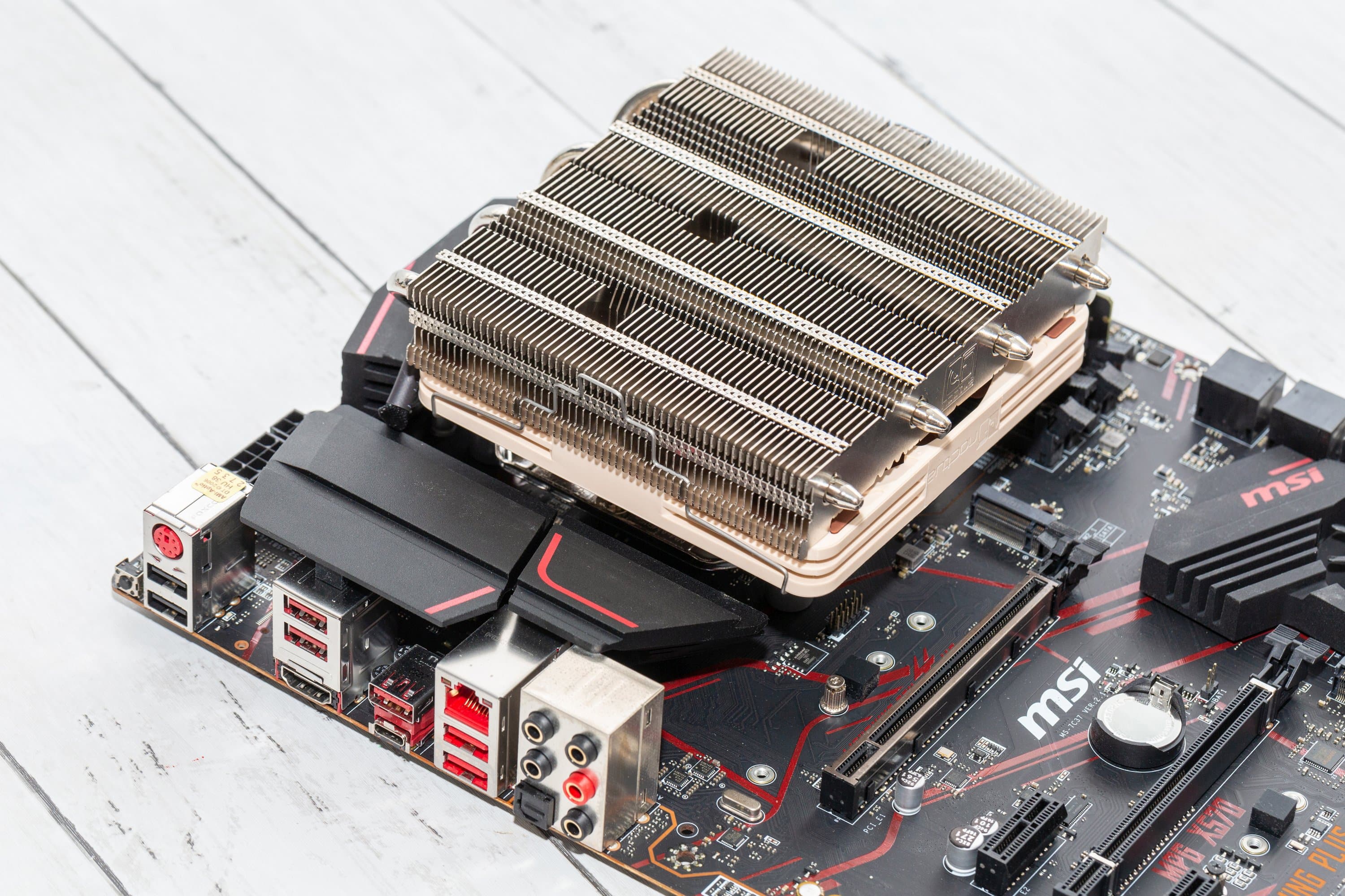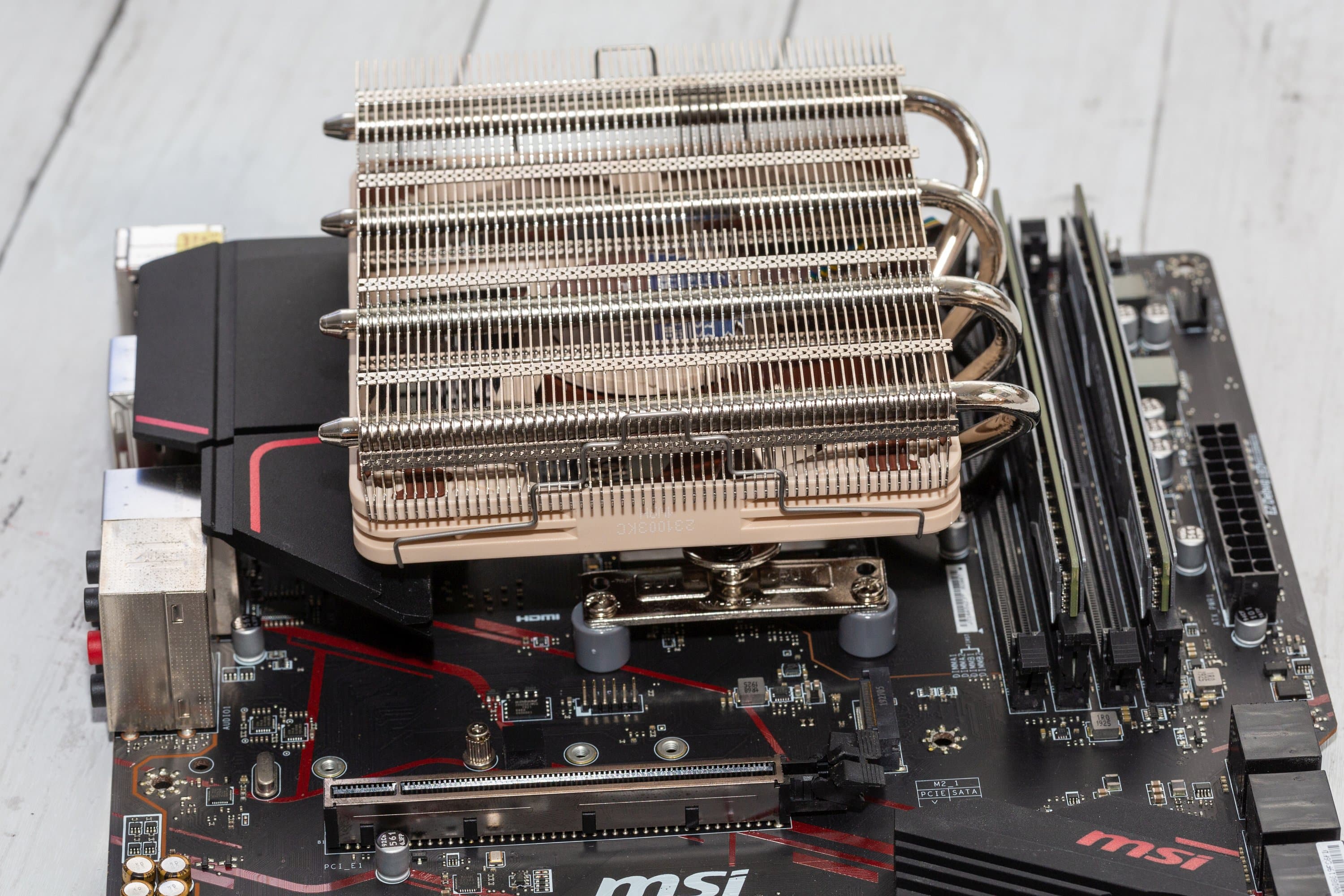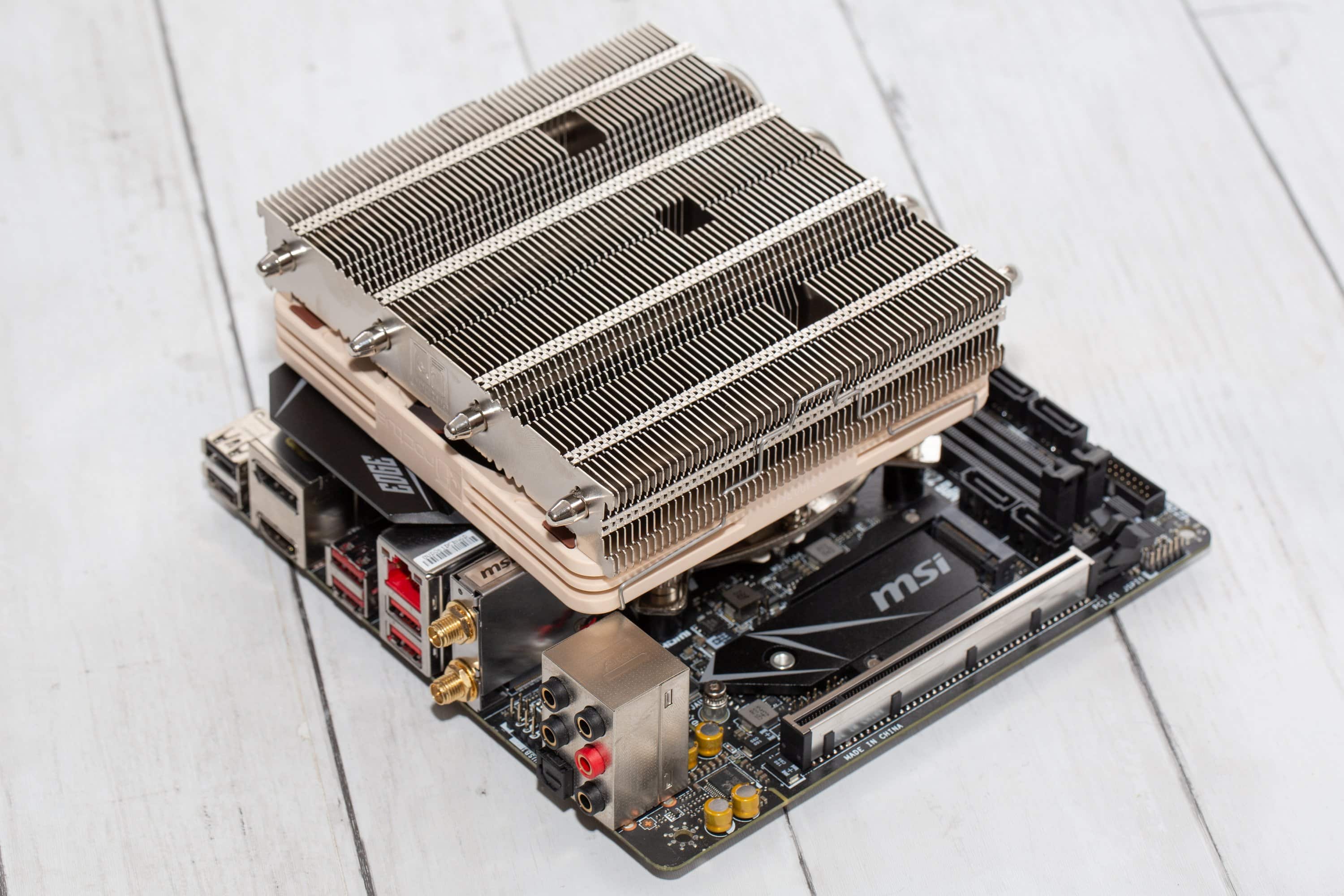 Im Noctua NH-L12S Test zeigt sich, dass sich dieser Low-Profile-Kühler zwar relativ einfach in Position bringen lässt, aber je nach Mainboard muss man die Möglichkeit nutzen, eine freie Ausrichtung wählen zu können. Dabei ist das Problem üblicherweise tatsächlich nicht der Lüfter. Statt dessen kollidieren eher die Heatpipes mit Kühlkörpern der Spannungswandler oder sitzen zu nah an den RAM-Riegeln.