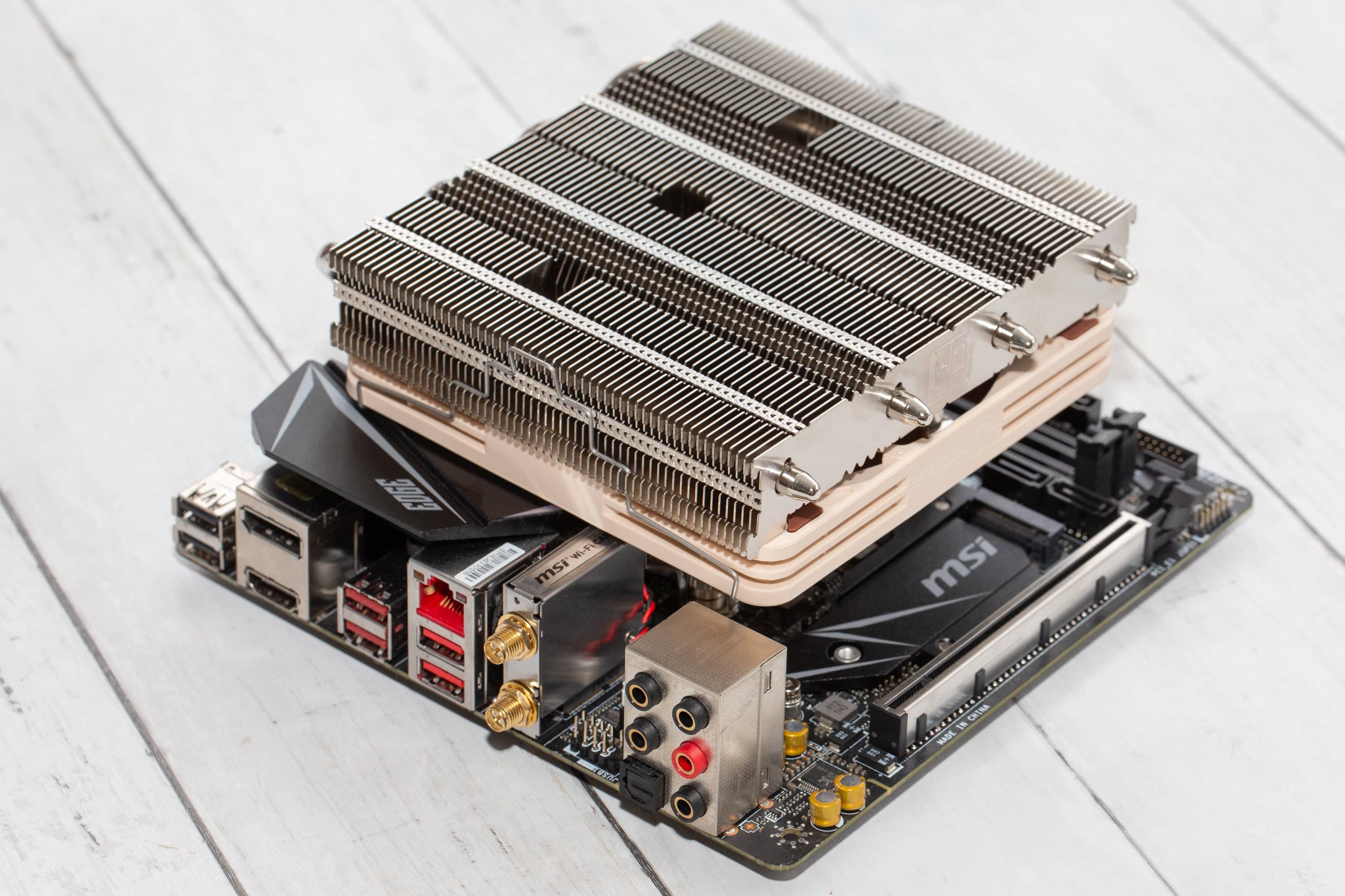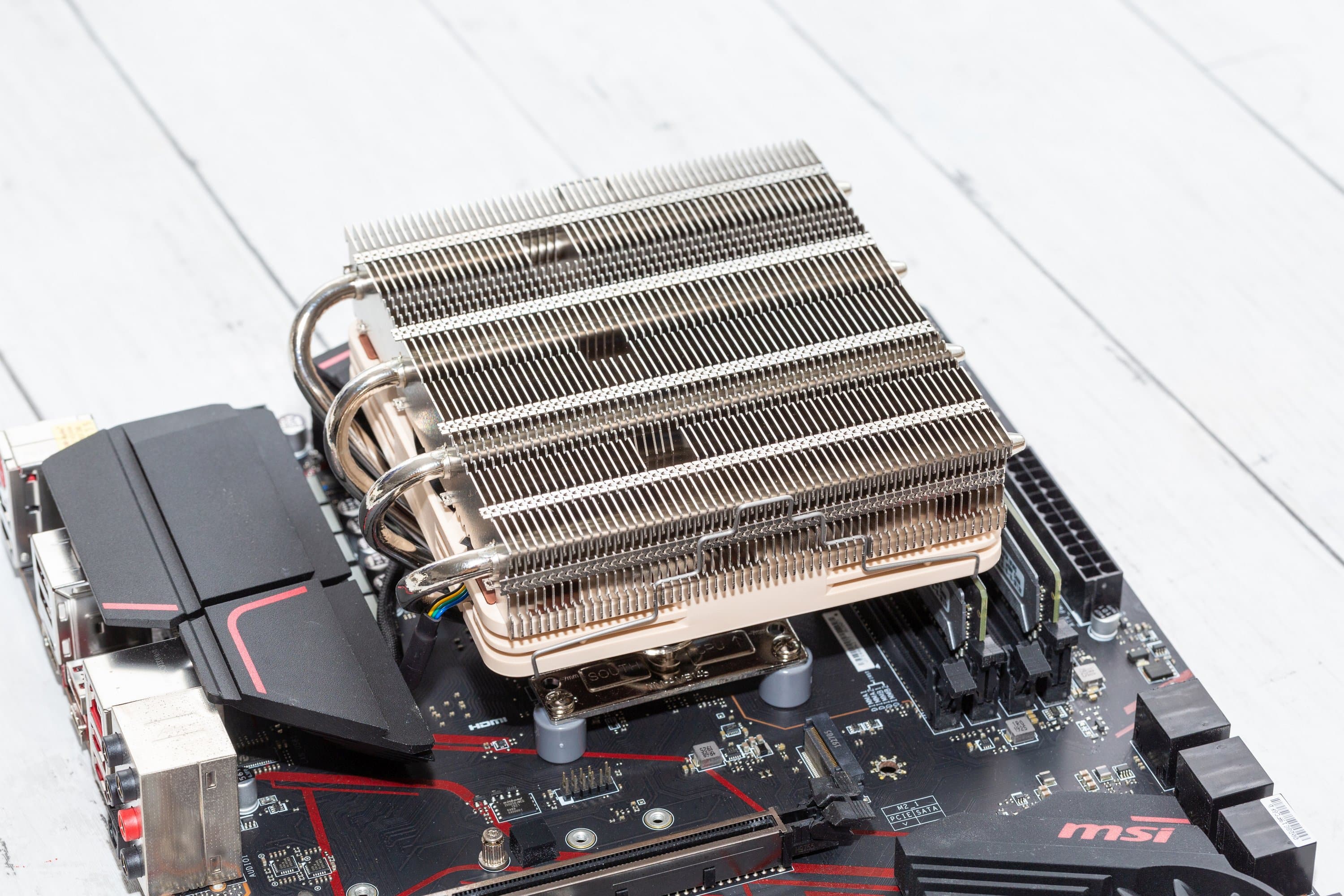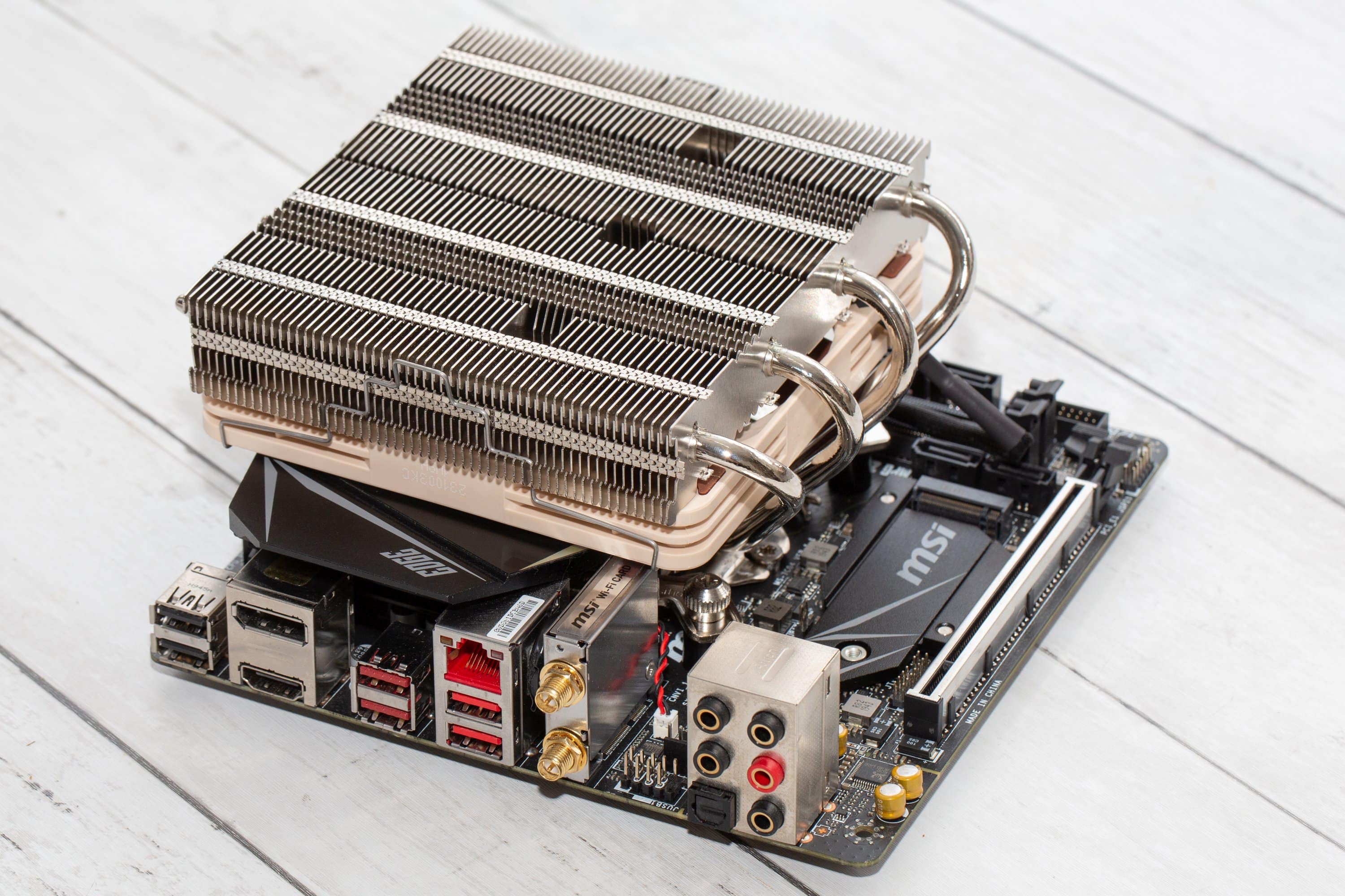 Im Noctua NH-L12S Test zeigt sich, dass sich dieser Low-Profile-Kühler zwar relativ einfach in Position bringen lässt, aber je nach Mainboard muss man die Möglichkeit nutzen, eine freie Ausrichtung wählen zu können. Dabei ist das Problem üblicherweise tatsächlich nicht der Lüfter. Statt dessen kollidieren eher die Heatpipes mit Kühlkörpern der Spannungswandler oder sitzen zu nah an den RAM-Riegeln.