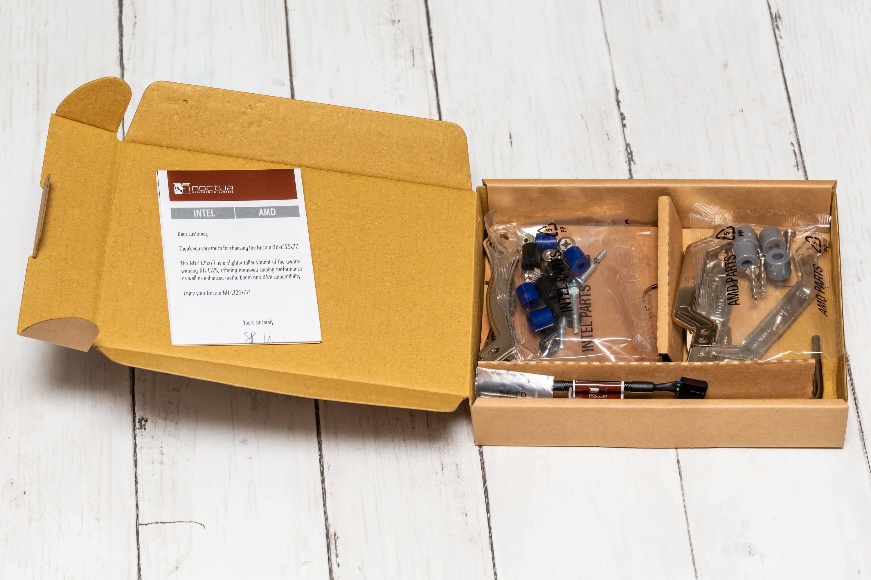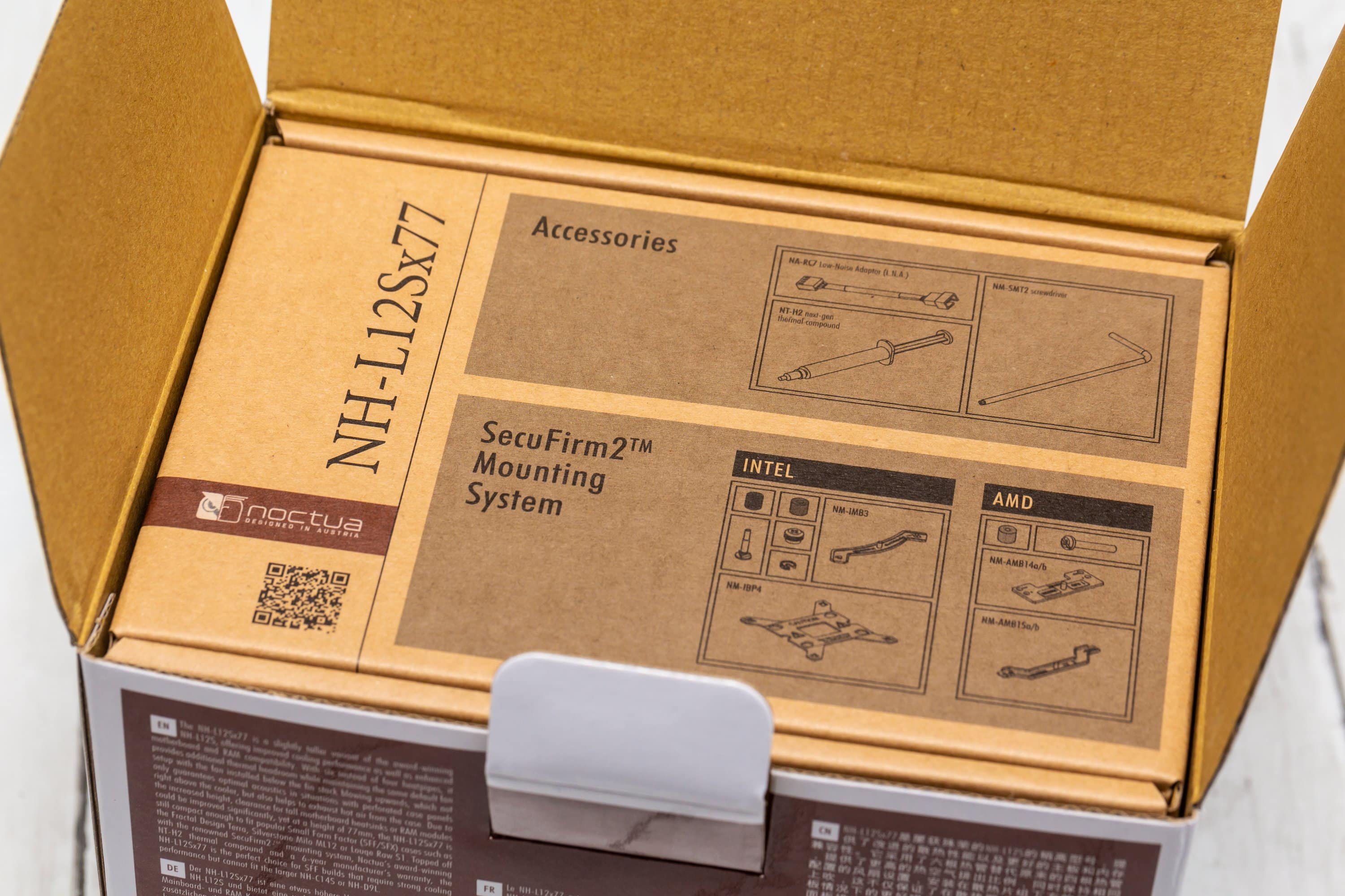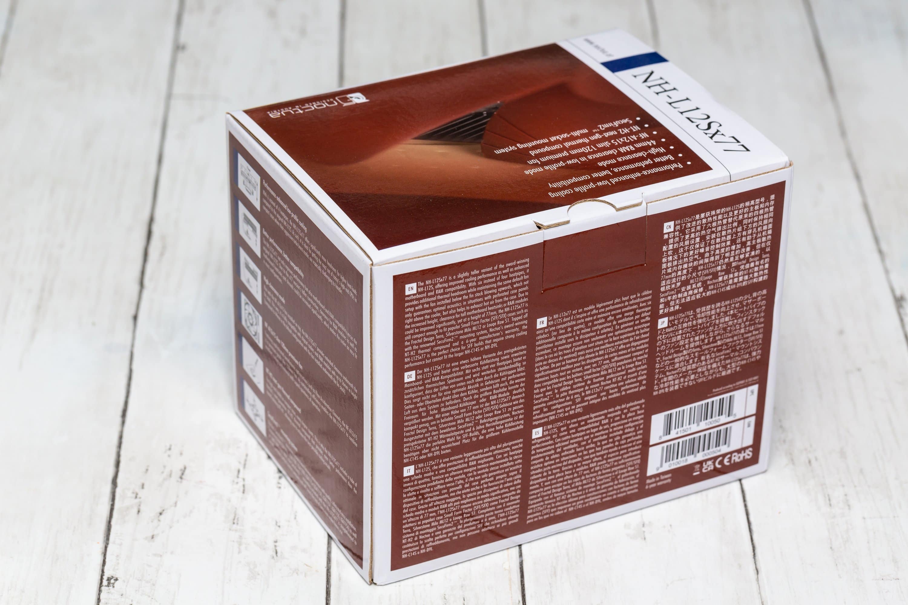 Die Verpackung des Noctua NH-L12Sx77 ist im typischen Stil der Marke gehalten mit einer Mischung aus Braun und Weiß. Auf der Vorder- und Oberseite werden die relevantesten Features zusammengefasst. Auf einer der Seiten werden einige Features genauer erklärt. Die andere Seite fasst die Spezifikationen tabellarisch zusammen und auf der Rückseite gibt es eine mehrsprachige Produktbeschreibung.