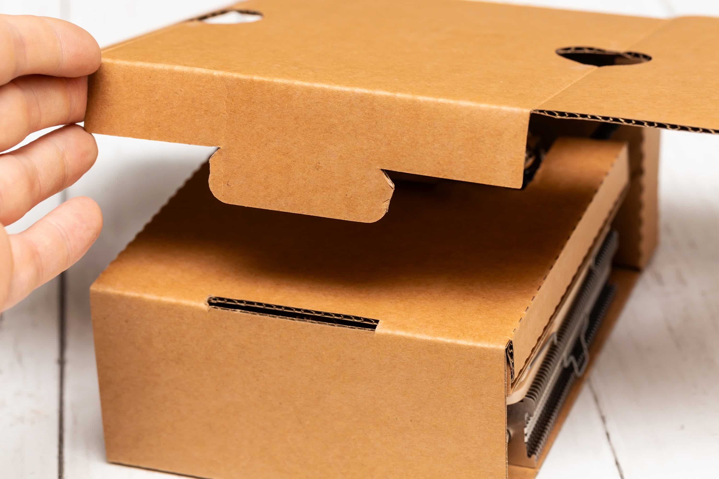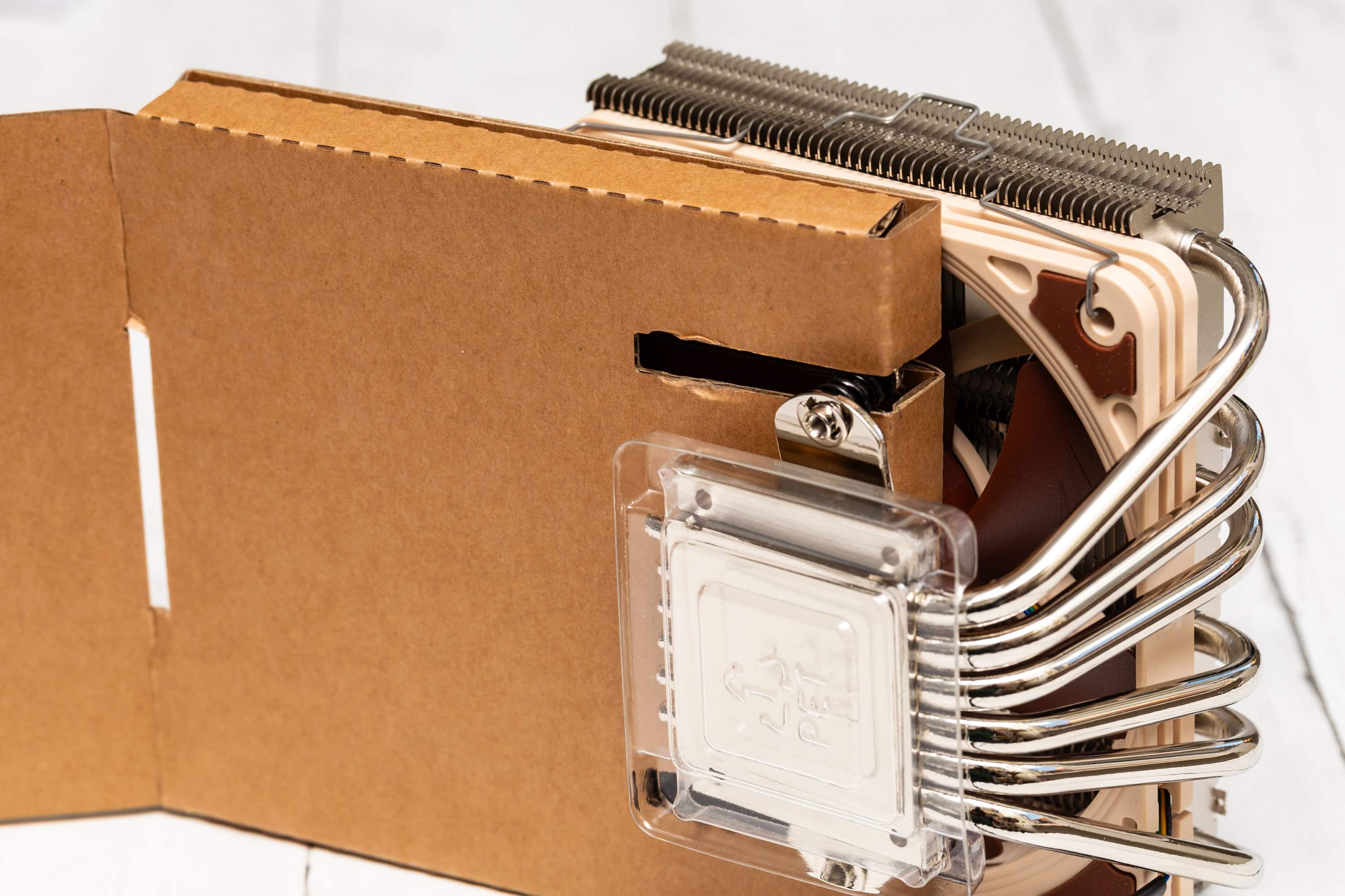 Ebenfalls typisch für Noctua wird bei der Verpackung weitestgehend auf Kunststoff verzichtet und der Kühler wird von einer geschickt gefalteten Kartonkonstruktion geschützt, die unter der Zubehörschachtel steckt. Trotz identischer Verpackungsgröße und sehr vergleichbarer Konstruktion des Kühlers unterscheidet sich das Faltmuster deutlich vom niedrigeren Noctua NH-L12S. Nachdem man eine etwas hartnäckige Einstecklasche gezogen hat, wird der Karton langsam „aufgewürfelt“. Zuletzt werden die Schraubenköpfe für die Montage herausgezogen und der Kühler liegt frei. Kunststoff, aber immerhin nicht viel, findet sich dann doch als Abdeckung der Auflagefläche.