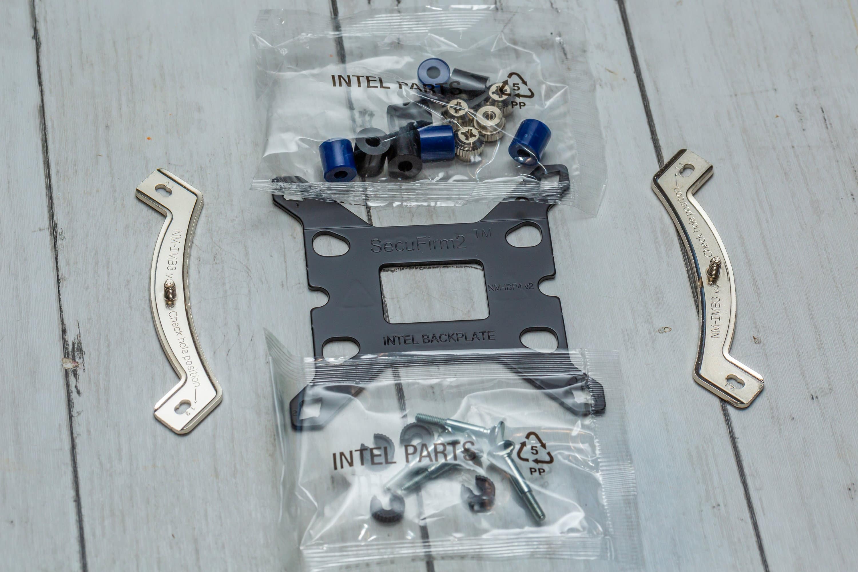 Auf Intel-Sockeln wird die mitgelieferte Metall-Backplate genutzt und je nach Lochabstand werden die Schrauben von hinten durchgeschoben und mit Clips gesichert. Auf der anderen Seite des Mainboards werden Abstandshalter aufgesteckt – je nach Sockel gibt es unterschiedliche Modelle in blau oder schwarz.