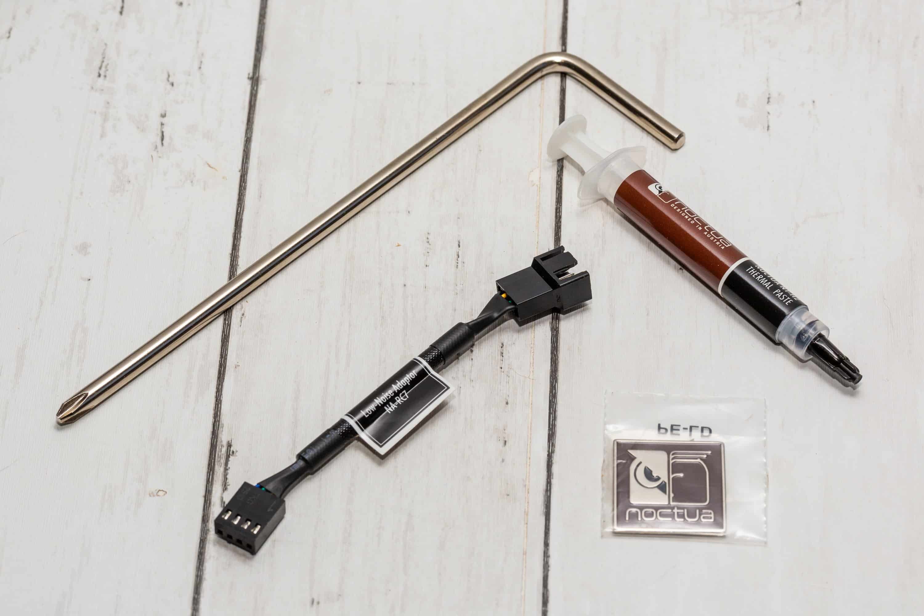 Abgesehen vom Kühlkörper finden sich in der Zubehörschachtel die Montagematerialien für die AMD-Sockel AM4 und AM5 sowie für unterschiedliche Intel-Sockel. Außerdem liegt der typische Noctua-Schrauber mit Kreuzschlitz in der Verpackung, ein Low-Noise-Adapter, der Noctua-Badge aus Metall zum Aufkleben auf das Case und natürlich die Wärmeleitpaste, zum Testzeitpunkt die NT-H2. Erfahrungsgemäß passt Noctua das Montagematerial an, sobald neue Sockel auf dem Markt erscheinen. Sollte man das Montagematerial für ältere Sockel oder zukünftig erscheinende Sockel benötigen, bietet Noctua für Besitzer der Rechnung des Kühlers ein kostenloses Montage-Kit an. Wenn man die Rechnung nicht mehr besitzt, kostet das Kit ein bisschen, ist jedoch noch immer um ein vielfaches günstiger als ein neuer Kühler. Hierbei benötigt man ein Kit mit einem Montageabstand von 78 mm.