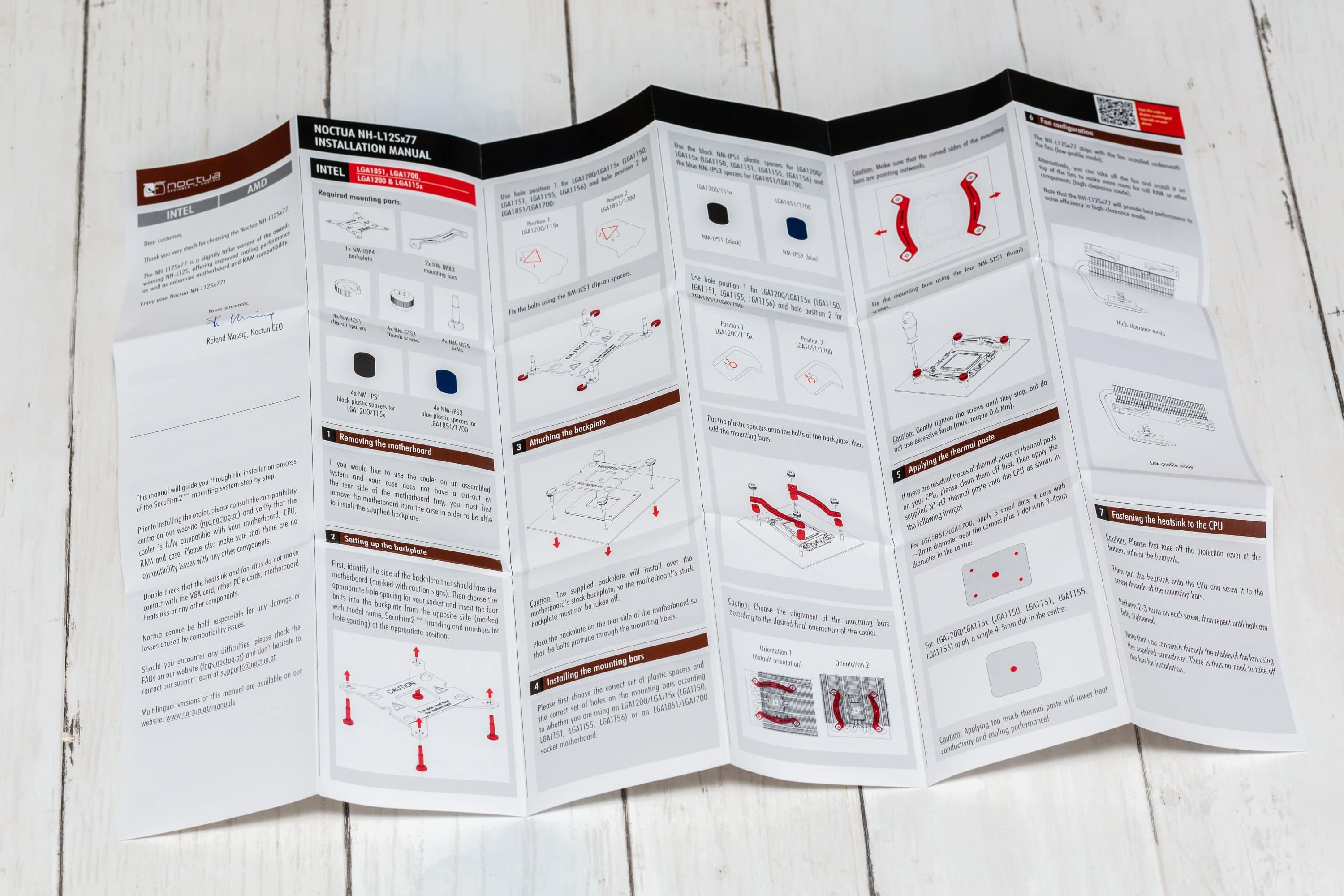 Wie bei nahezu allen Kühlern von Noctua wird beim NH-L12Sx77 auf das SecuFirm2-Montagesystem gesetzt. Dies ist der Standard, an dem sich inzwischen viele andere Hersteller orientiert haben, da die Anwendung einfach ist und gut funktioniert. Die mitgelieferte Anleitung ist sehr gut und präzise, sodass es nicht schwer ist, ihr zu folgen. Wer die Anleitung in einer anderen Sprache als der mitgelieferten englischen Version braucht, findet diese auch in anderen Sprachen direkt auf der Webseite von Noctua.