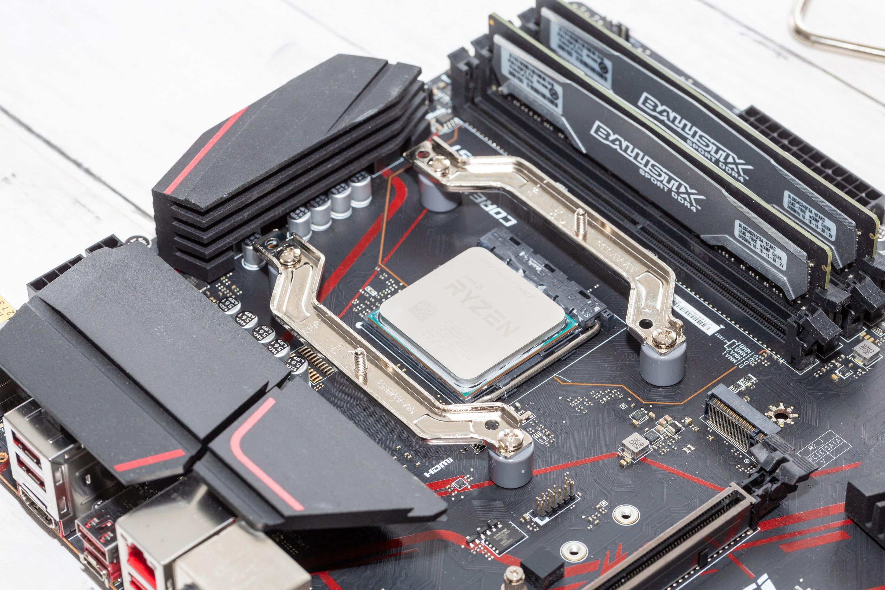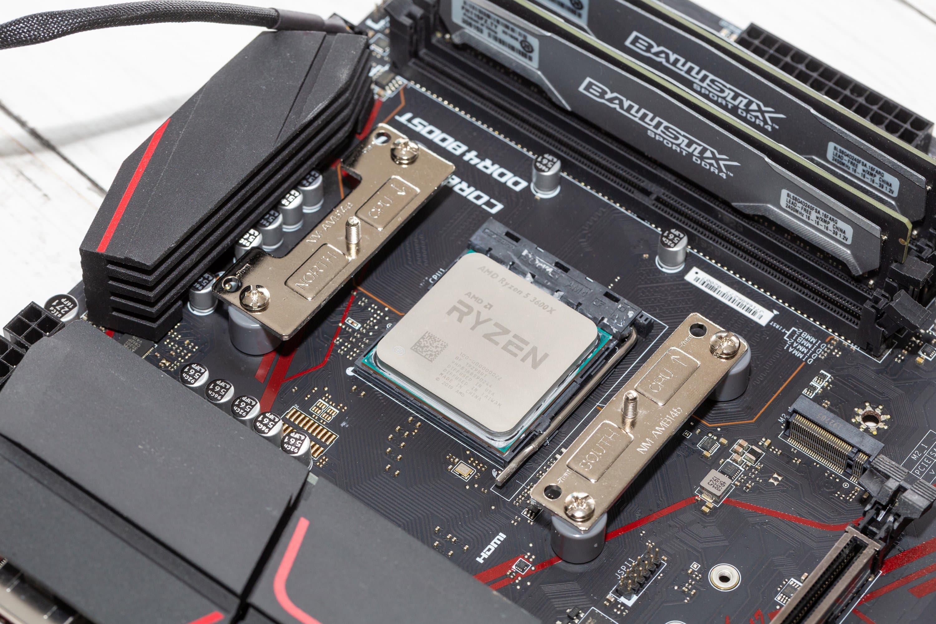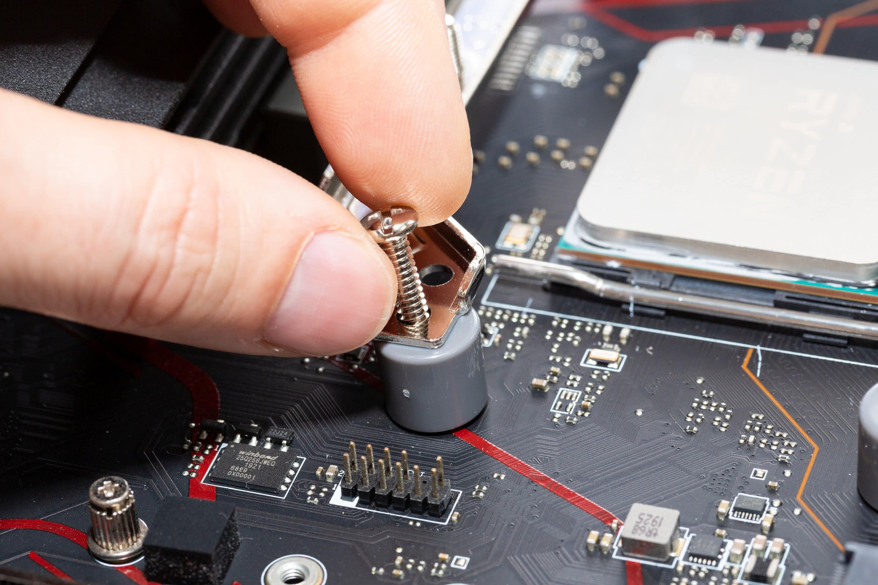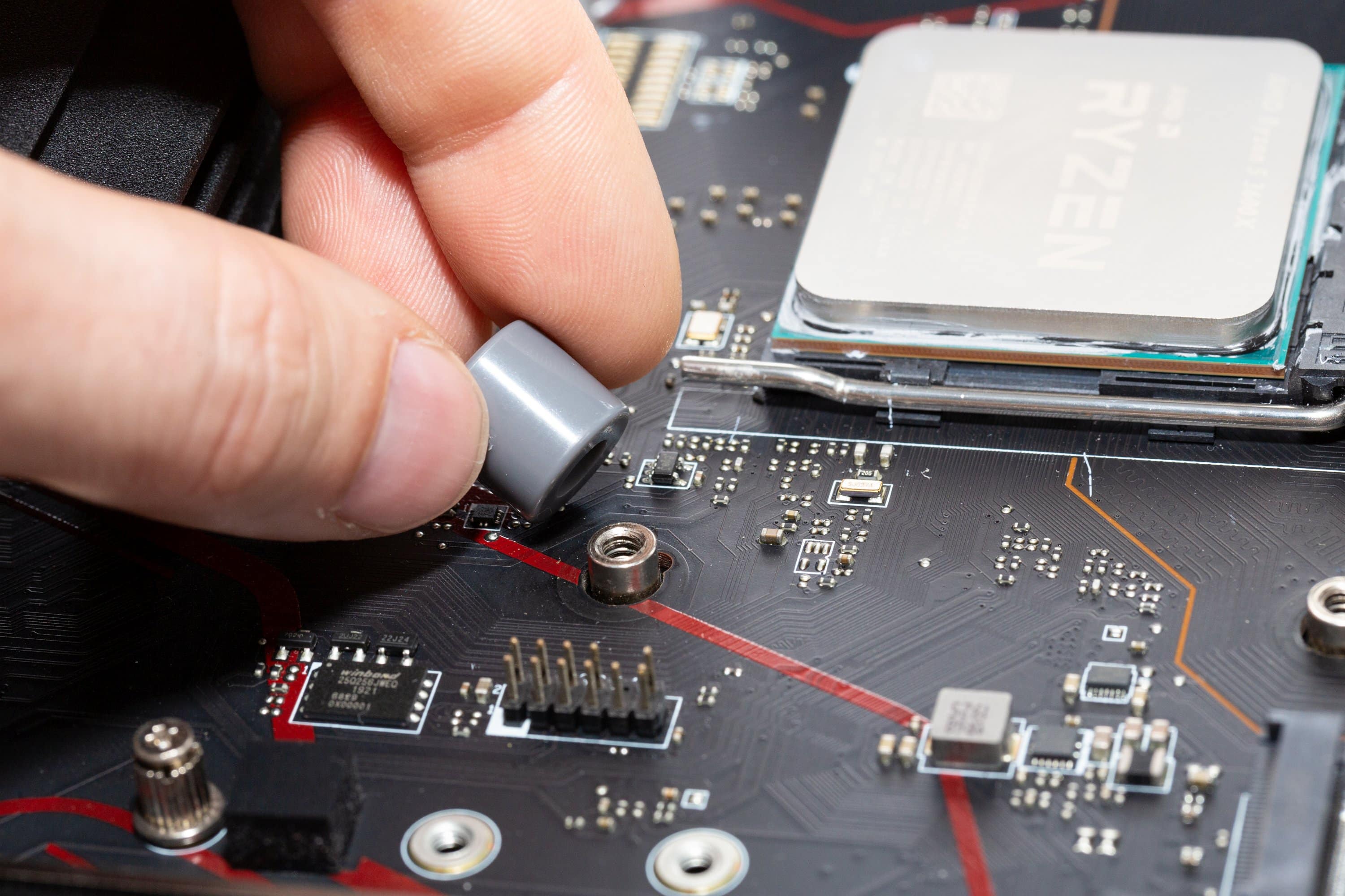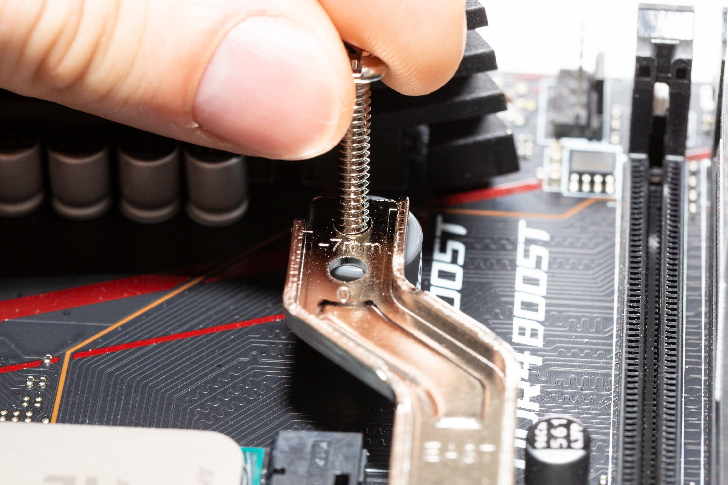Auf AMD-Sockeln ist die Montage komplexer. Hier nutzt man die originale AMD-Backplate und muss nur, falls noch vorhanden, die originalen Plastik-Clips herausschrauben. Nun muss man die Backplate von hinten halten und von vorne Schrauben durch die Brackets und die Abstandshalter führen, um diese an der Backplate festzuschrauben. Am besten funktioniert das, wenn das Mainboard auf dem Tisch liegt, sodass die Backplate nicht herausrutscht und man die Einzelteile von vorne platzieren kann.