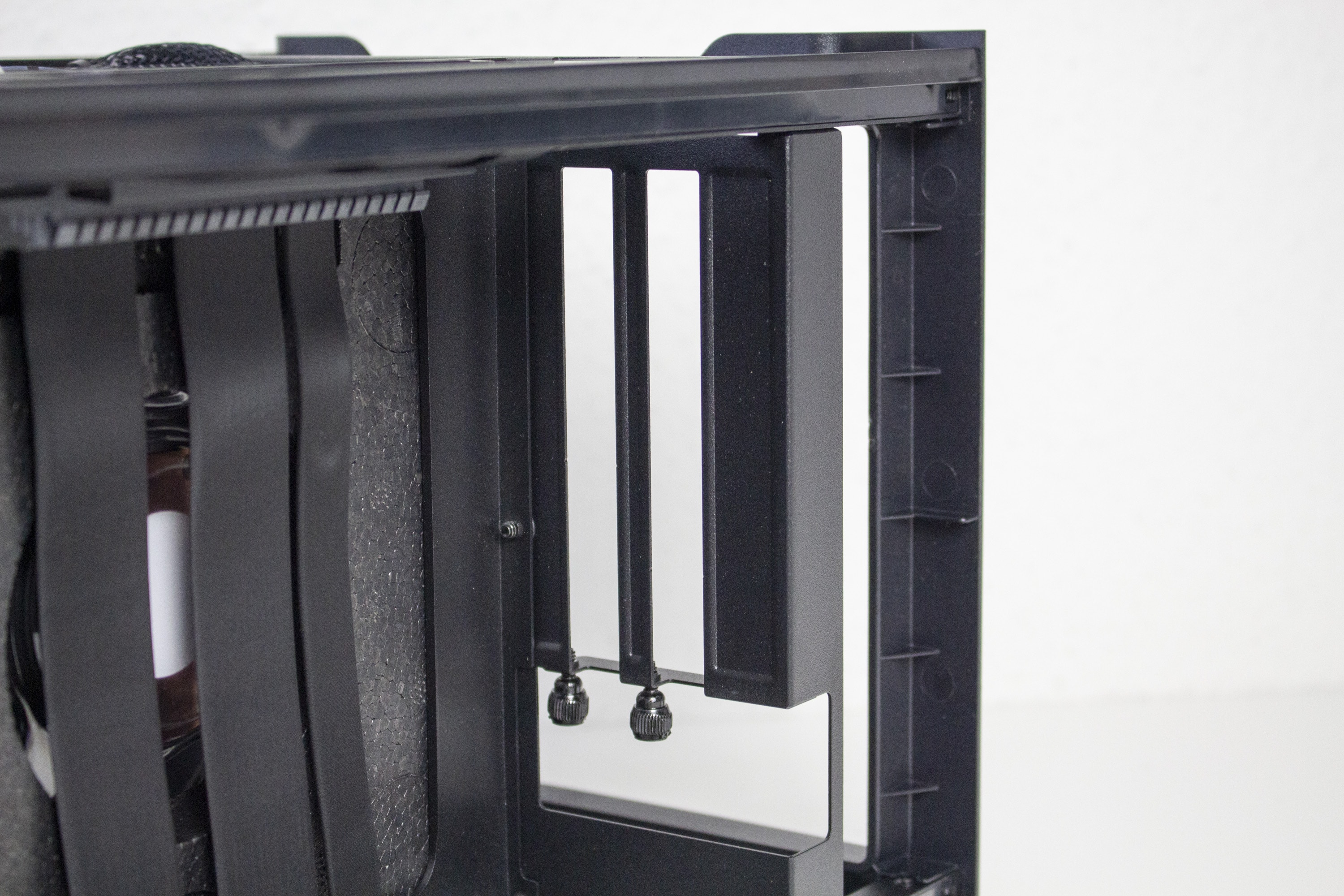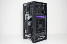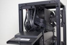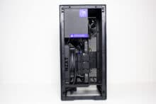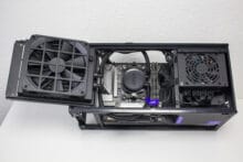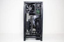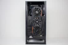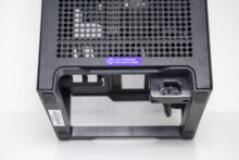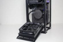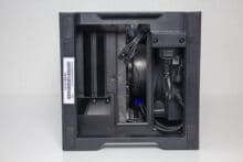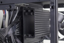 Typisch für ein ITX-Gehäuse gibt es im Innenraum nur bedingt Platz für Datenträger. Dennoch hat NZXT zwischen Grafikkarte und Netzteil noch einen Ort gefunden, an dem ein HDD-Käfig für zwei 2,5″-Geräte untergebracht werden konnte. Die Montage erfolgt mittels Schienensystem komplett werkzeuglos und erfordert nicht den Ausbau der Grafikkarte oder sonstiger Komponenten.