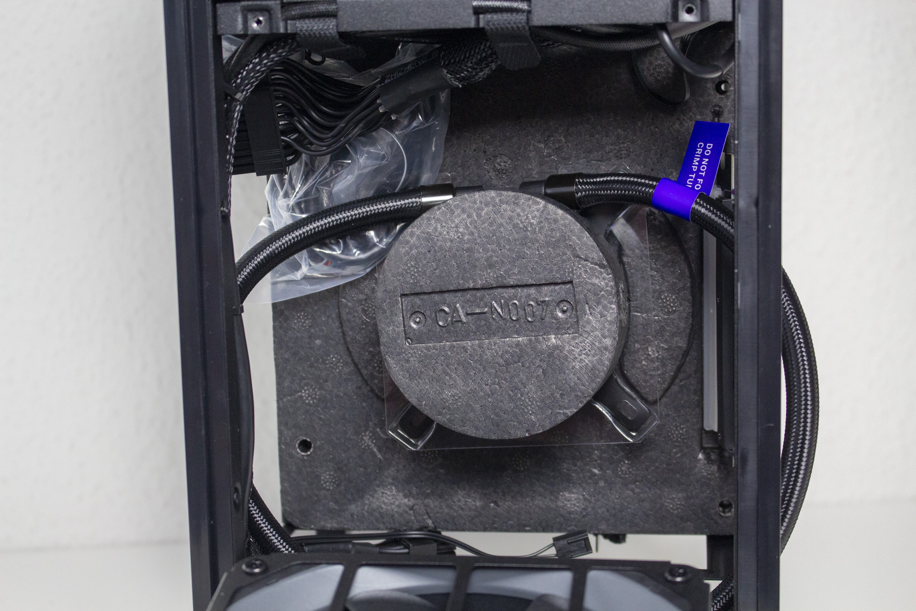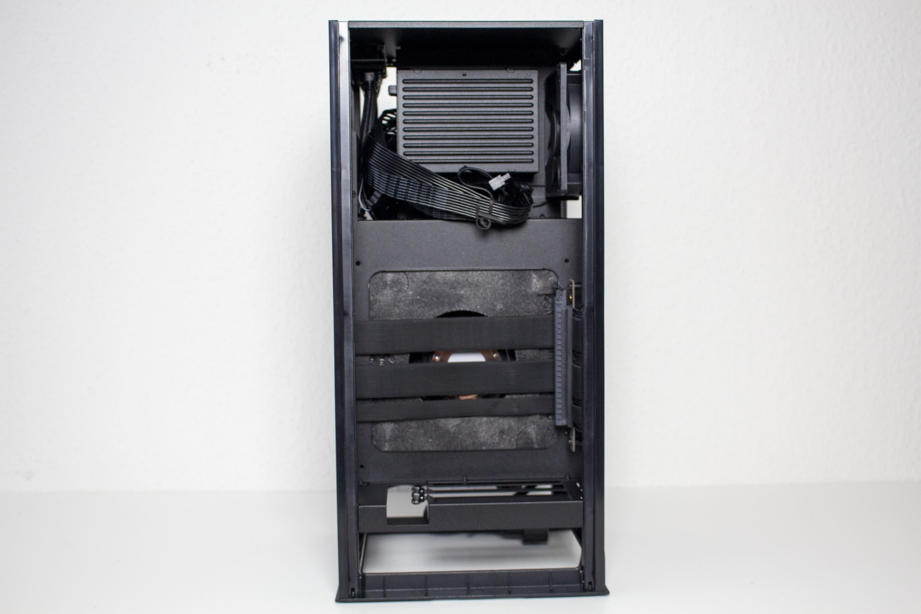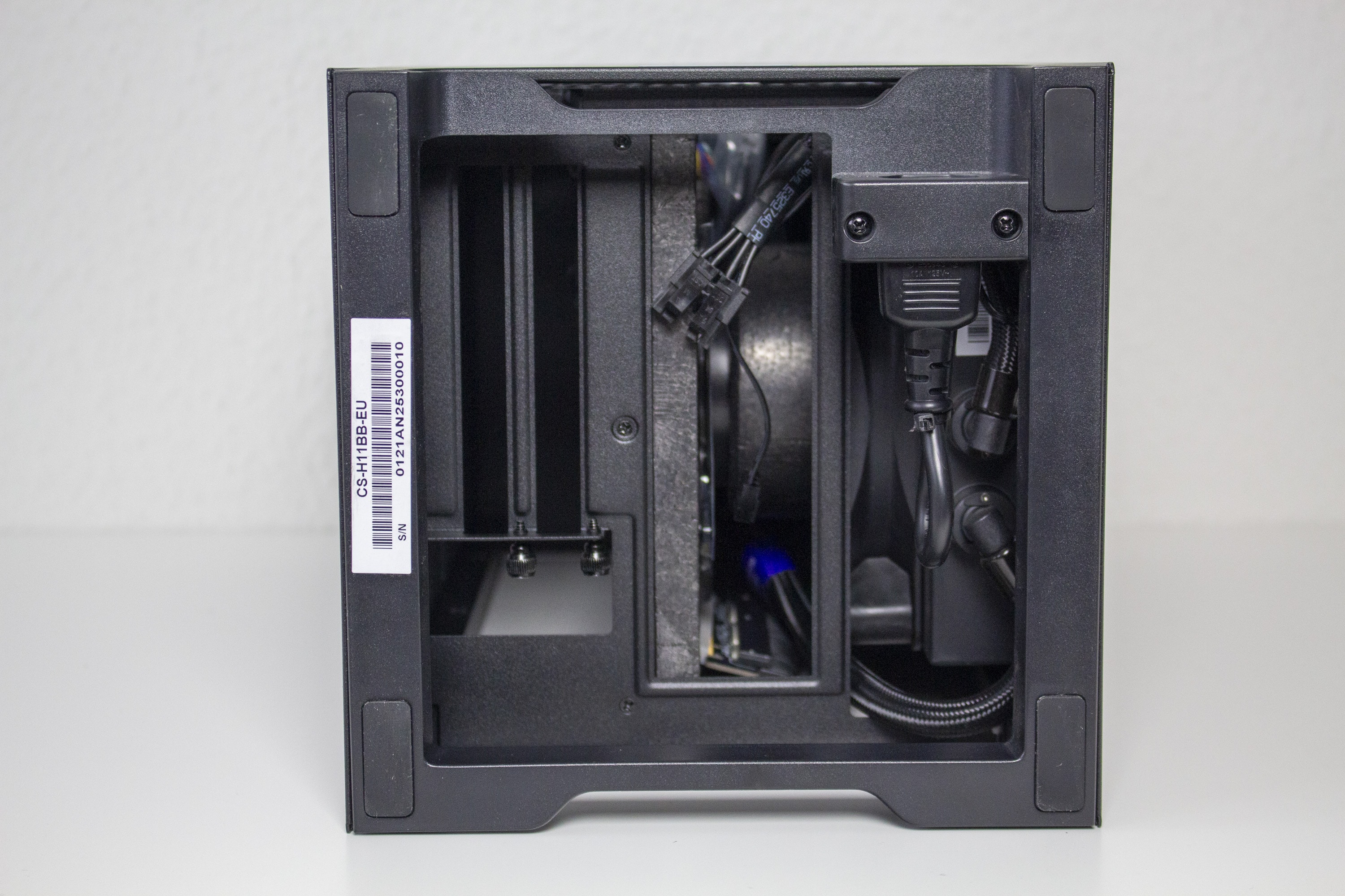 An der Unterseite gibt es eine kleine Kammer in welcher die nach unten gerichteten Anschlüsse des Mainboards und der Grafikkarte zu finden sind. Die Kammer ist ungefähr fünf Zentimeter hoch und bietet damit ausreichend Raum, um auch nicht abgewinkelte Kabel dort anschließend zu können. Weiterhin ist hier die Buchse für das Netzkabel zu finden. Die Verbindung zum innen liegenden Netzteil erfolgt über ein vorverlegtes Kabel.
