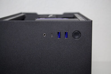 Im Deckel gibt es grundsätzlich nur eine Neuerung. So verfügt das I/O-Panel bei v2 nun über insgesamt drei USB-Ports (1x USB Type-C, 2x USB Typ-A) und einen HD-Audio-Port. Ansonsten ist der obere Bereich komplett geschlossen und lässt weiterhin keine Abführung der warmen Luft aus dem Innenraum zu.