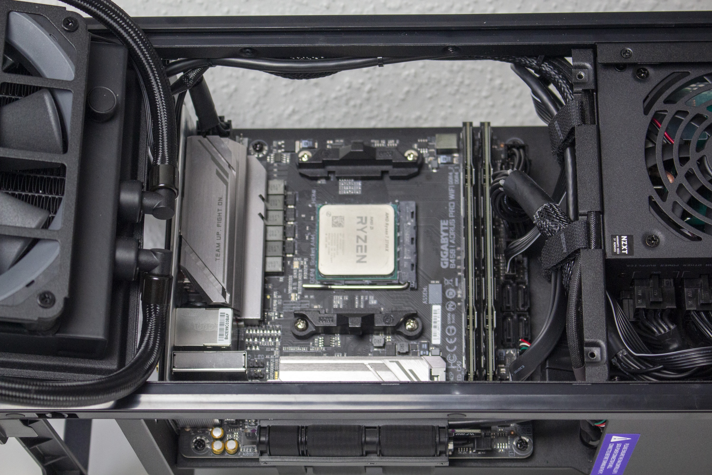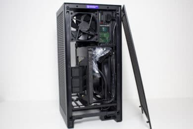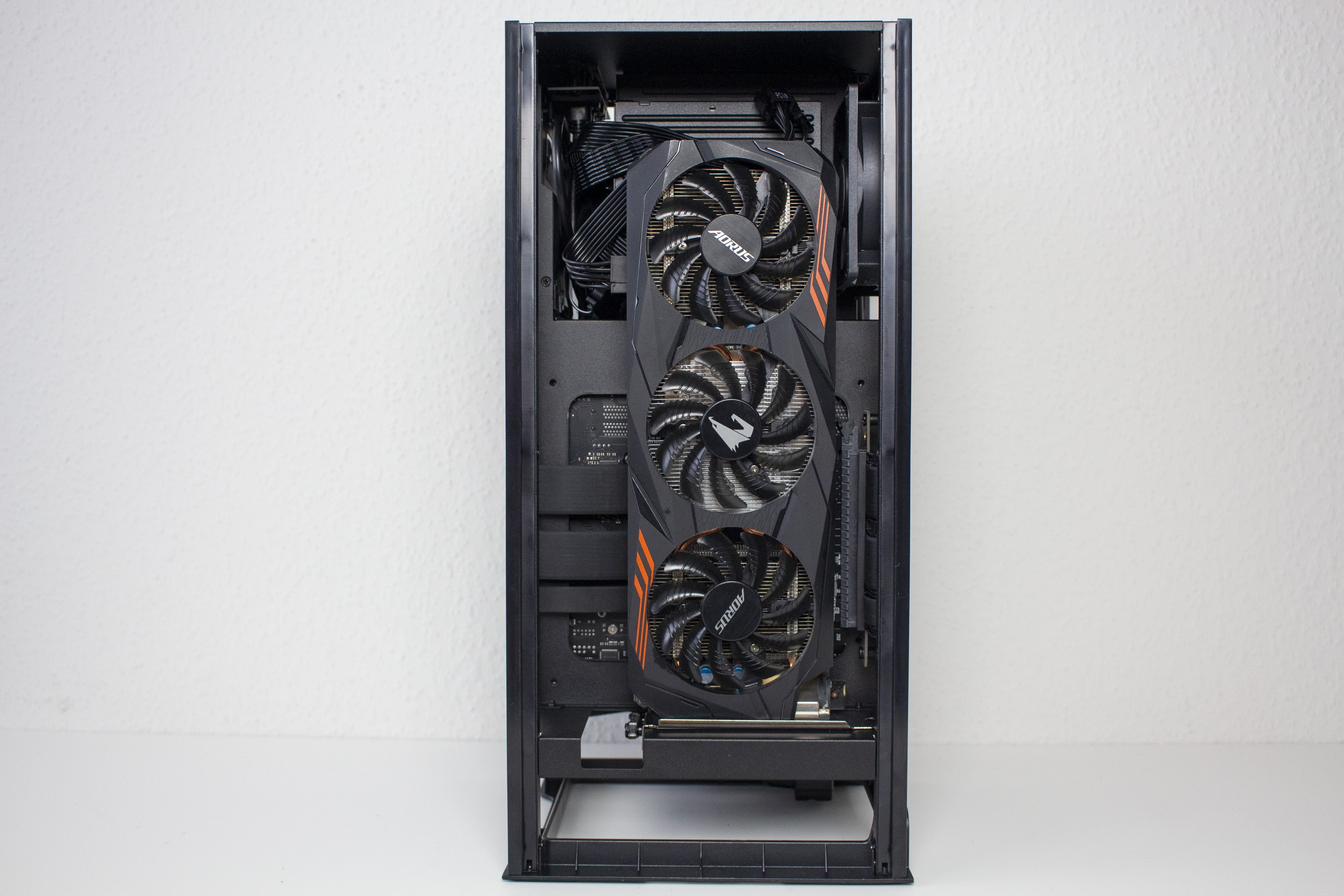 Nun kommen wir zum Systemeinbau. Als Hardware verwenden wir einen AMD Ryzen 7 3700X auf einem Gigabyte B450 I Aorus Pro WIFI mit Crucial Ballistix Sport LT grau 32 GB DDR4-3000. Der Ryzen wird von der integrierten 140mm-AiO-Wasserkühlung gekühlt und mit Standardtakt betrieben. Für die Bildausgabe ist eine GTX 1060 6GB von Gigabyte AORUS zuständig. Die Stromversorgung erledigt das integrierte voll-modulare Netzteil mit 750W.