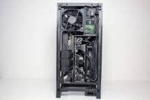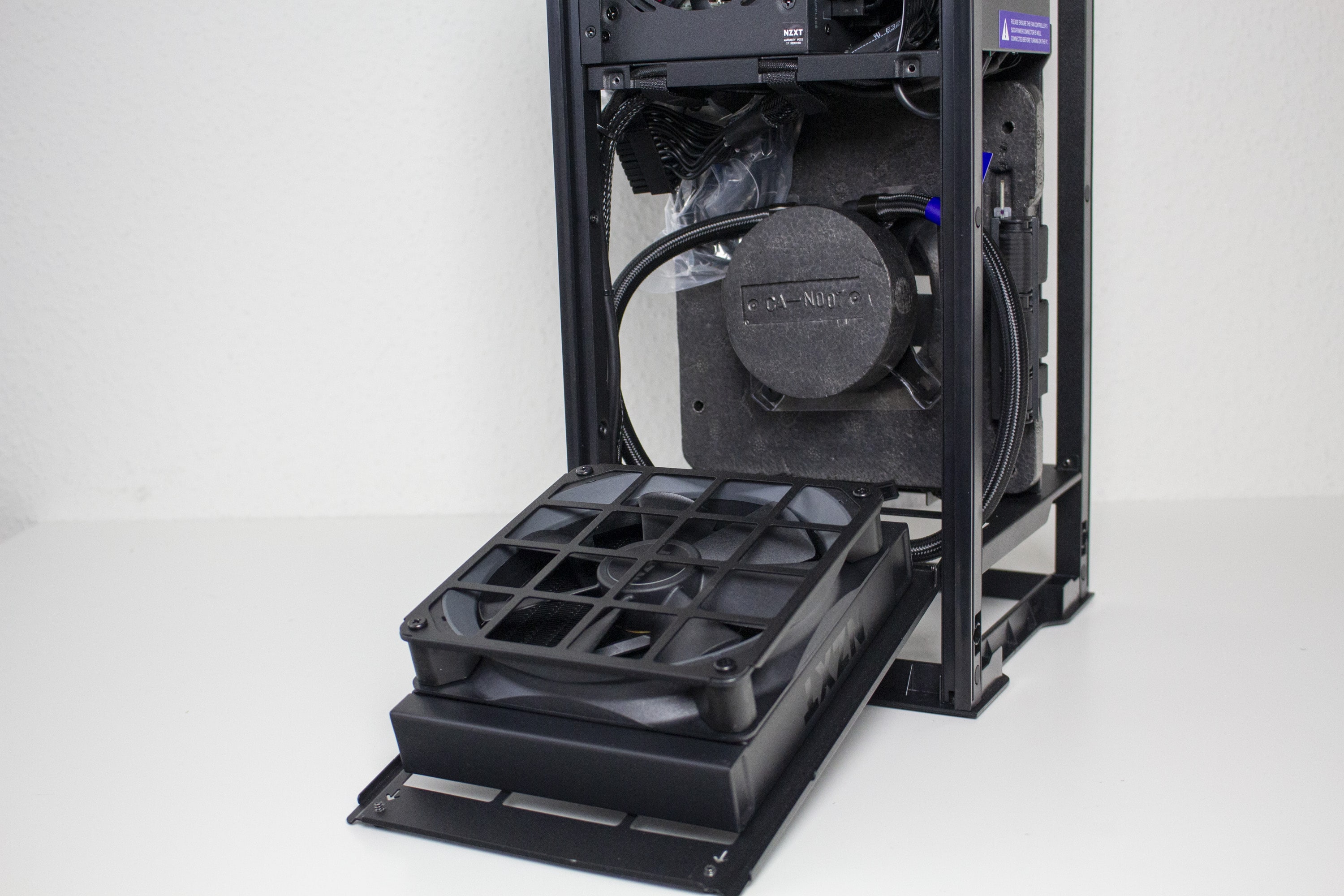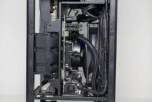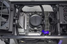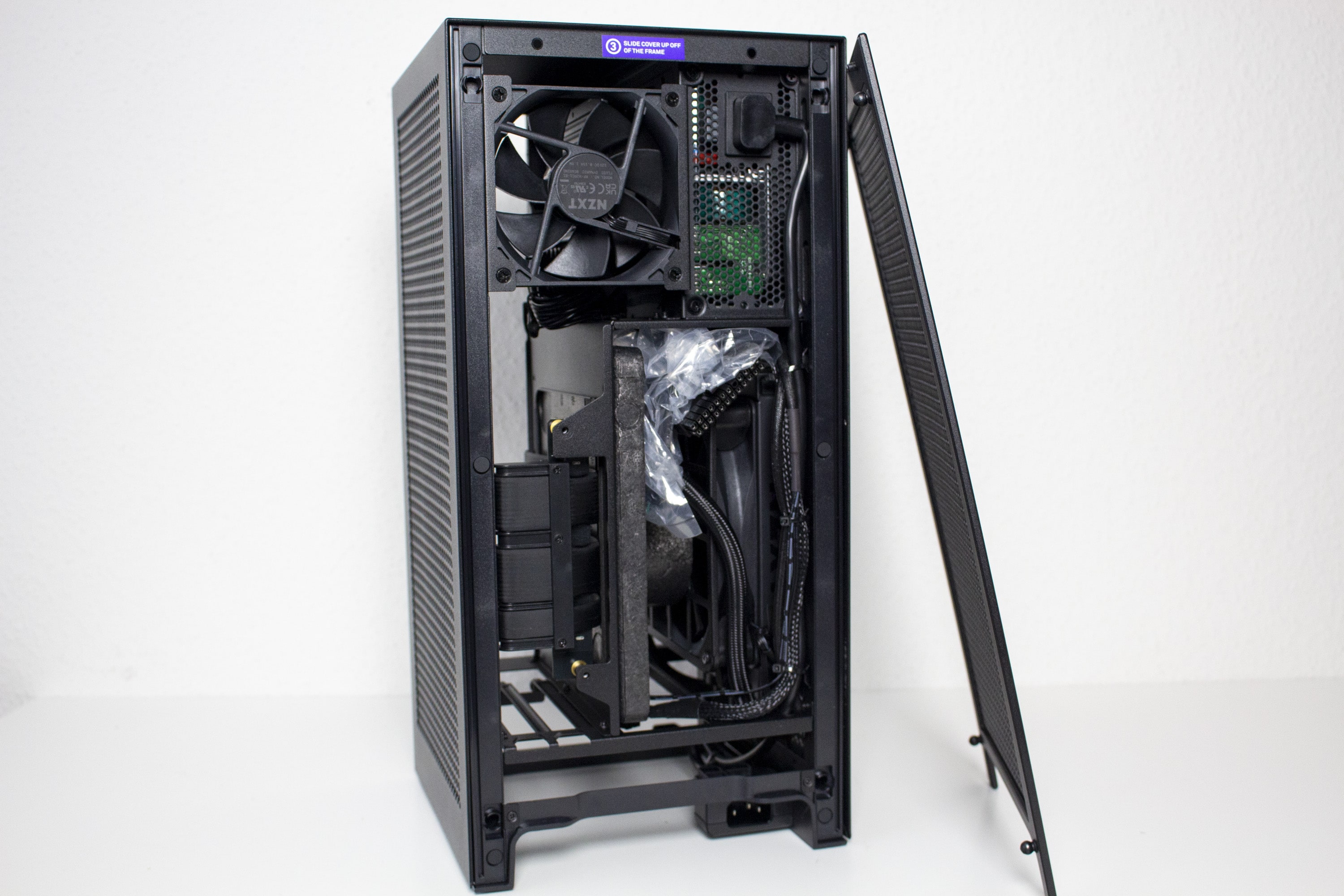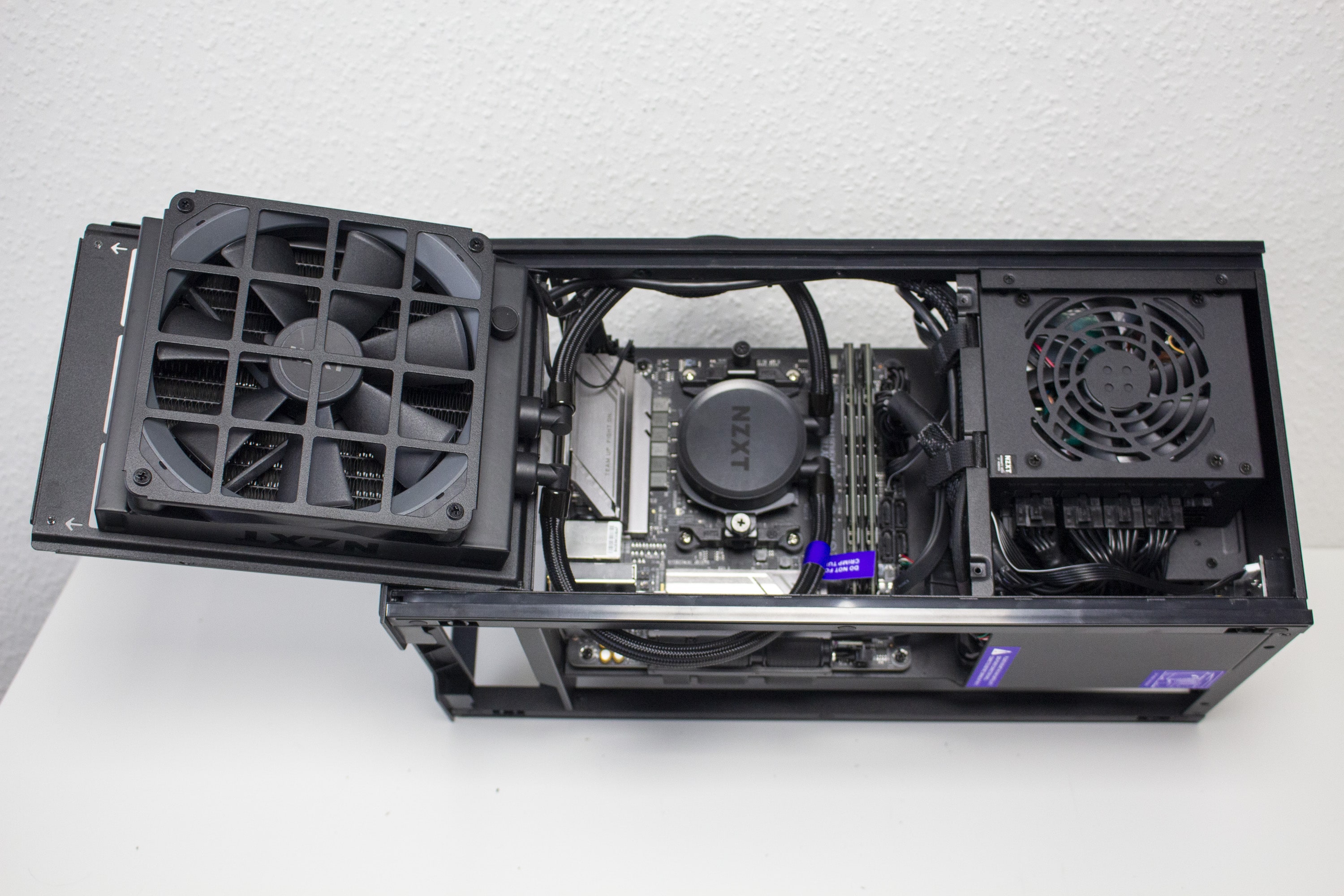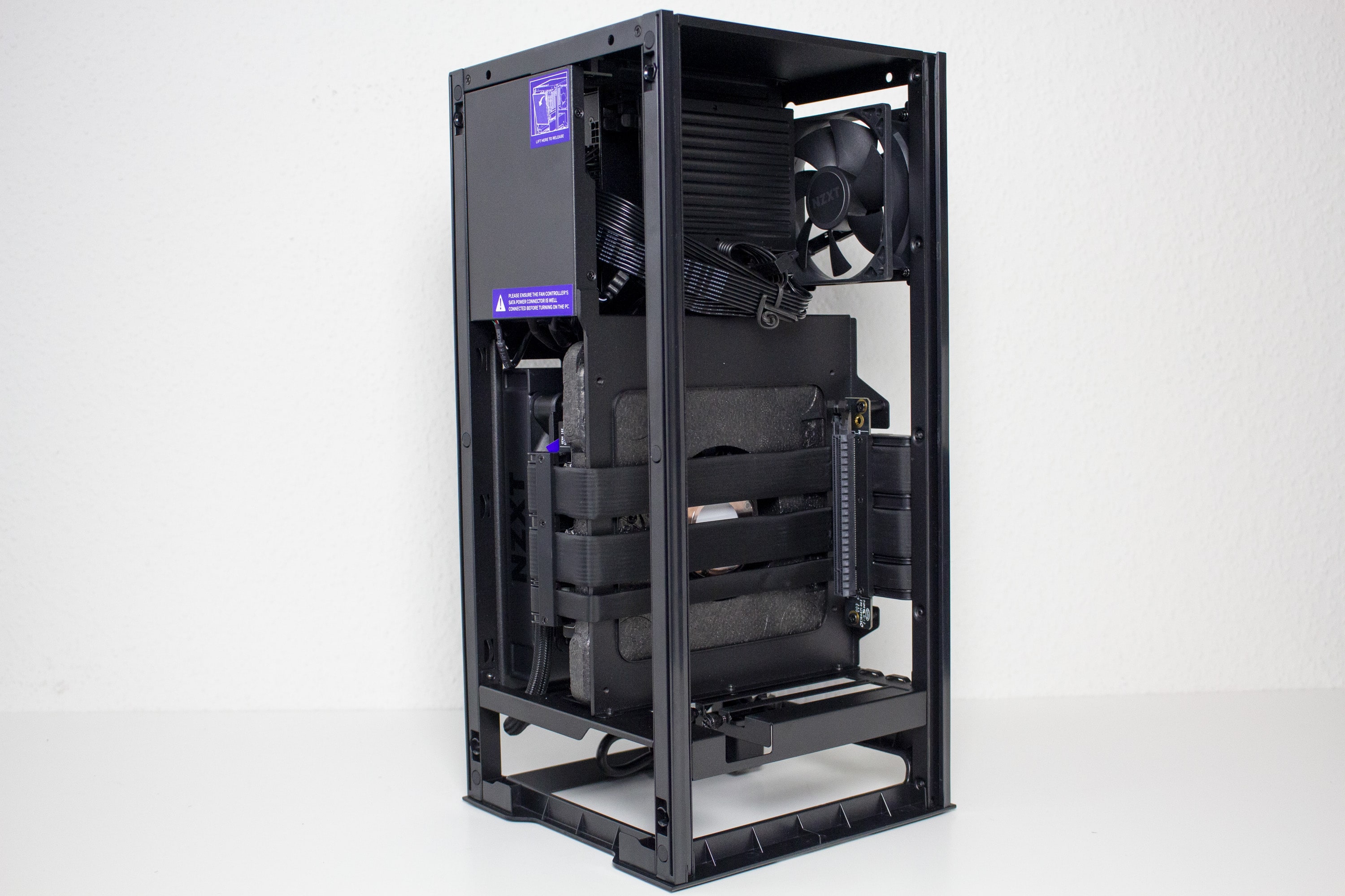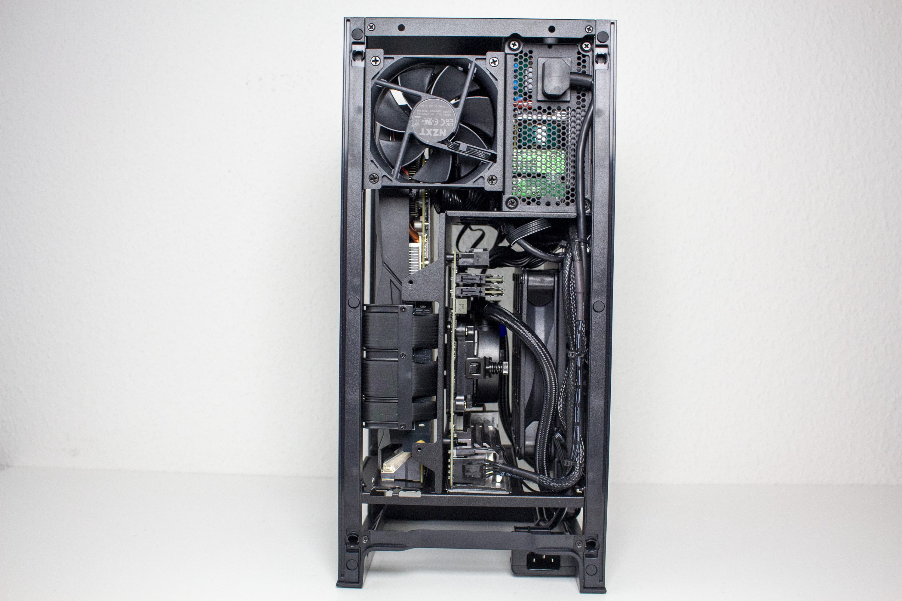 Der Innenraum des H1 v2 unterteilt sich grundsätzlich in zwei Kammern und setzt auf ein Sandwich-Layout. Die linke Kammer bietet Platz für das Mainboard, die vorinstallierte AiO-Wasserkühlung und beherbergt außerdem das vorinstallierte Netzteil. Die Hauptplatine wird hier so platziert, dass die externen Anschlüsse nach unten ausgerichtet sind. Die rechte Kammer ist deutlich leerer und bietet Platz für große Grafikkarten. Das dafür notwendige Riser-Kabel wurde zwischen dem Mainboard-Tray und der GPU verlegt. Anders als bei der ersten Version, spendiert NZXT dem H1 v2 im oberen Bereich der GPU-Kammer des Weiteren noch einen 92-Millimeter-Lüfter. Dieser soll vermutlich einen Hitzestau im Deckel verhindern.