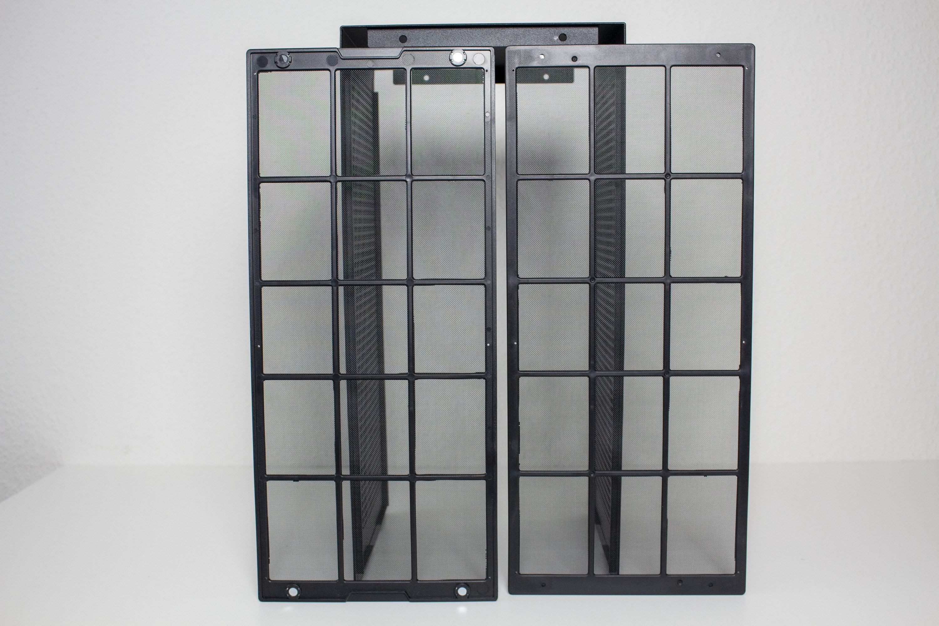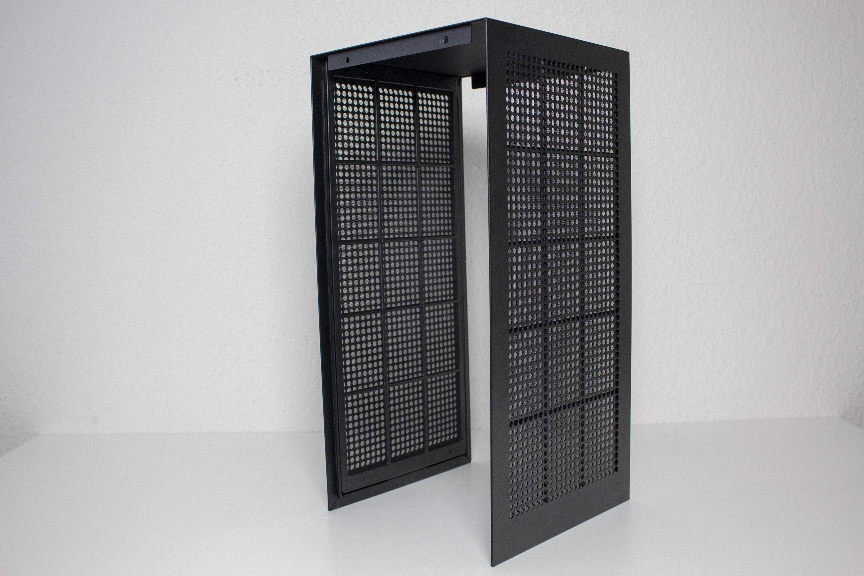 Die Seitenteile und der Deckel sind ein großes Stahlelement und lassen sich erst entfernen, wenn man Front und Rückseite demontiert hat. Beide Sidepanels verfügen über quadratische Lüfteröffnungen und sollten damit einen guten Airflow im Innenraum gewährleisten können. Um zusätzlich einen Schutz vor Staub zu erhalten, befindet sich auf den Innenseiten der Panels jeweils ein magnetischer Staubfilter. Die Demontage aller äußeren Panels erfordert kein Werkzeug oder Schrauben.