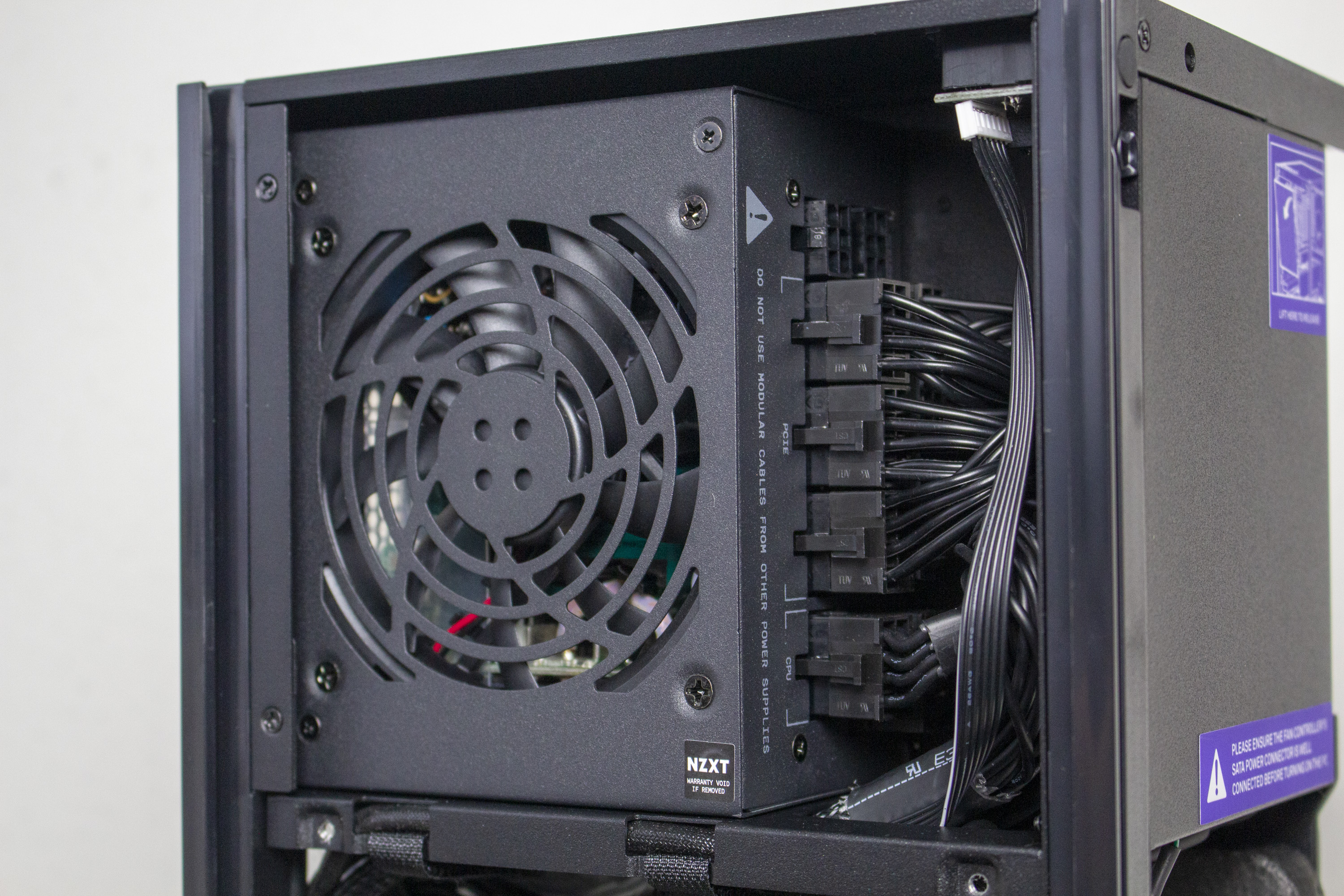 Auch beim H1 v2 stattet NZXT das SFF-Case mit einem vorinstalliertem Netzteil sowie einer AiO-Wasserkühlung mit 140-Millimeter-Radiator aus. Die PSU verfügt über eine Ausgangleistung von 750W und kann eine 80 Plus Gold Zertifizierung vorweisen. Folgende modularen Anschlüsse gibt es: 1x 24Pin-ATX, 1x 8Pin-12V-EPS, 3x 8+2Pin-PCIe, 3x SATA. Das ATX- sowie das EPS-Kabel wurden in der Fabrik bereits sauber vorverlegt und sinnvoll platziert. Radiator und Lüfter der Wasserkühlung wurden an einem Gitter befestigt, welches nach dem Lösen von zwei Schrauben nach unten geklappt werden kann. Die Schrauben verbleiben dabei am Rahmen und können somit nicht verloren gehen.