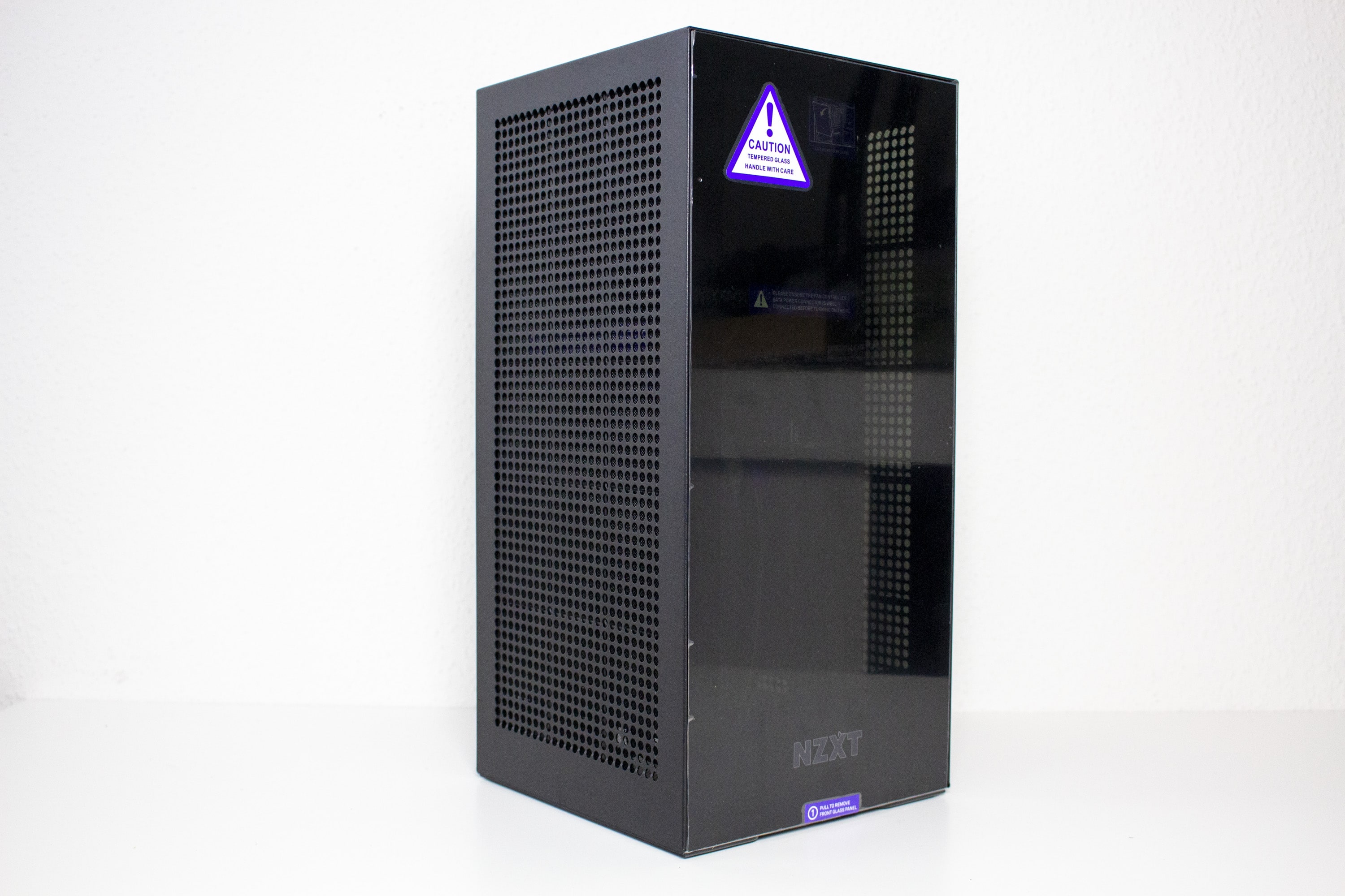 Rein äußerlich gibt es bei der zweiten Version des NZXT H1 keine großen Unterschiede. Betrachtet man allerdings die technischen Daten, dann fällt schnell auf, dass das neue H1 etwas größer ist. Sowohl bei der Grundfläche als auch bei der Höhe hat NZXT etwas draufgepackt. Ansonsten hat sich äußerlich nicht viel verändert. Die Front besteht weiterhin aus getöntem Tempered Glass und kann, durch einen kräftigen Ruck im unteren Bereich, vom Korpus gelöst werden. Dadurch wird der Blick auf die zwei Kammern für Mainboard und GPU frei. Das Fenster selbst verfügt zudem über einen schwarzen Rahmen und einen Aufdruck mit dem Hersteller-Logo.