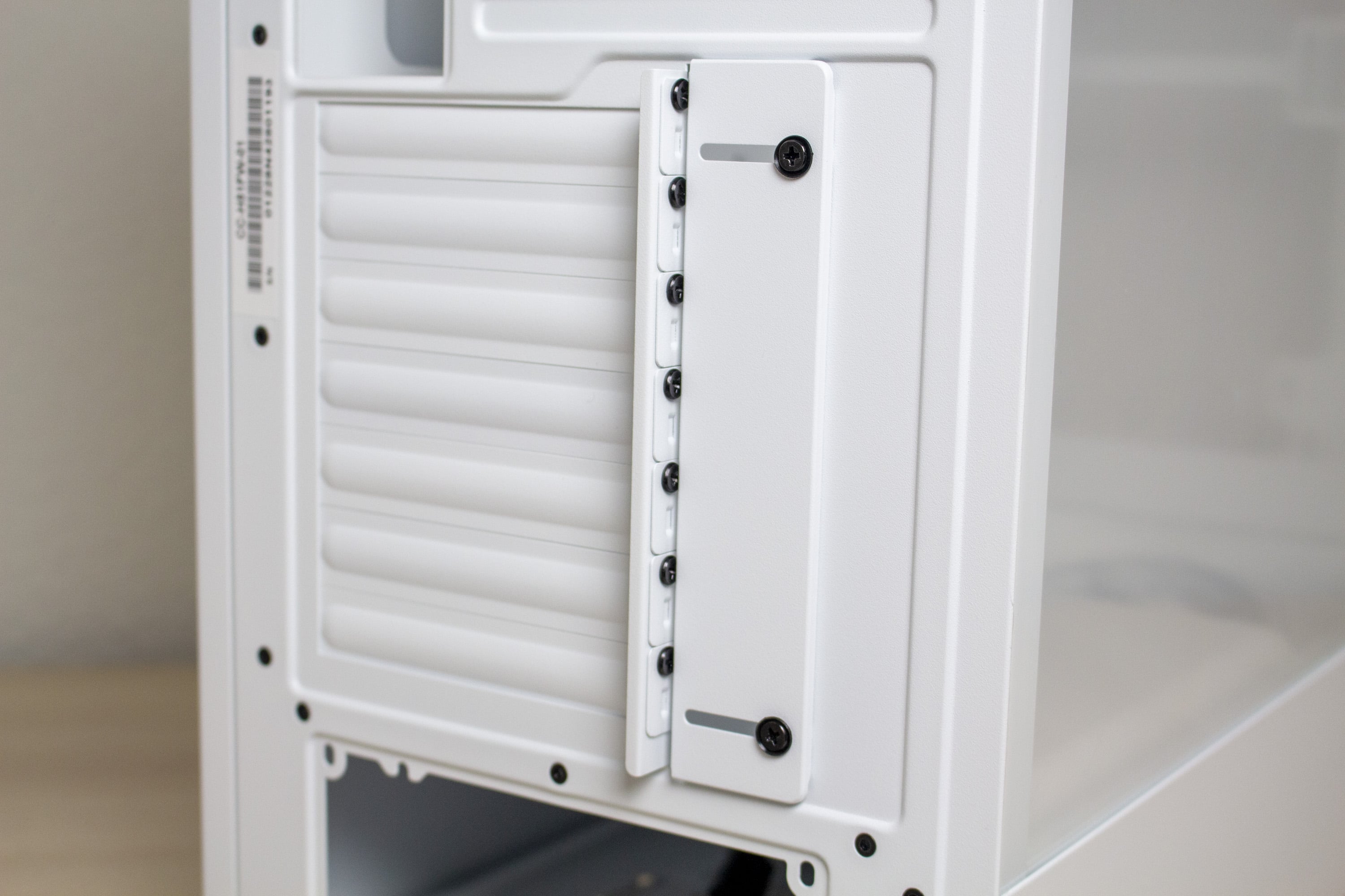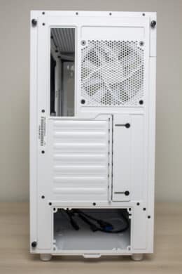 An der Rückseite zeigt sich ein typisches Erscheinungsbild für einen modernen Midi-Tower. Das Netzteil wird unten positioniert und darüber lassen sich 7 wiederverwendbare PCI-Slotblenden ohne Perforation erkennen. Im oberen Bereich ist zuletzt noch der vorinstallierte 120-mm-Lüfter zu finden. An dieser Stelle ist noch anzumerken, dass oberhalb des Lüfters etwas mehr Platz vorhanden ist. Das könnte bei der Montage von Radiatoren im Deckel hilfreich sein.