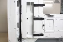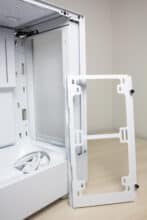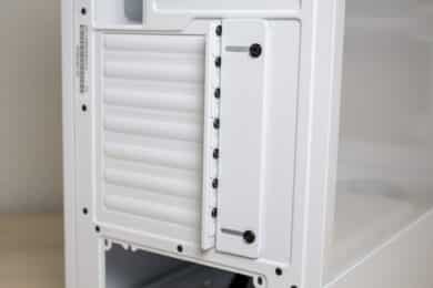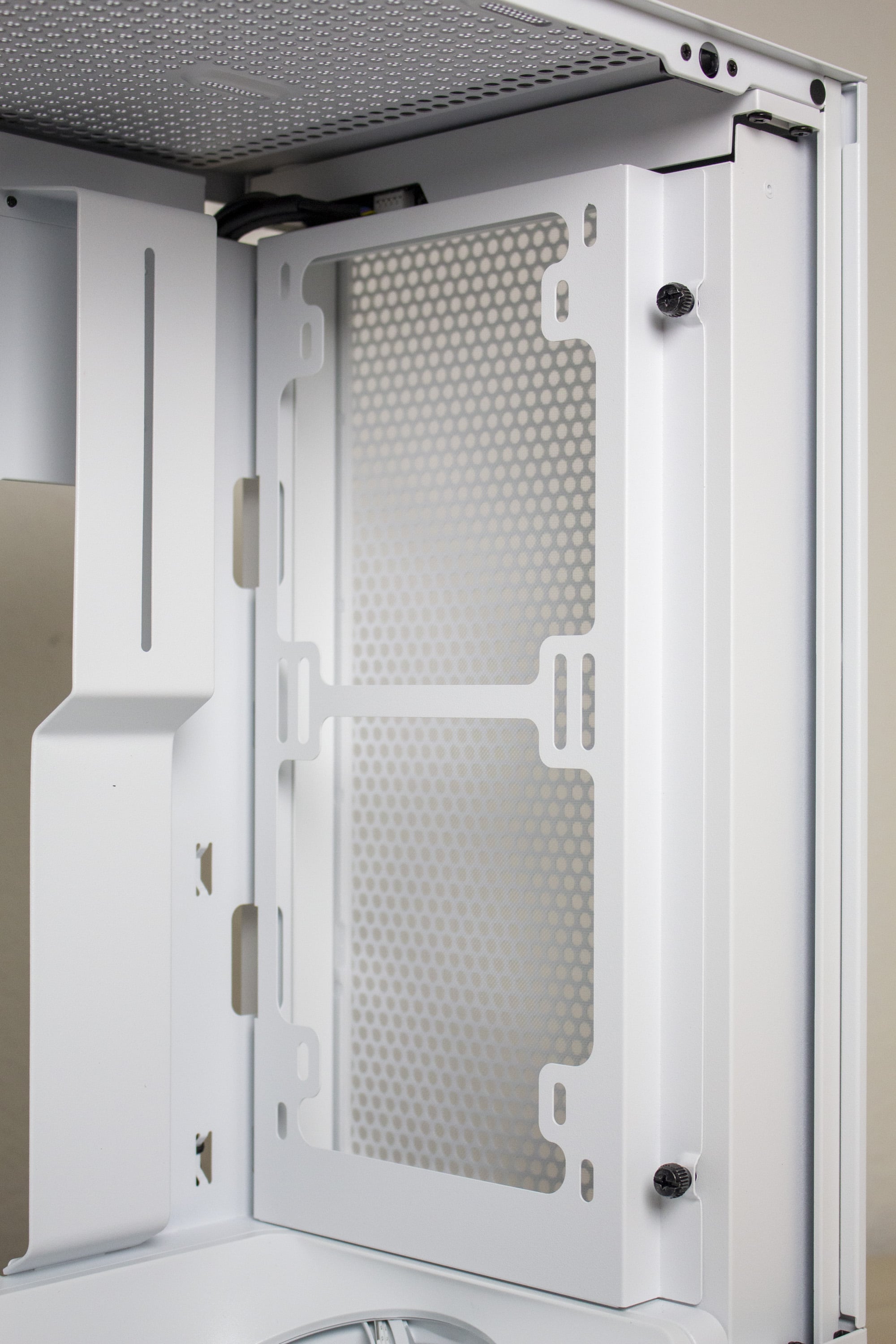 Das linke Seitenteil des H5 Flow besteht aus Hartglas, welches auf einen Stahlrahmen geklebt wurde. Die Befestigung am Korpus erfolgt über Push-Pins sowie eine Rändelschraube an der Rückseite. Ähnlich wie das Frontpanel überspannt auch das Seitenfenster nicht die gesamte Seite. So ist das untere Viertel Teil der Netzteilkammer und besteht aus Stahl. Aus Stahl wurde ebenfalls das rechte Seitenteil gefertigt und verfügt zusätzlich über zwei Rändelschrauben, die am Panel verbleiben. Bedenkt man den Kaufpreis des H5 Flow, ist die Stärke des Seitenteils aber etwas enttäuschend.