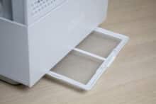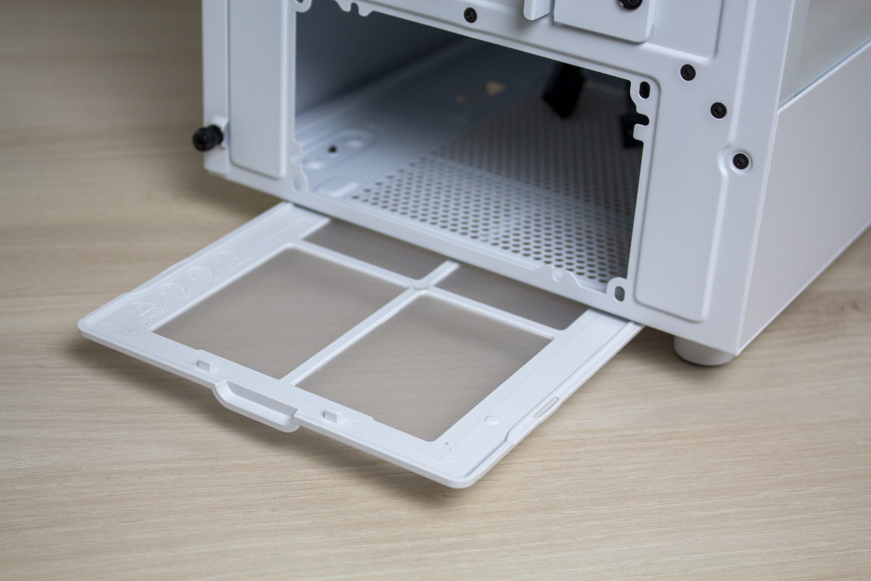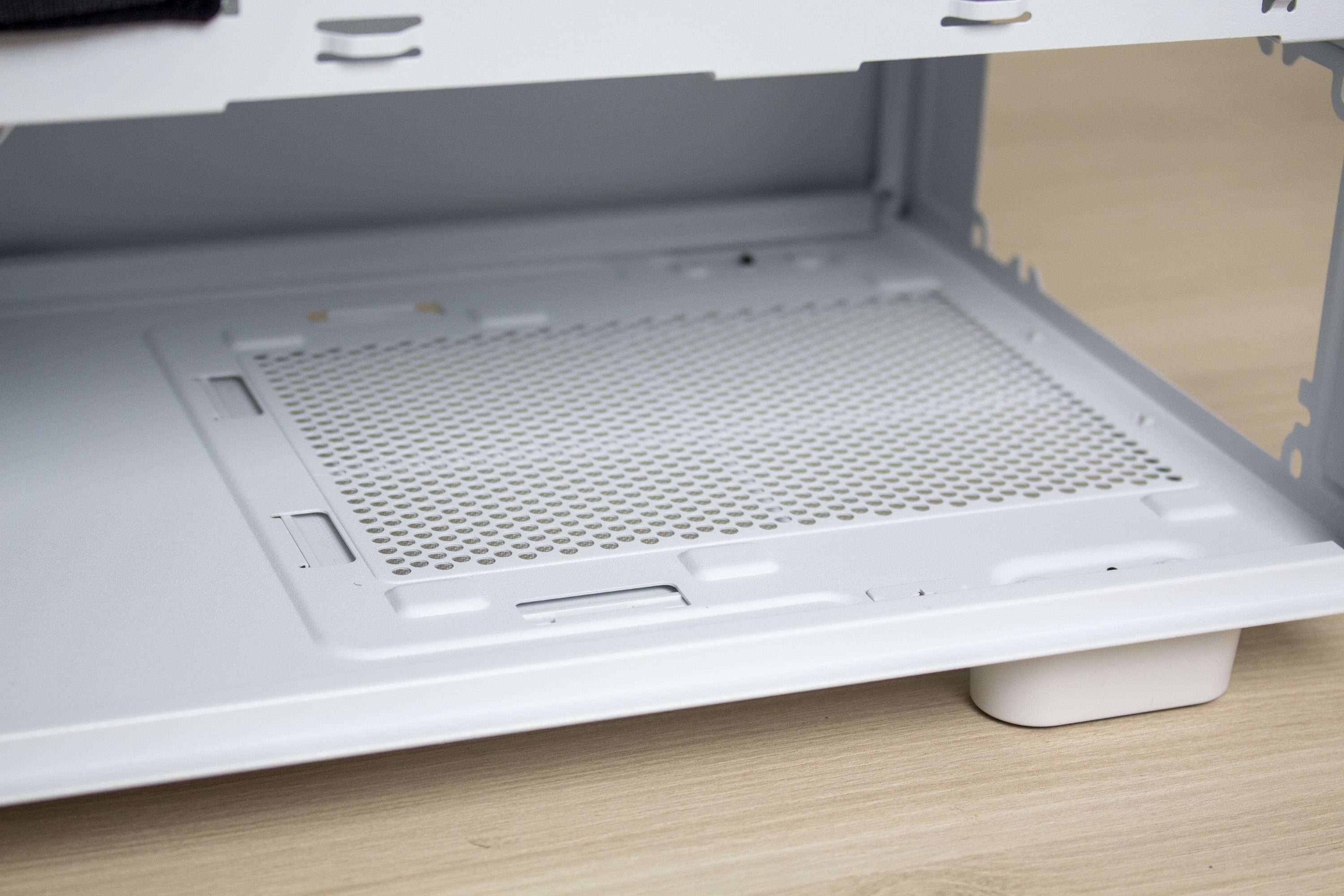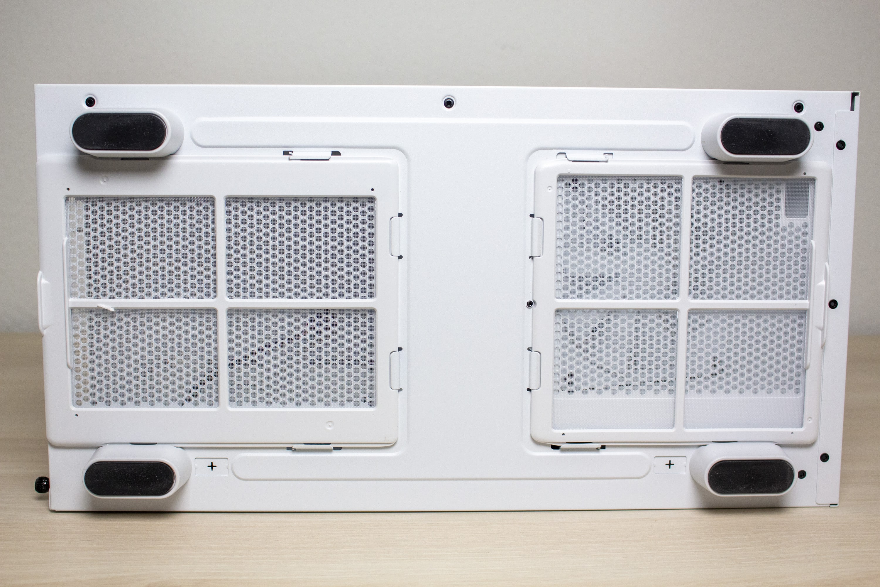 Die Unterseite zeichnet sich durch zwei einfach entfernbare Staubfilter mit Kunststoffrahmen aus. Diese filtern die Luft für das Netzteil sowie für den speziell positionieren Frontlüfter. Einen sicheren Stand erhält der Midi-Tower über vier stabile Füße aus Kunststoff, die zusätzlich mit einer Schicht Gummi beklebt wurden.