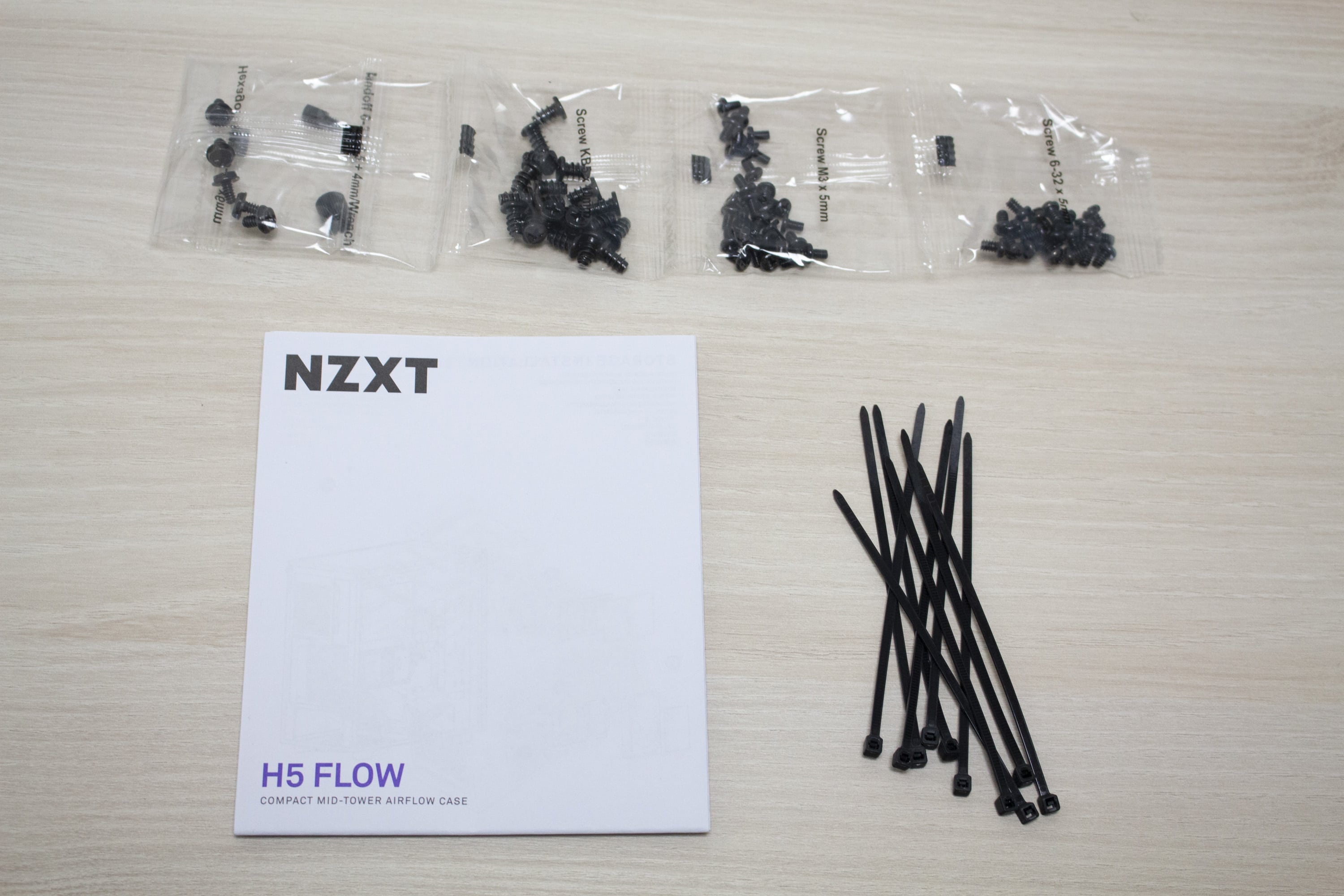 Das Zubehör verstaut NZXT in kleinen Schachtel aus Pappe, die auf der Rückseite des Mainboard-Trays befestigt wurde. Zum Zubehör gehören alle wichtigen Montageschrauben, 10 schwarze Kabelbinder und eine ausführliche Montageanleitung. Weiterhin liegen dem Midi-Tower zwei vorinstallierte Gehäuselüfter sowie vier vorinstallierte Staubfilter bei.