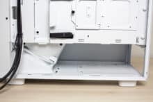 Ein Blick hinter das Mainboard-Tray bzw. unter die Netzteilabdeckung offenbart schnell, dass es hier angenehm viel Platz für Kabel gibt. Außerdem hat NZXT dem H5 Flow vier wiederverwendbare Kabelmanagementstreifen spendiert. Zudem wurden überall Ösen für normale Kabelbinder positioniert. Etwas schwierig wird es aufgrund des Frontlüfter aber mit Netzteilen, die länger als 160 Millimeter sind. Apropos Netzteil, dieses wird logischerweise unter der Netzteilabdeckung verbaut und auf mehreren Stahlnasen ohne Entkopplung gelagert.