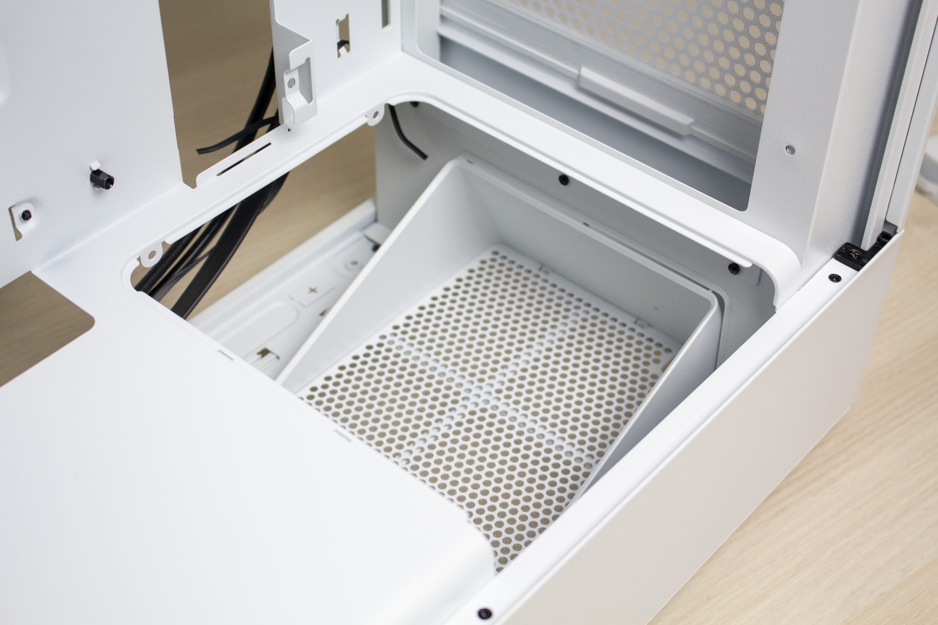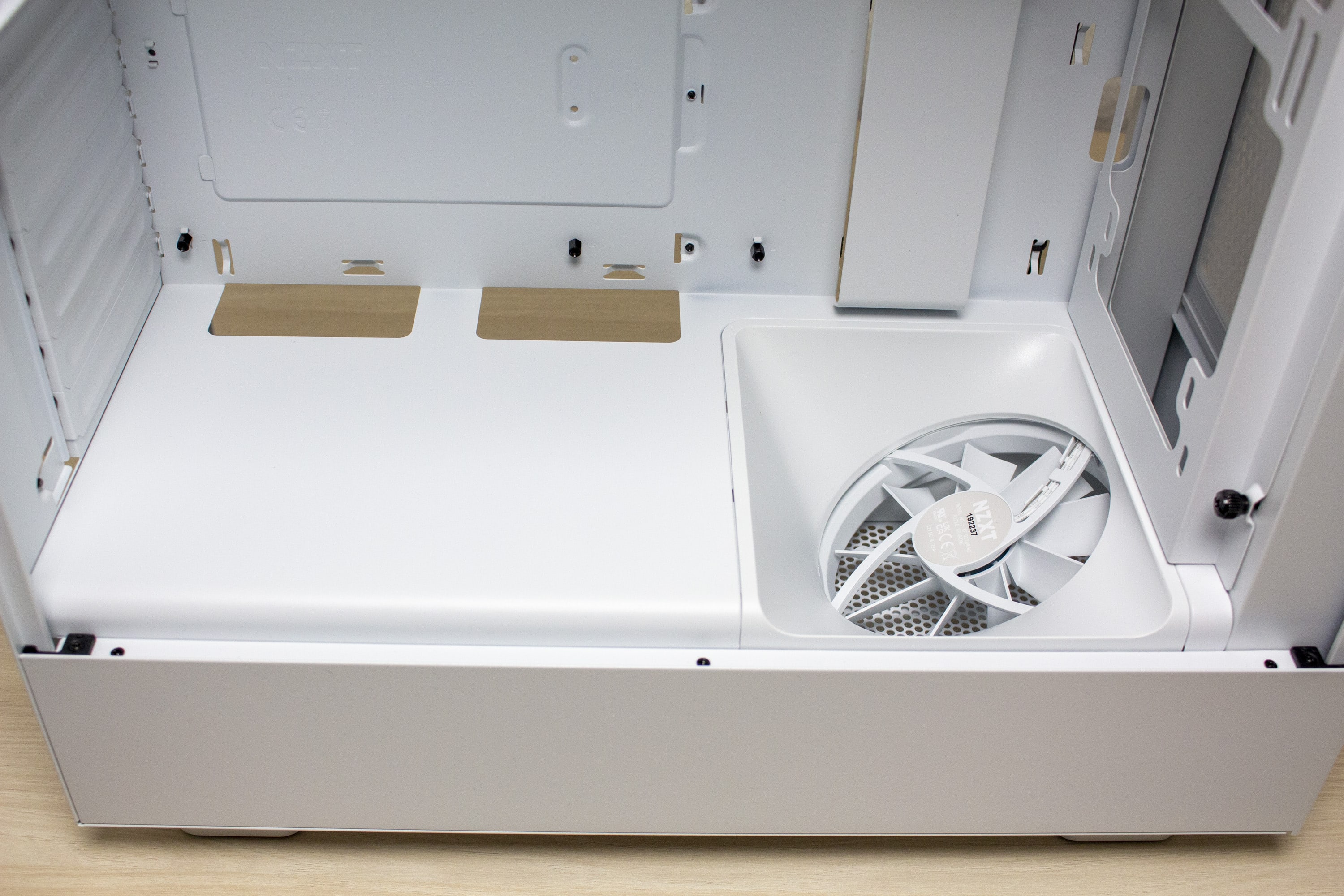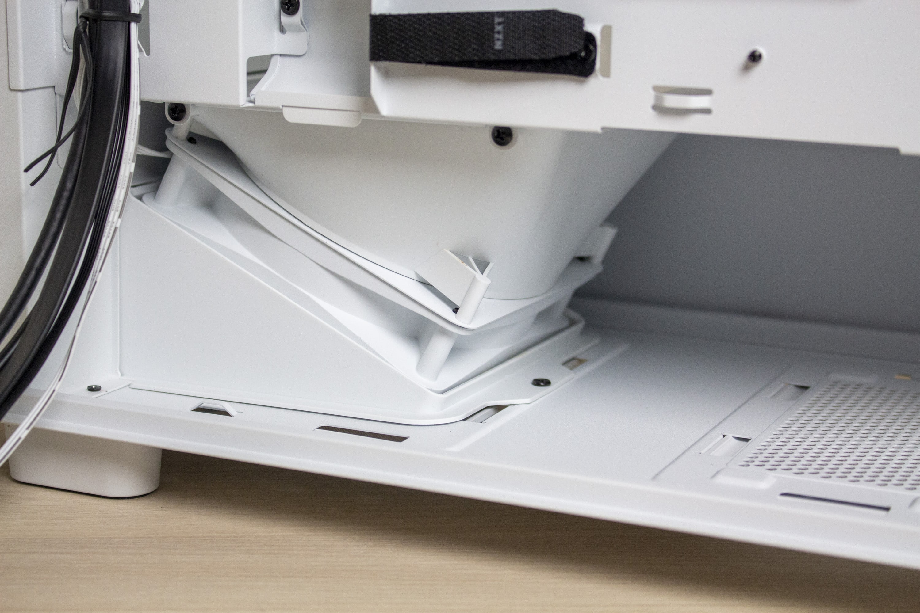 Besonders interessant wird es beim NZXT H5 Flow aber im unteren Bereich. Neben der üblichen Netzteilabdeckung, welche aus Stahl besteht und mit zwei Kabelmanagementöffnungen versehen wurde, lässt sich im vorderen Bereich ein speziell gestaltetes Kunststoffelement erkennen, in dem ein Lüfter verbaut wurde. Dieser saugt von unten gefilterte Luft an und bläst diese direkt auf die Grafikkarte. Was dieser Lüfter bringt, erfahrt ihr im nächsten Kapitel. An dieser Stelle ist außerdem anzumerken, dass durch den speziell positionierten Lüfter kein 360-mm-Radiator in der Front verbaut werden kann.