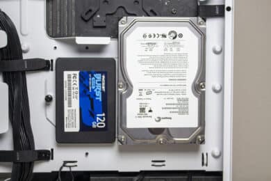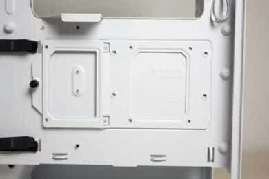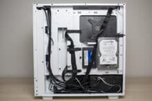 Möchte man im H5 Flow Datenträger montieren, dann muss man sich mit etwas weniger zufrieden geben. Das H5 Flow unterstützt lediglich zwei 2,5″- oder einen 3,5″- und einen 2,5″-Datenträger auf der Rückseite des Mainboard-Trays. Der dafür vorgesehene Schlitten besteht aus Stahl und kann werkzeuglos über einen einzelne Rändelschraube befestigt werden. Die Montage der Datenträger am Rahmen erfordert wiederum die Verwendung von herkömmlichen Schrauben. Eine Entkopplung findet nicht statt.