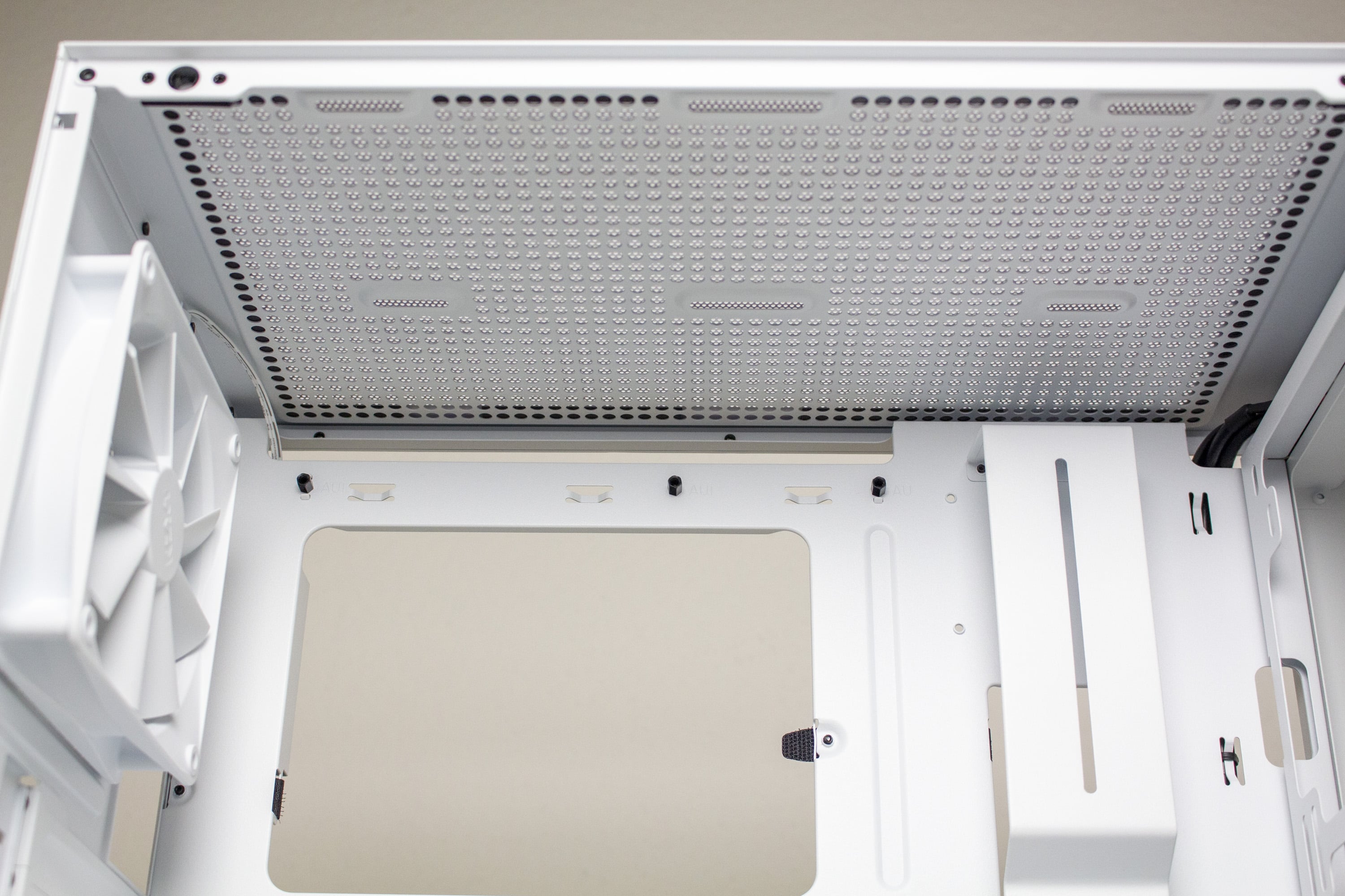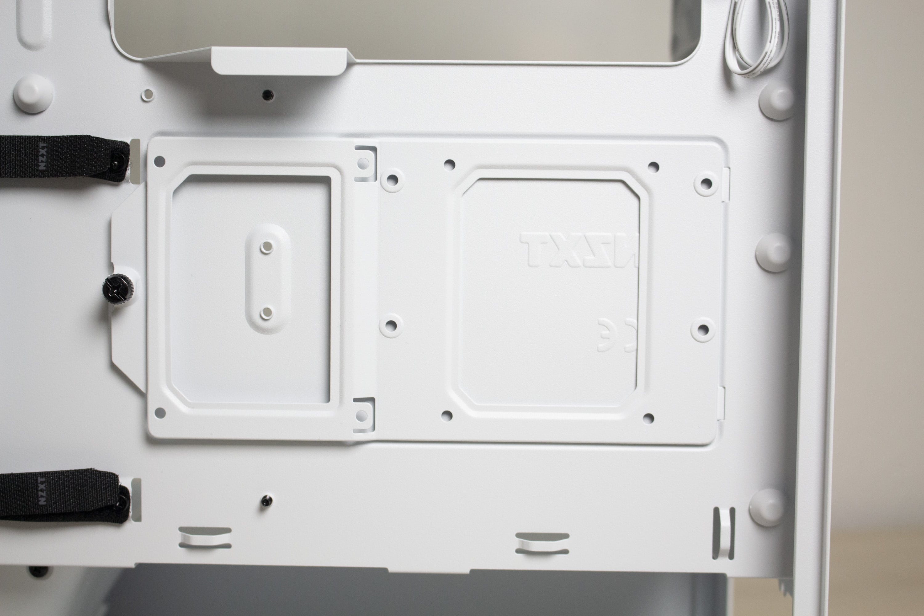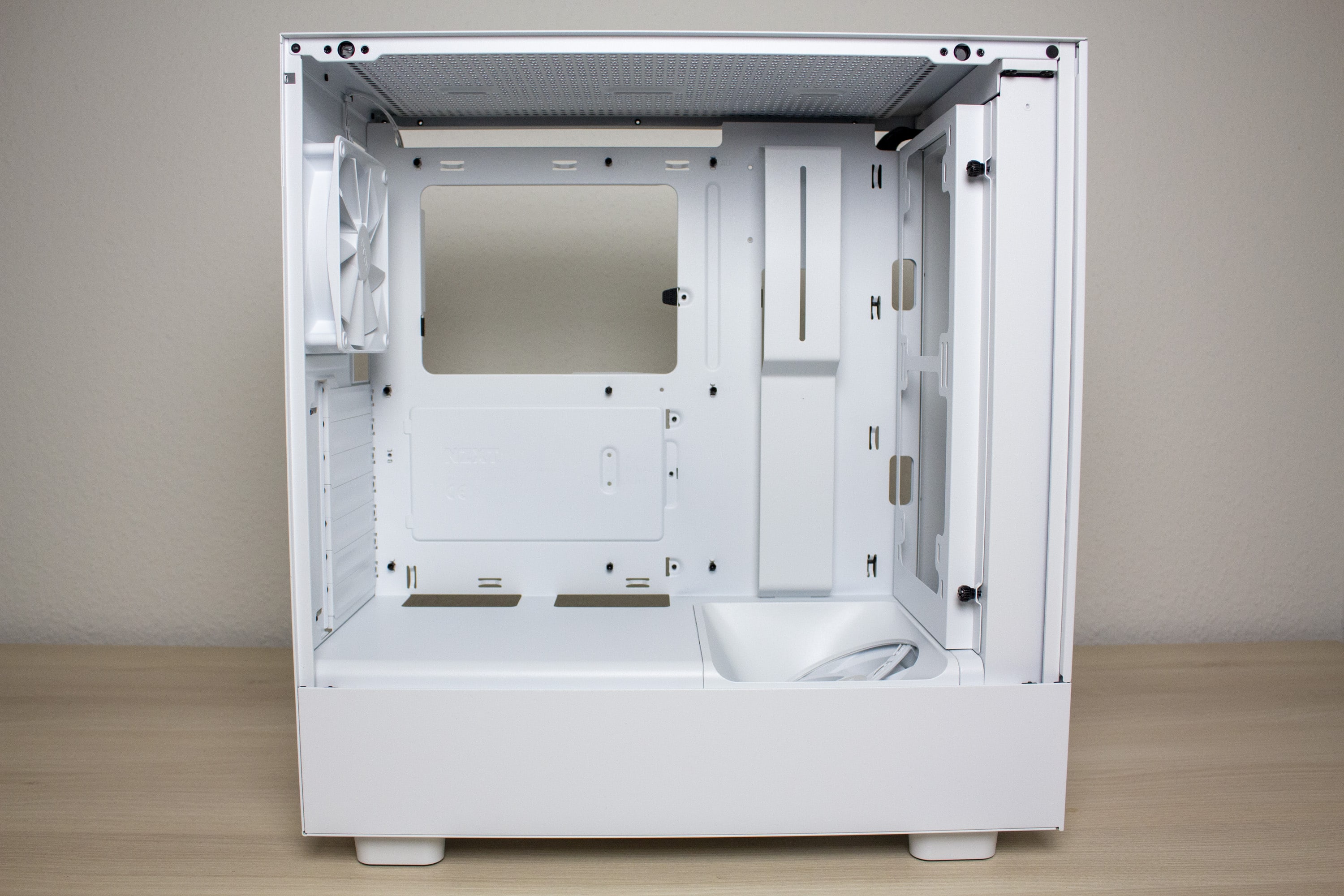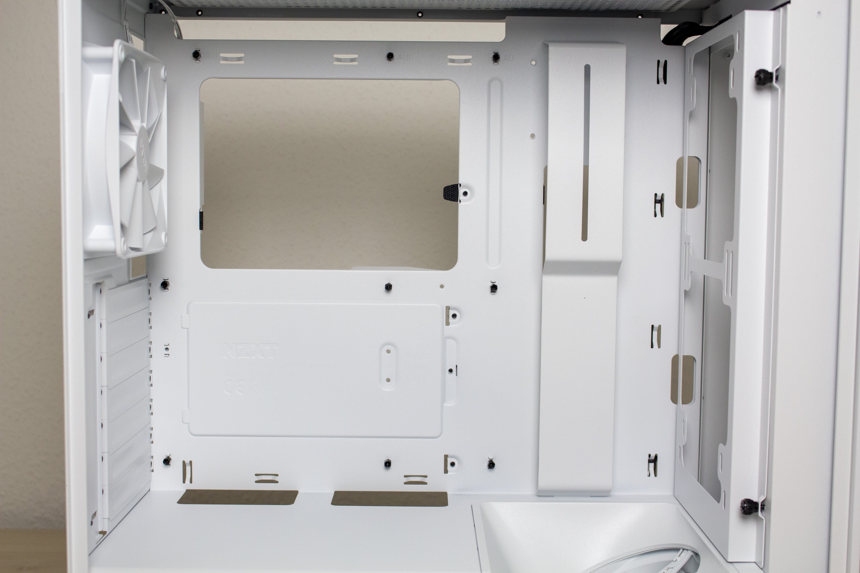 Beim Innenraum bleibt sich NZXT treu und lässt vieles beim Alten. So besteht der Innenraum aus grundsätzlich zwei Kammern, die durch eine Netzteilabdeckung getrennt werden. Der Innenraum ist sehr offen und wenig restriktiv gestaltet. Das Mainboard-Tray ist überwiegend plan und verfügt über zwei große Kabelmanagementöffnungen. Die vertikale Öffnung neben dem Mainboard wird von einer, für NZXT-Gehäuse typische, Abdeckung verdeckt. An der Vorderseite verbaut NZXT einen modularen Montagerahmen, der durch zwei Rändelschrauben befestigt ist und die grundsätzliche Montage von Radiatoren sehr vereinfachen dürfte.