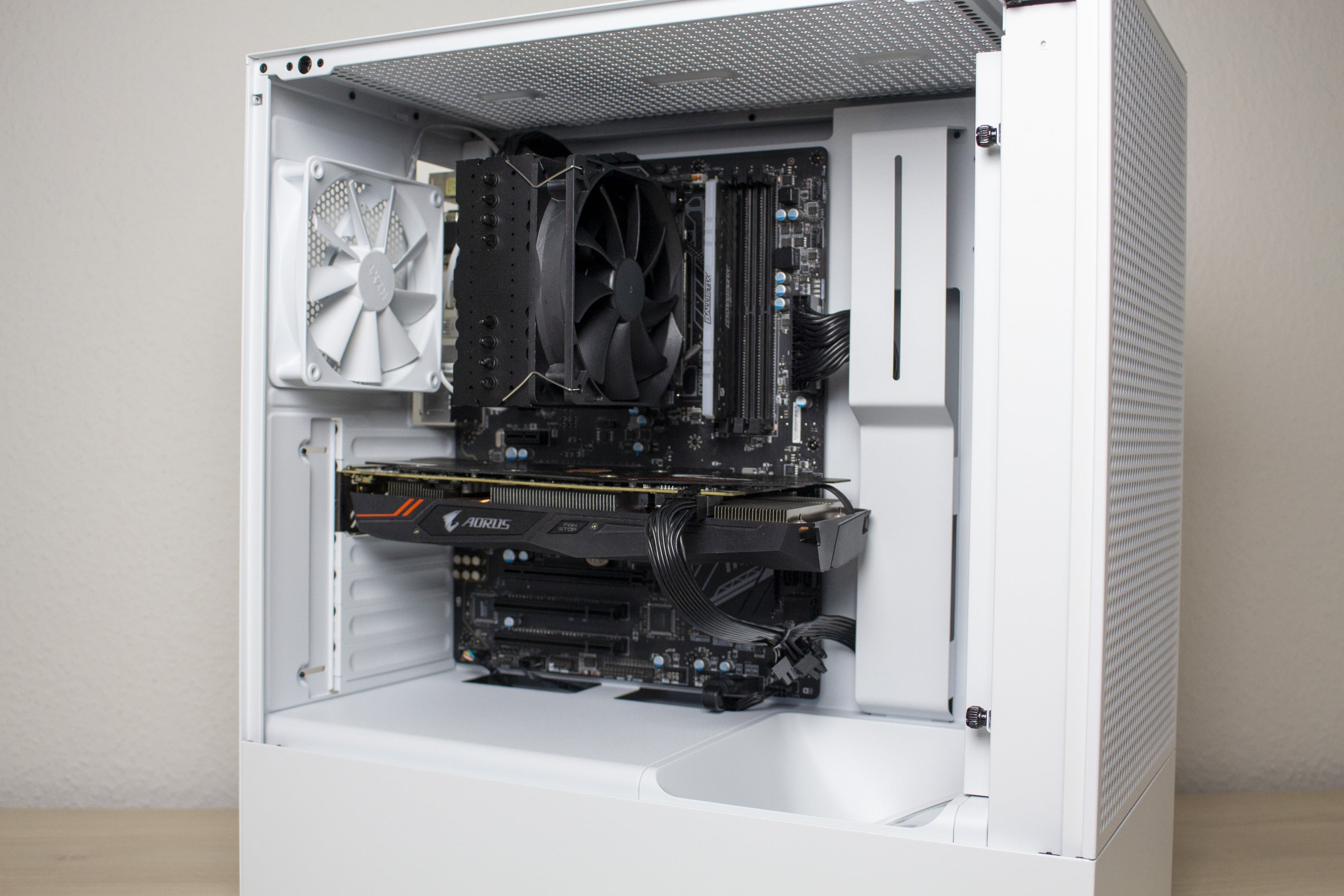 Nun kommen wir zum Systemeinbau beim NZXT H5 Flow Test. Als Hardware verwenden wir einen AMD Ryzen 5 1400 auf einem MSI B350 PC Mate mit 16GB Crucial Ballistix Sport LT grau DDR4-2666. Der Ryzen wird von einem LC-Power Cosmo Cool LC-CC-120-RGB gekühlt und ist auf 3,8 GHz (1,25 V) übertaktet. Für die Bildausgabe ist eine GTX 1060 6GB von Gigabyte AORUS zuständig. Die Stromversorgung erledigt das vollmodulare LC-Power LC550 V2.31 Platinum mit einem Effizienzgrad von 80 Plus Platinum.