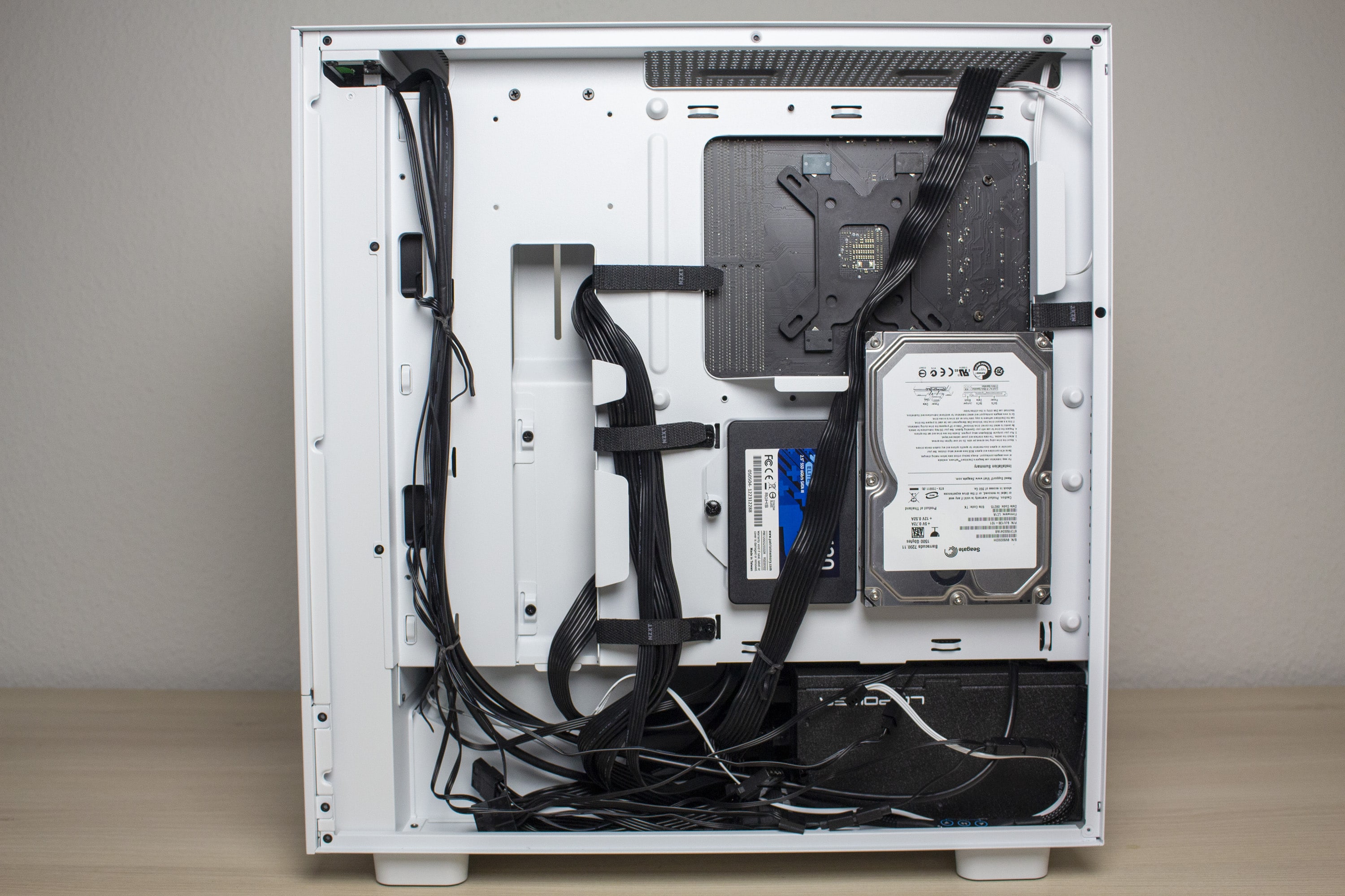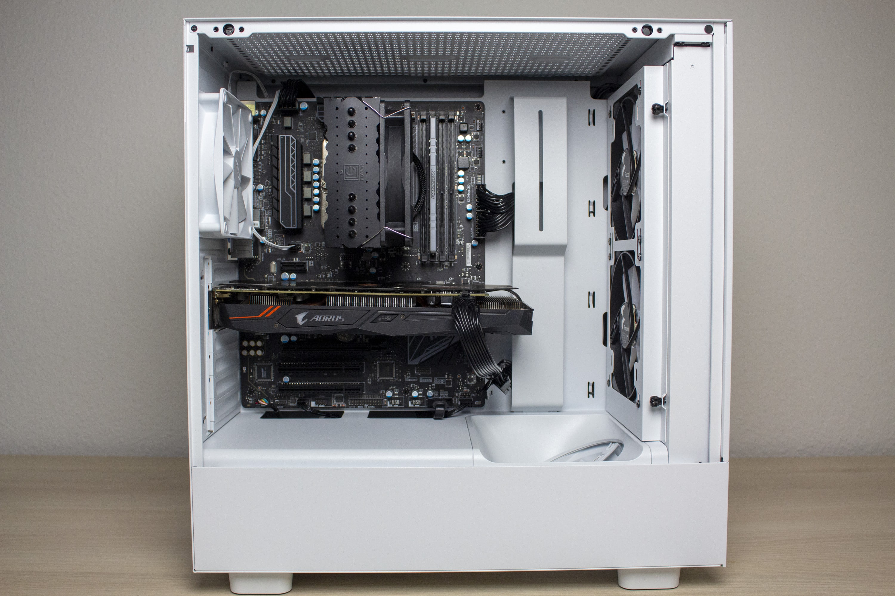 Der Einbau aller Komponenten war, wie für NZXT-Gehäuse gewohnt sind, sehr einfach und schnell abgeschlossen. Die vorinstallierten Abstandshalter sparen Zeit und es gibt reichlich Platz zum Arbeiten. Ebenfalls ausgezeichnet ist das Kabelmanagement-System, welches im H5 Flow verbaut wurde. Die vier wiederverwendbaren Klettstreifen sind sehr praktisch und es gibt zahlreiche Ösen und Kabelkanäle. Etwas unpraktisch kann aber die Abdeckung auf der Vorderseite sein. Je nachdem wie störrisch die Netzteilkabel sind, könnte sich die Metallplatte als gewisses Hindernis erweisen. Dennoch ist es uns gelungen im NZXT H5 Flow ein ordentliches System zu bauen.