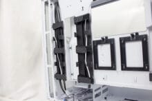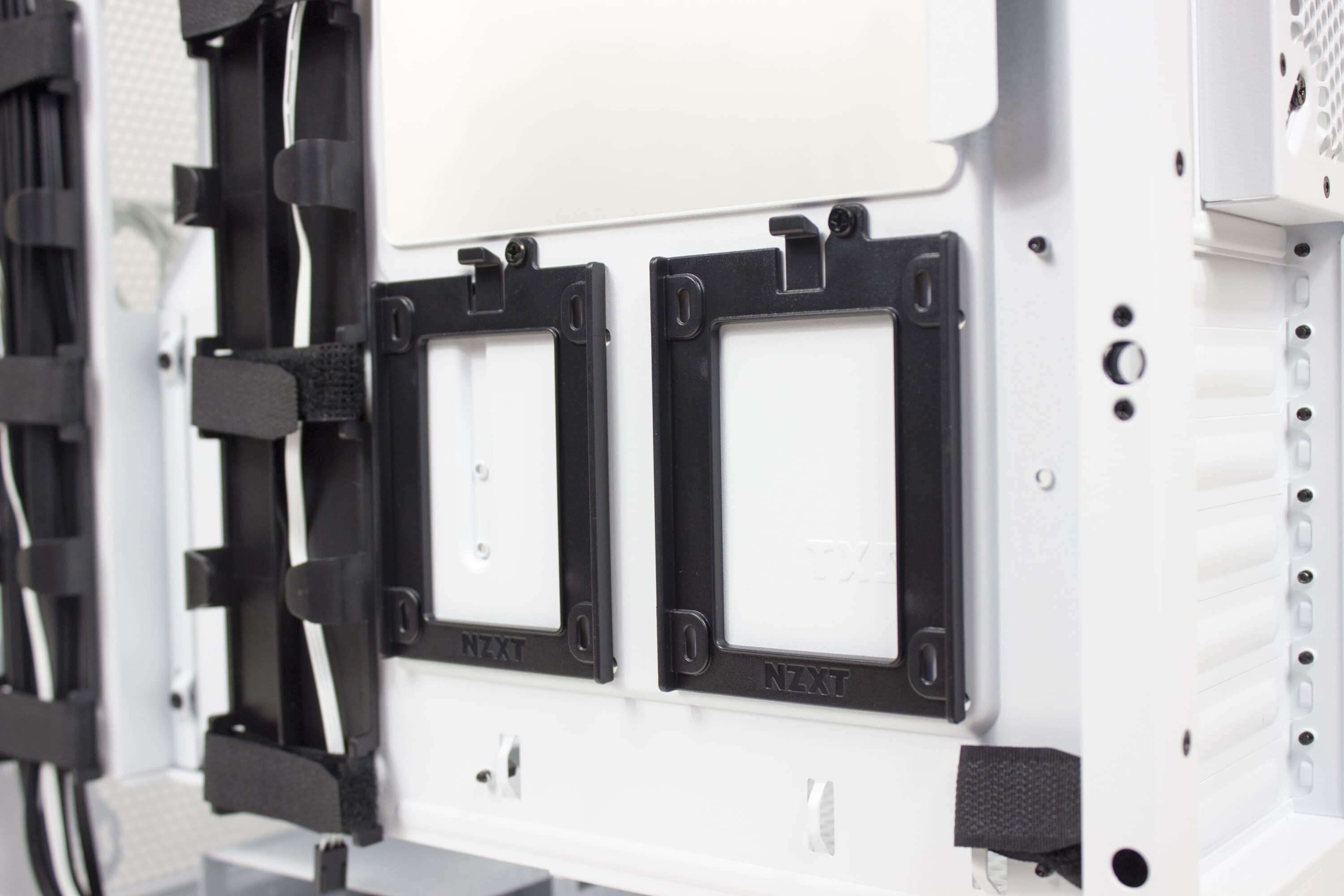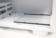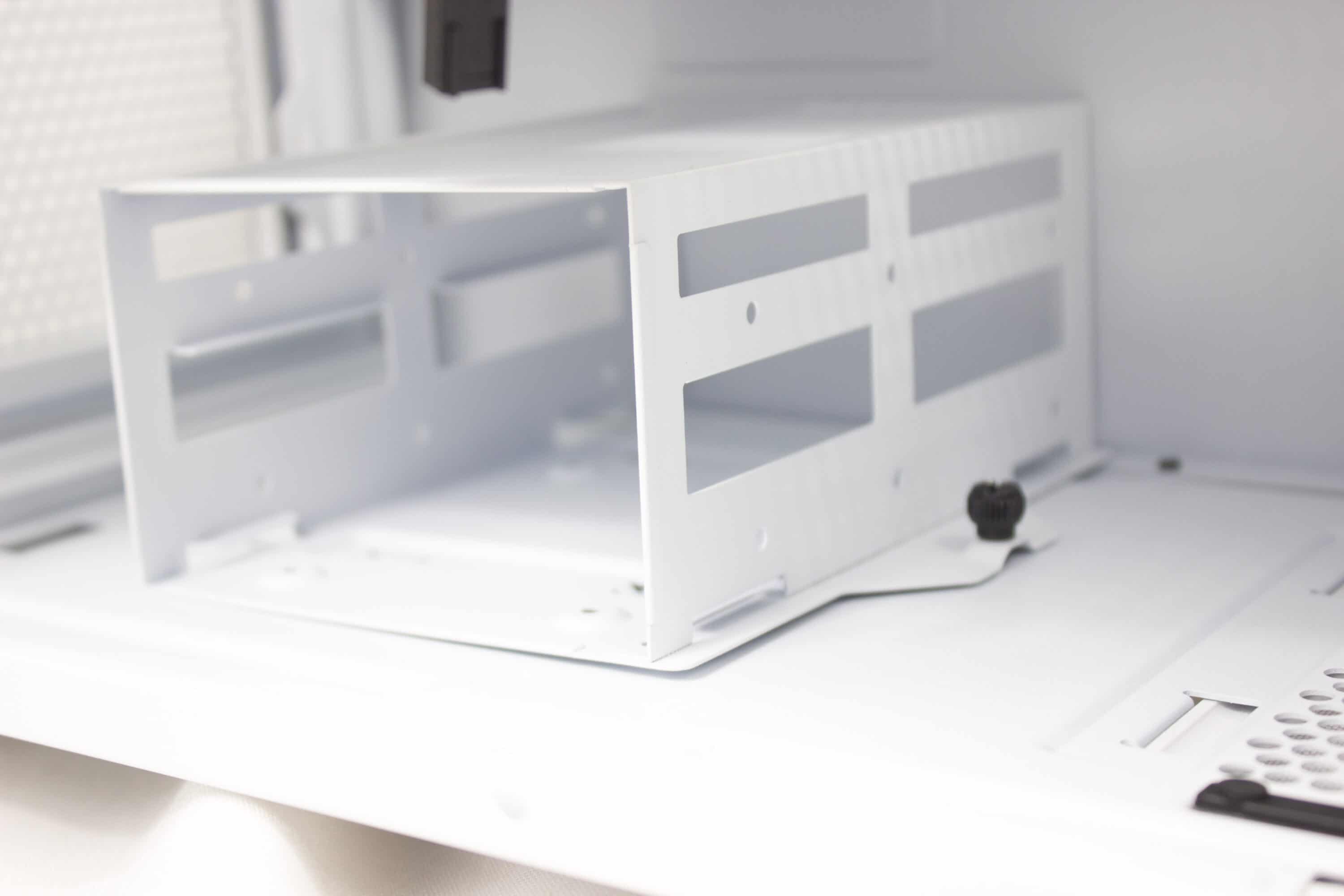 Weiterhin ist der Innenraum in zwei Kammern aufgeteilt, um noch mehr Ordnung zu schaffen und das Netzteil zu verstecken. In diesem Fall befindet sich die zweite Kammer direkt unter dem Mainboard-Tray. Dort finden wir auch den Festplattenkäfig für die zwei installierbaren 3,5-Zoll-Datenträger. Hinter dem Mainboard-Try verbergen sich dann noch die zwei Halter für 2,5-Zoll-Datenträger.