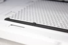 Das I/O-Panel sitzt im vorderen Bereich auf der Oberseite. Vorhanden sind zwei USB-3.2 Typ-A-Anschlüsse, sowie ein Typ-C. Einen kombinierten Audio-Anschluss finden wir dort auch. Zu guter Letzt finden wir auch den Power-Button mit seiner weißen Beleuchtung. Neben dem I/O-Panel finden wir auf der Oberseite aus der perforierten Fläche nichts mehr vor. Direkt dahinter finden wir die perforierte Oberfläche inklusive dem darunterliegenden Staubfilter.
