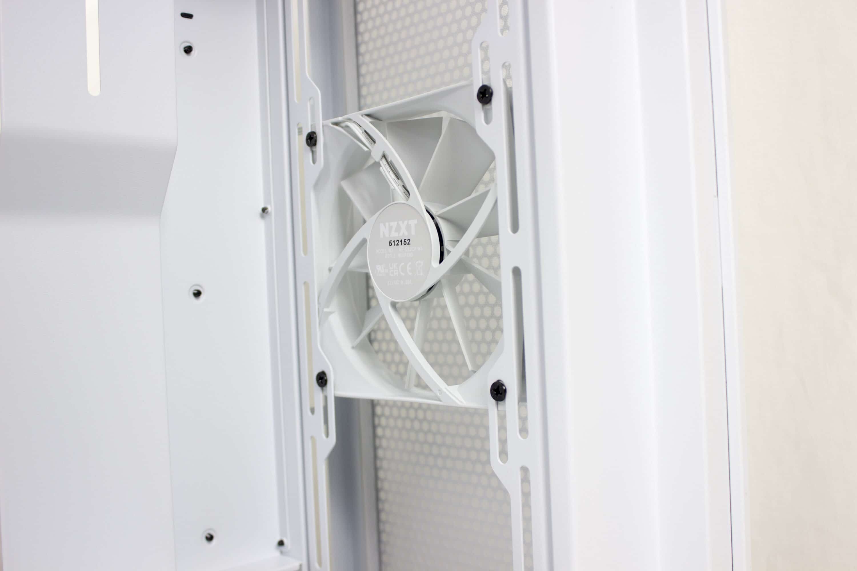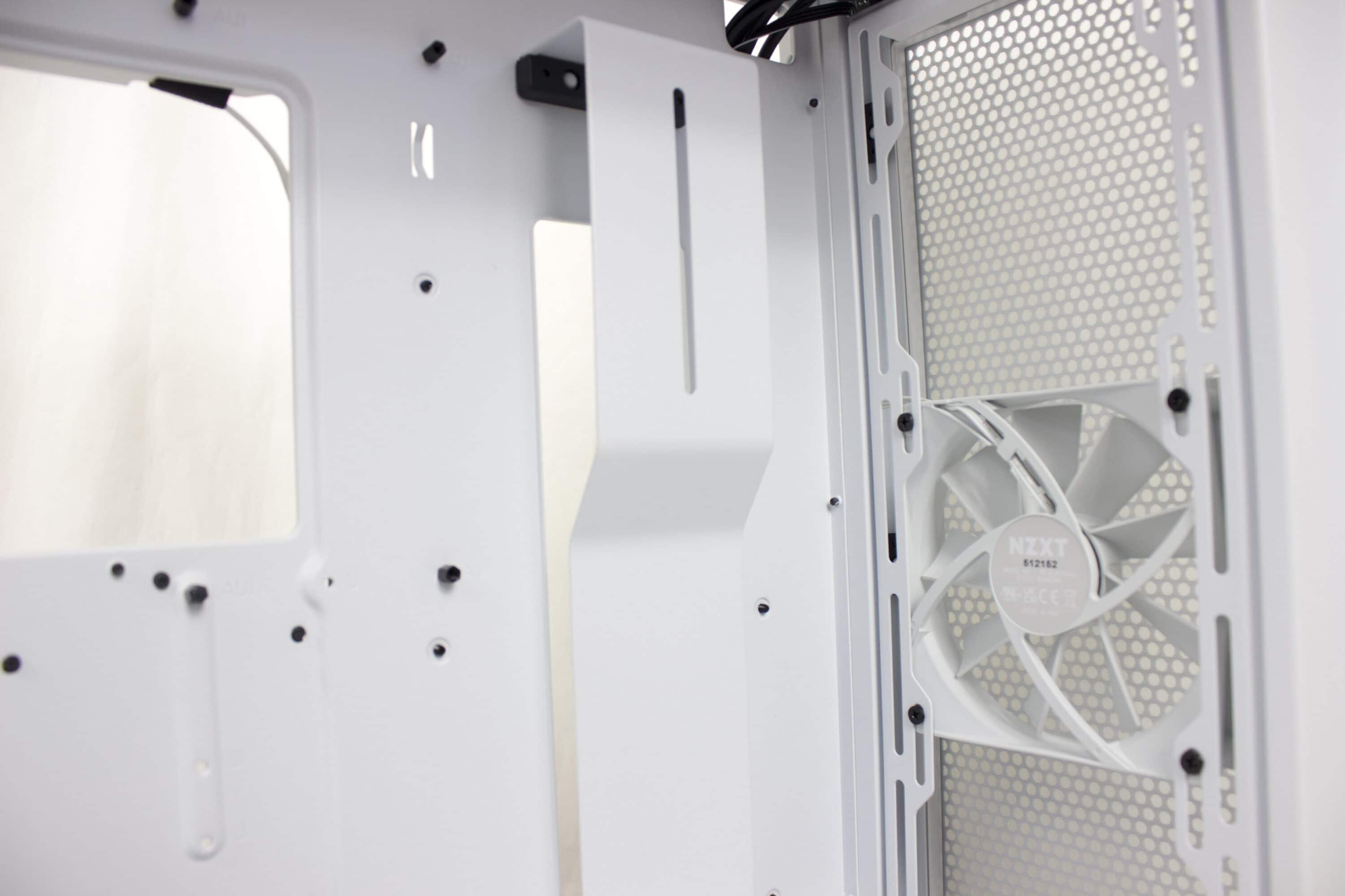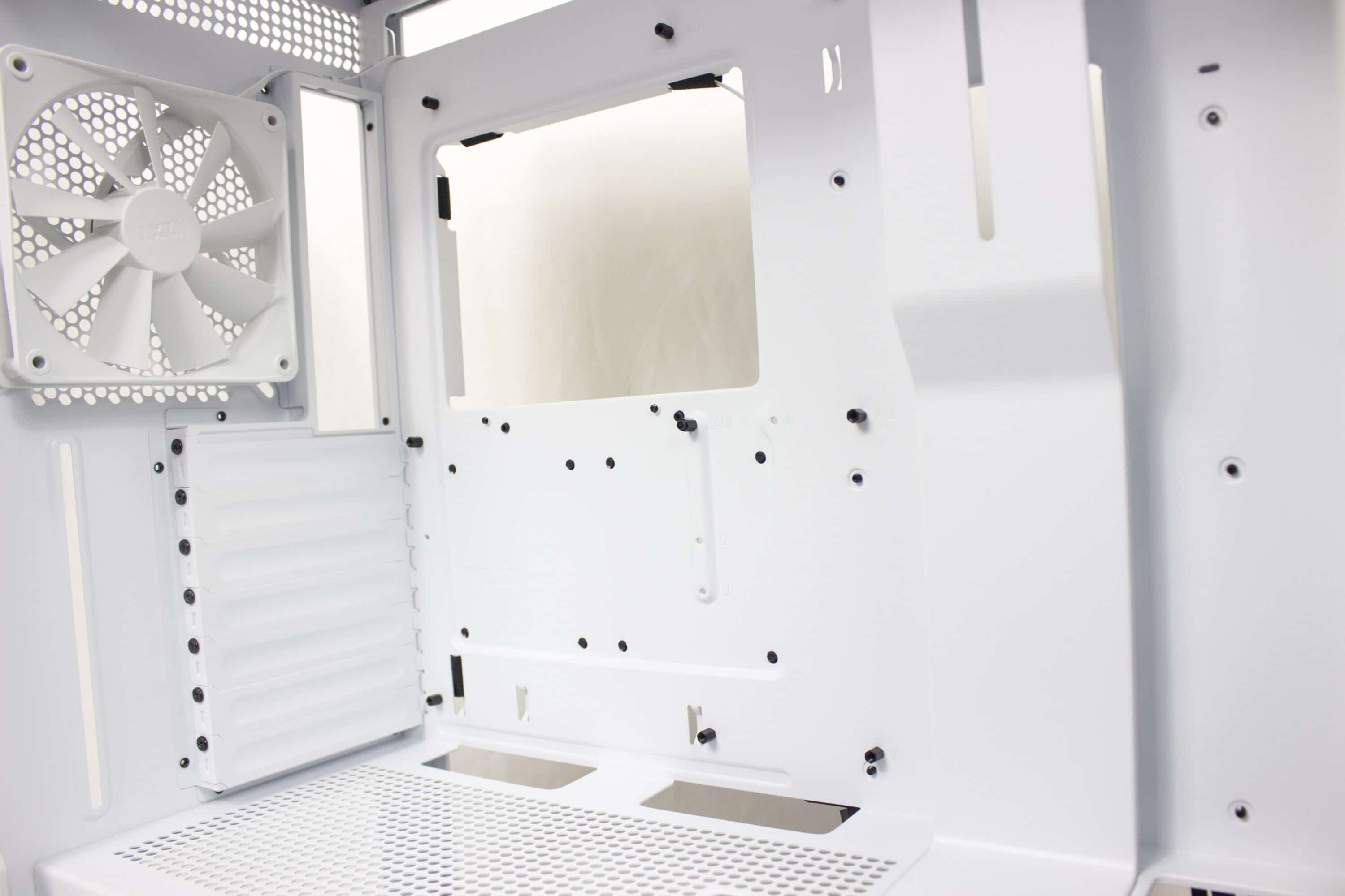 Im Innenraum des NZXT H7 Flow ist mehr als genügend Platz, um seine Hardware zu verbauen, und sogar Kabelmanagement wird groß geschrieben. Haben wir das Glasteil entfernt, können wir einen besseren Blick auf die zwei Lüfter werfen. Jeweils in der Front und auf der Rückseite ist einer angebracht. Im nächstgrößeren Modell sind diese beleuchtet, in unseren gewählten Farbe – weiß – fügen sie sich perfekt ein.