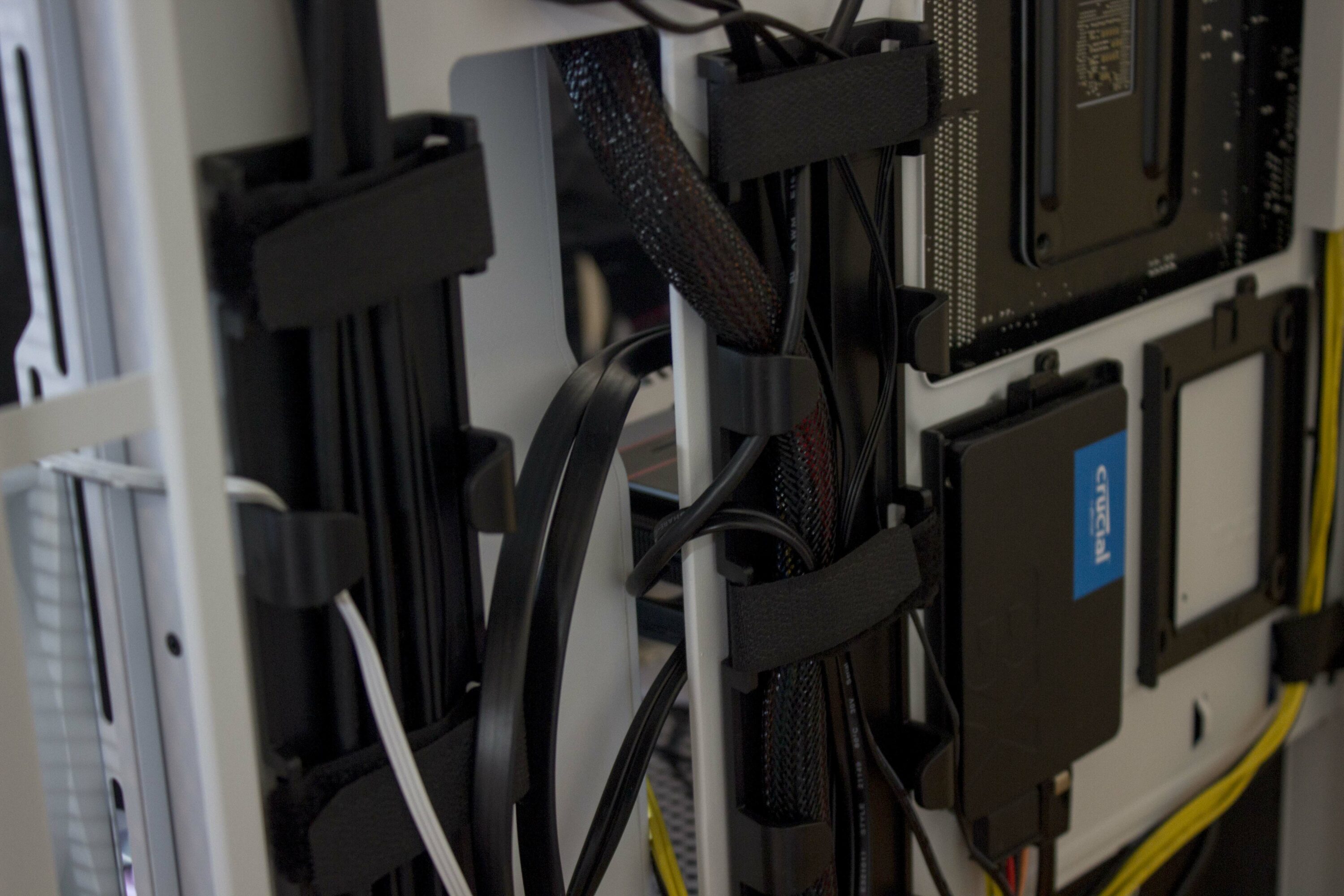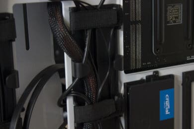 Dahinter geht es direkt weiter. Das Anordnen der Kabel bringt bei diesem Gehäuse Spaß. Wir haben ausreichend Platz, um alle Kabel in dem vorhandenen Kanal unterzubringen. Durch die Klettverschlüsse halten wir alles in Position, ohne das etwas anfängt zu wackeln oder sich beim Transport zu lösen.