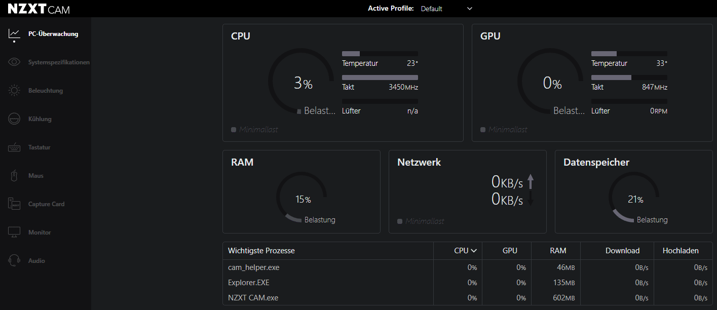 Die NZXT Kraken Plus 360 RGB verfügt in der Pumpe über ein 1,54″-Display sowie in den Lüftern über integrierte ARGB-LEDs. Die Ansteuerung beider Komponenten erfolgt dabei zwingend über die Software NZXT CAM, die ihre Daten vom internen USB-2.0-Anschluss erhält. Die Software bietet diverse vorgefertigte Beleuchtungsmodi bzw. Farben. Falls das nicht reichen sollte, dann kann bei Bedarf mit eigenen Profilen auch jede der jeweils 8 ARGB-LEDs einzeln ansteuern. Da dürften keine Wünsche offen bleiben.