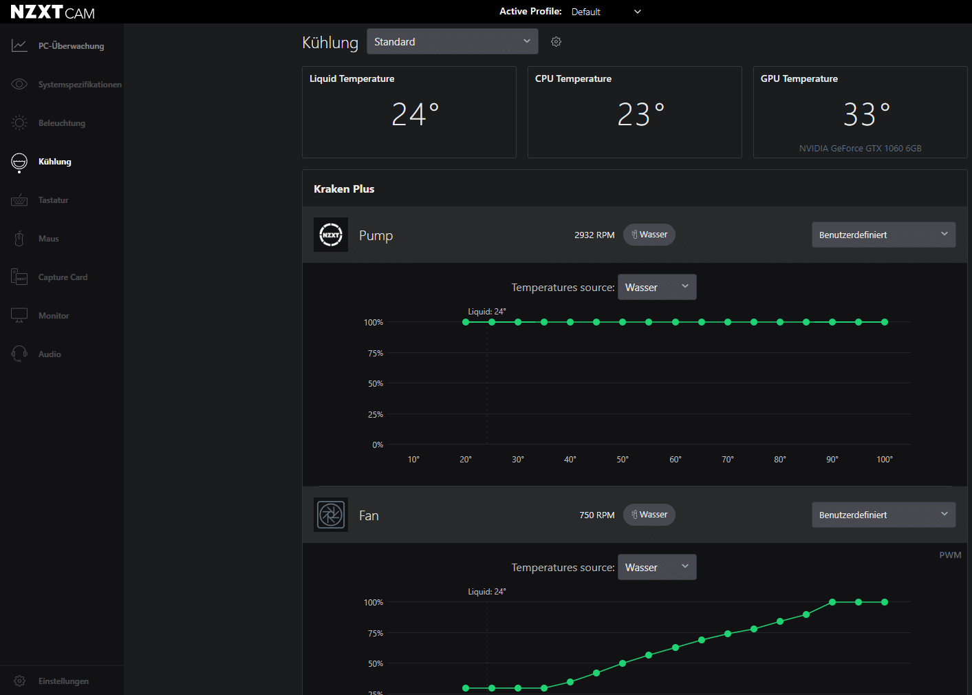 | Display | Transmissive TFT, 262K color, 1,54″-Display, 240 x 240 px, 30 Hz, 300 cd/m², 18-bit Farben, steuerbar per NZXT CAM Software |
