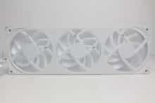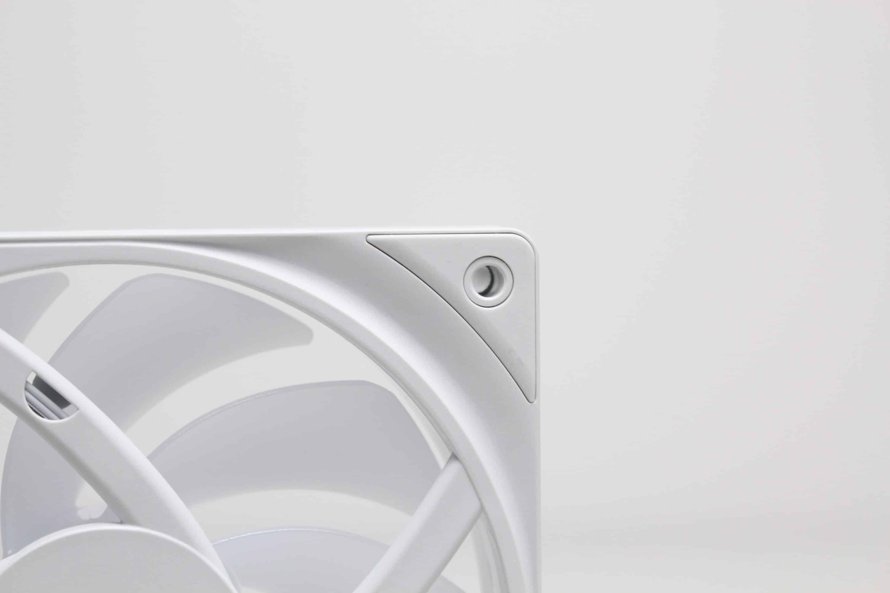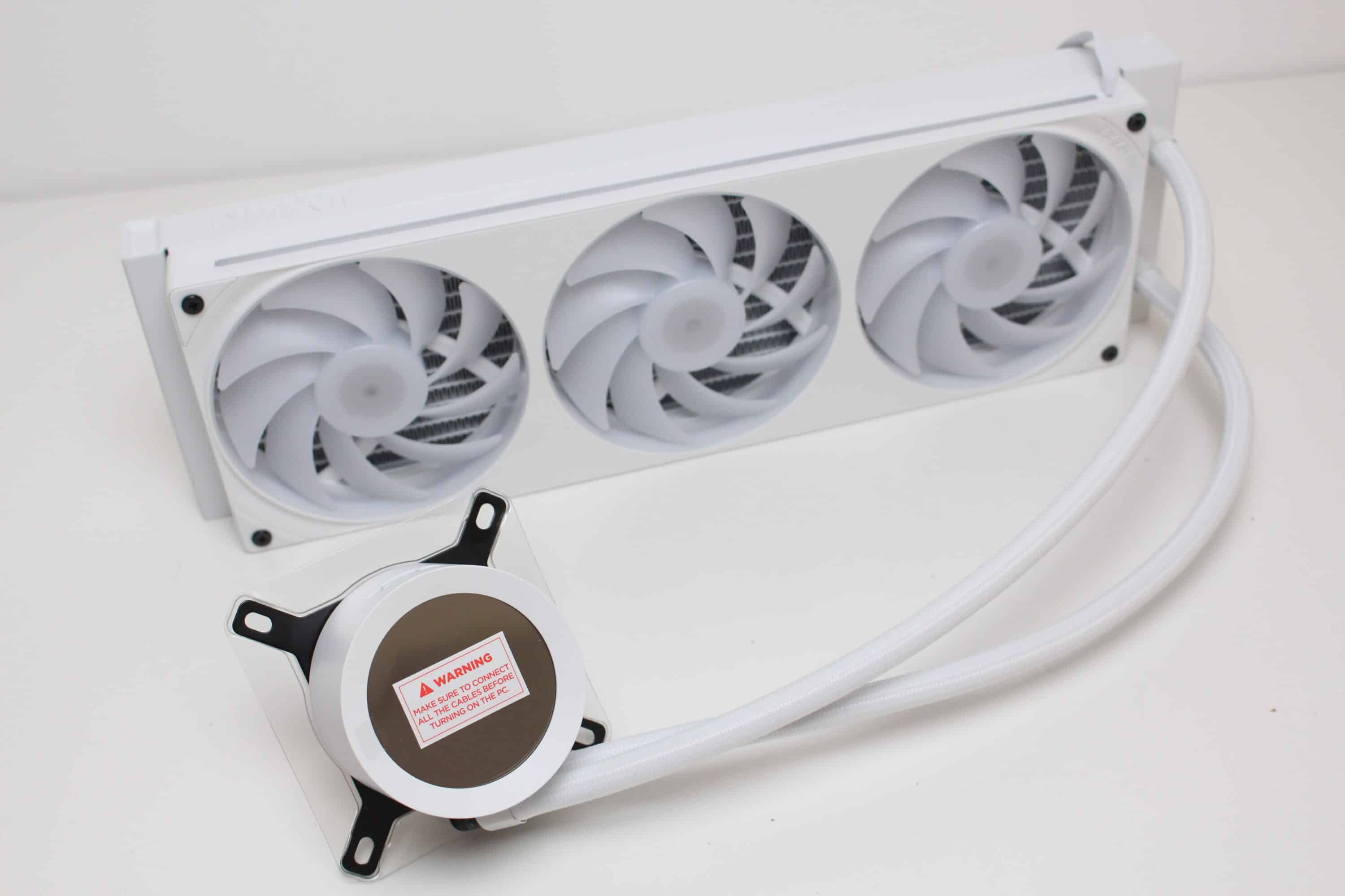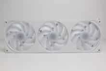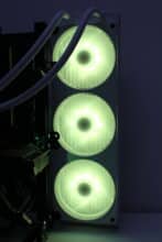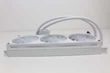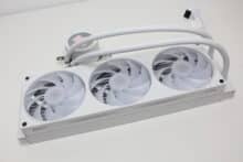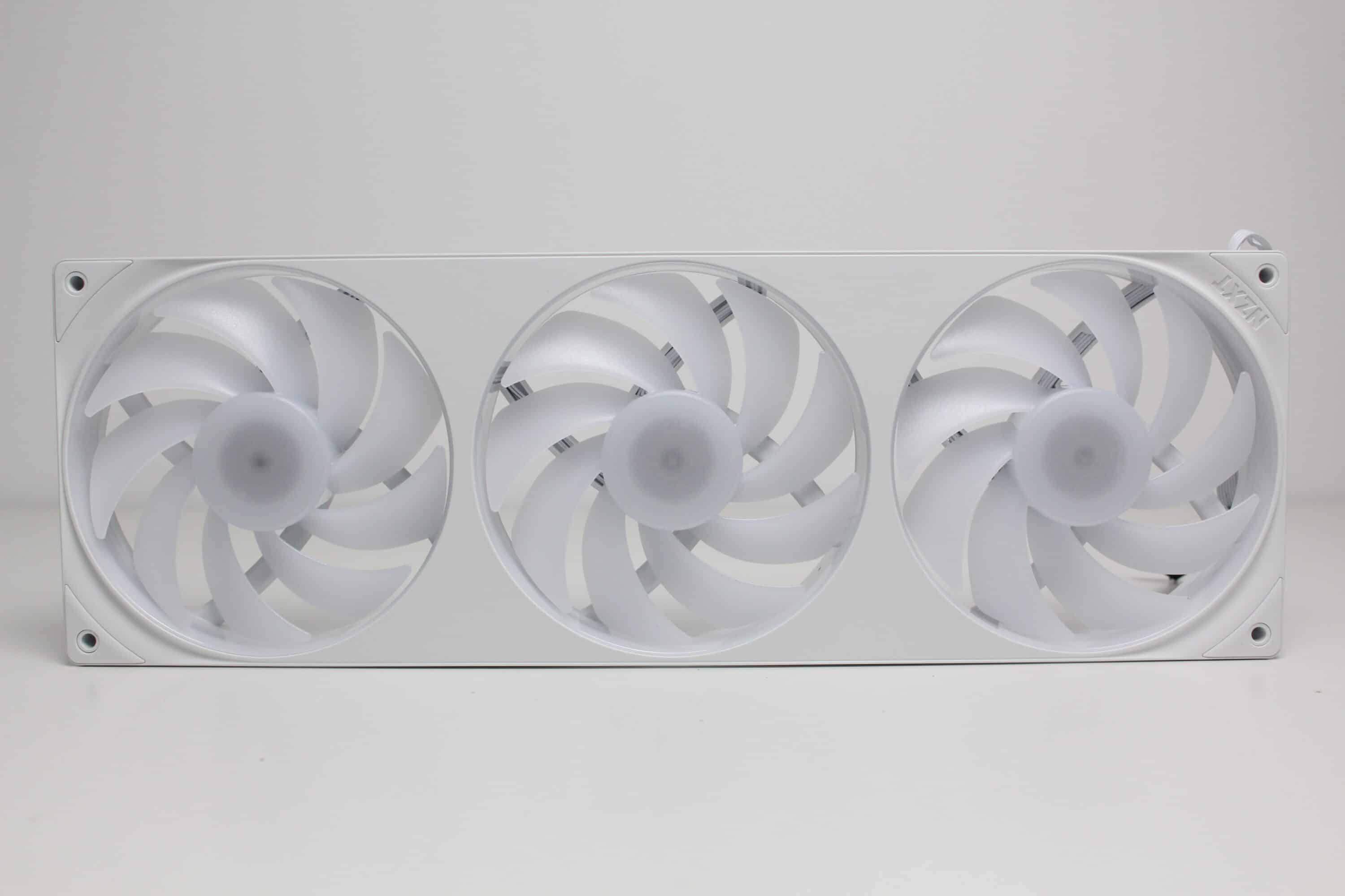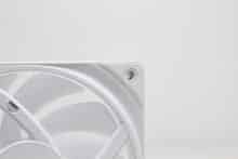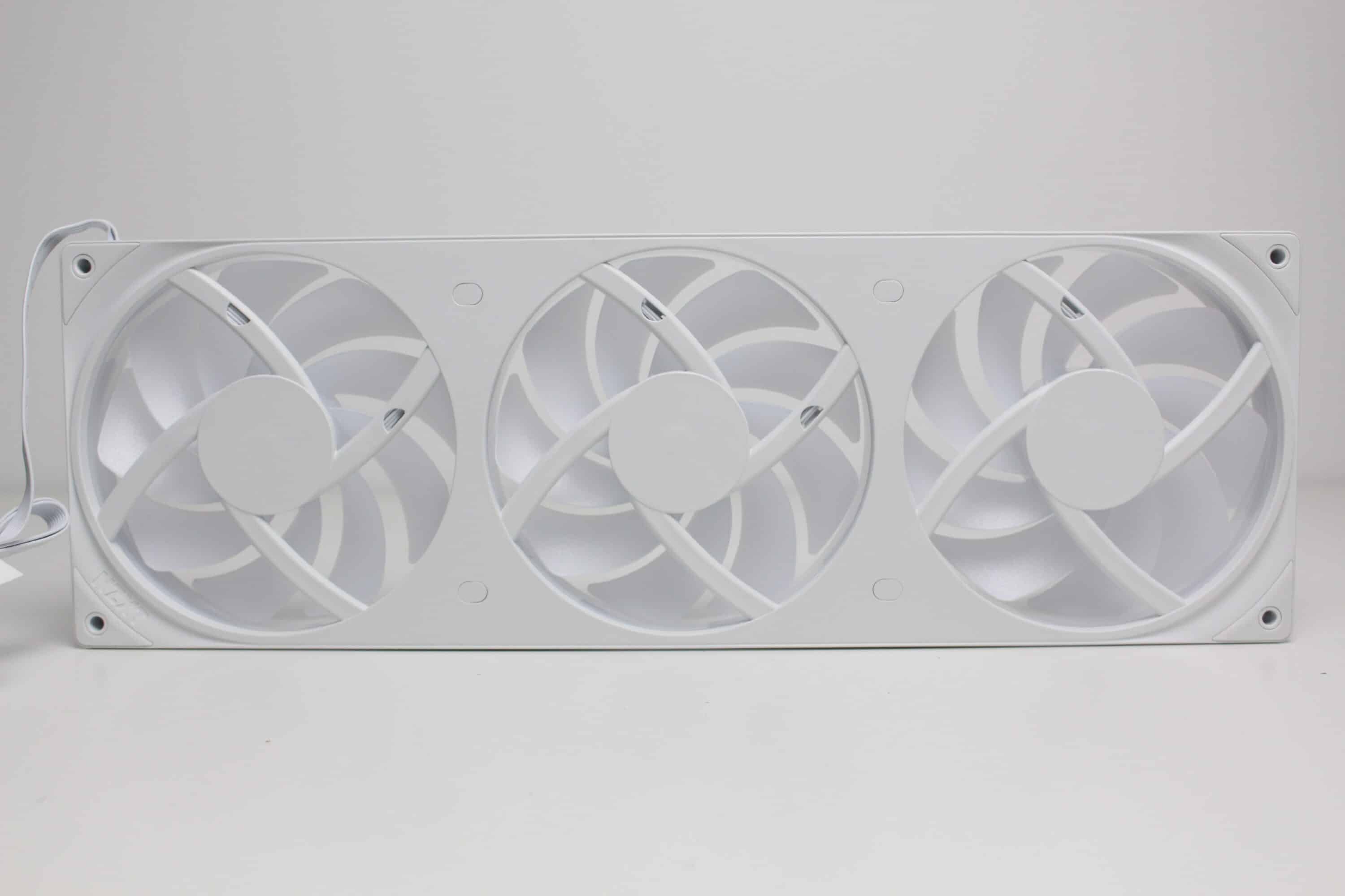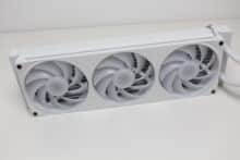 Erstmals seit der Vorstellung des Produktes vor etwa einem Jahr, verbaut NZXT bei einer AiO-Wasserkühlung die Single-Frame Fan Unit F360 RGB Core. Dahinter verbirgt sich ein Lüfterrahmen mit drei intergierten 120-mm-Lüftern, die über ein einzelnes proprietäres 6-Pin-Kabel bzw. über das mitgelieferte Splitterkabel direkt mit der Pumpe verbunden werden und zwischen 500 und 2400 U/min schnell drehen können. Sowohl der Rahmen als auch die Lüfterblätter sind komplett weiß gehalten und in der Lüfternabe wurden jeweils acht ARGB-LEDs platziert. Zuletzt dürfen natürlich auch die obligatorischen Gummi-Entkoppler an den Ecken nicht fehlen.