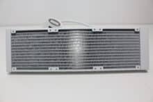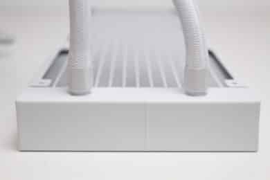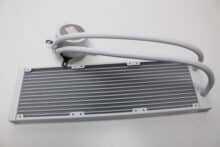 Der Radiator unseres Testexemplars ist vollständig weiß lackiert. Das gilt sowohl für die Aluminiumlamellen als auch für den umlaufenden Rahmen sowie die Radiatorendstücke. Lediglich das seitlich eingearbeitete Herstellerlogo hebt den Radiator optisch etwas ab. Insgesamt misst der Wärmetauscher 401 x 120 x 27 mm (L x B x H) und ist damit weder besonders kompakt noch überdurchschnittlich groß dimensioniert.