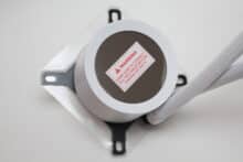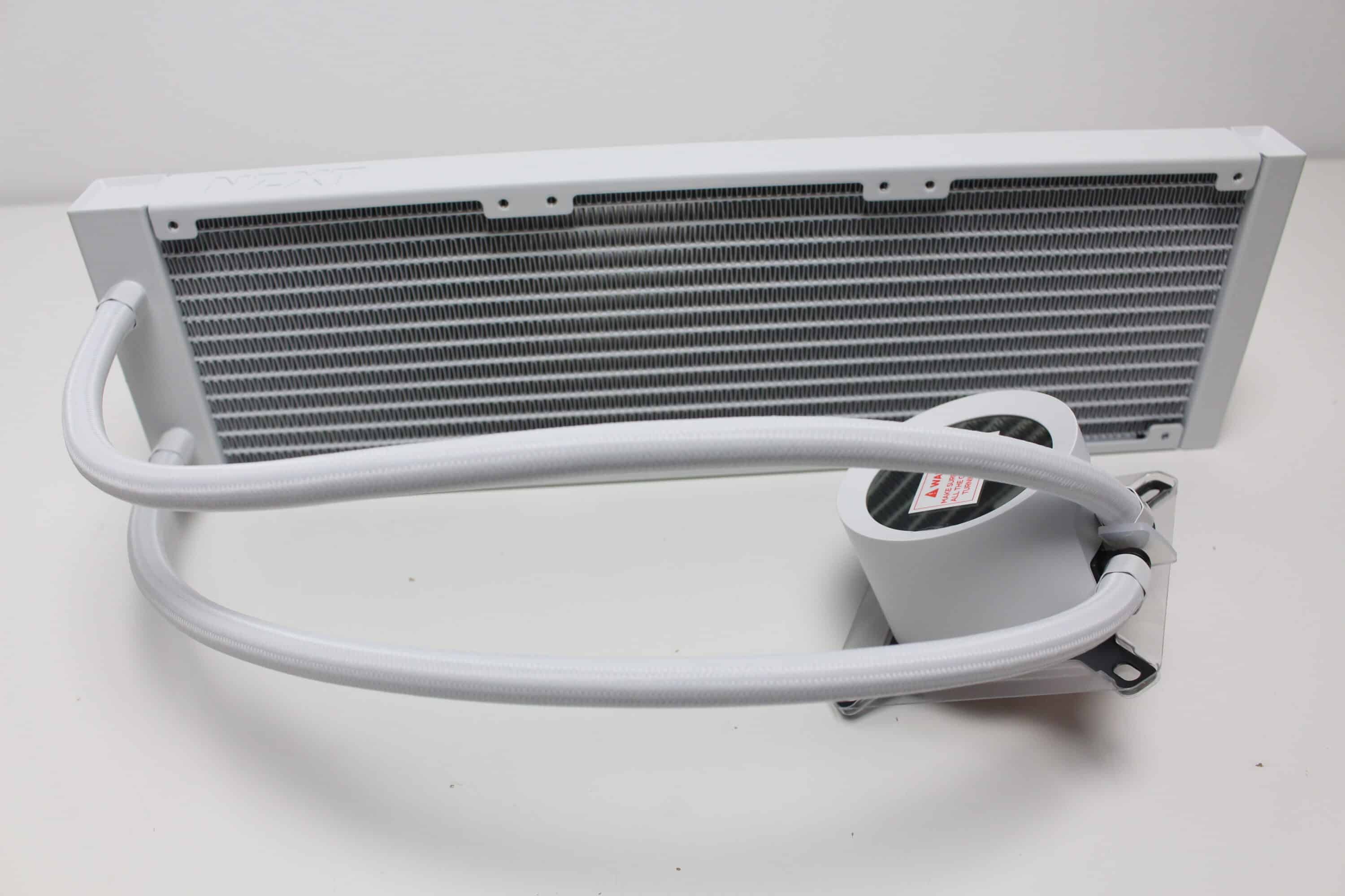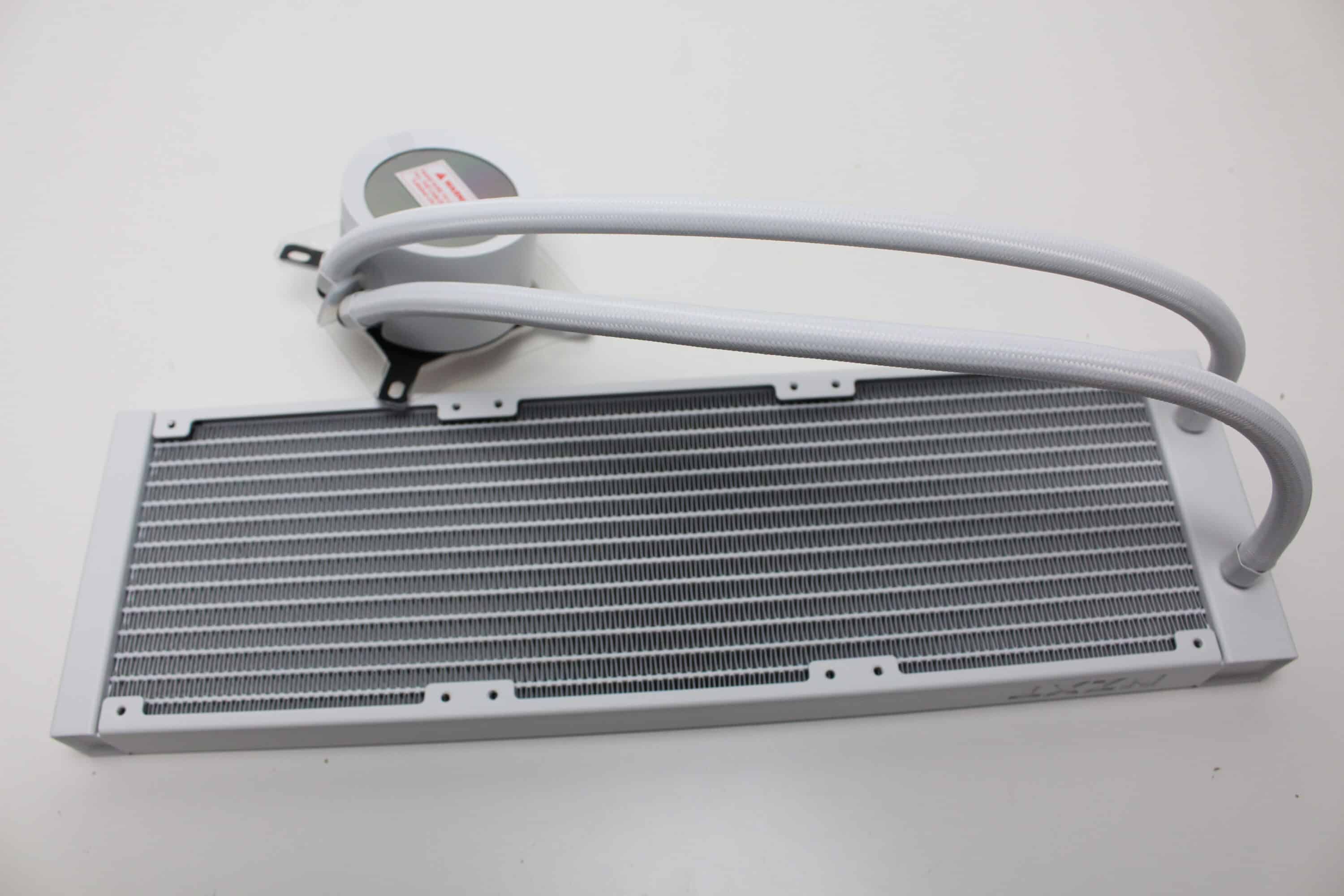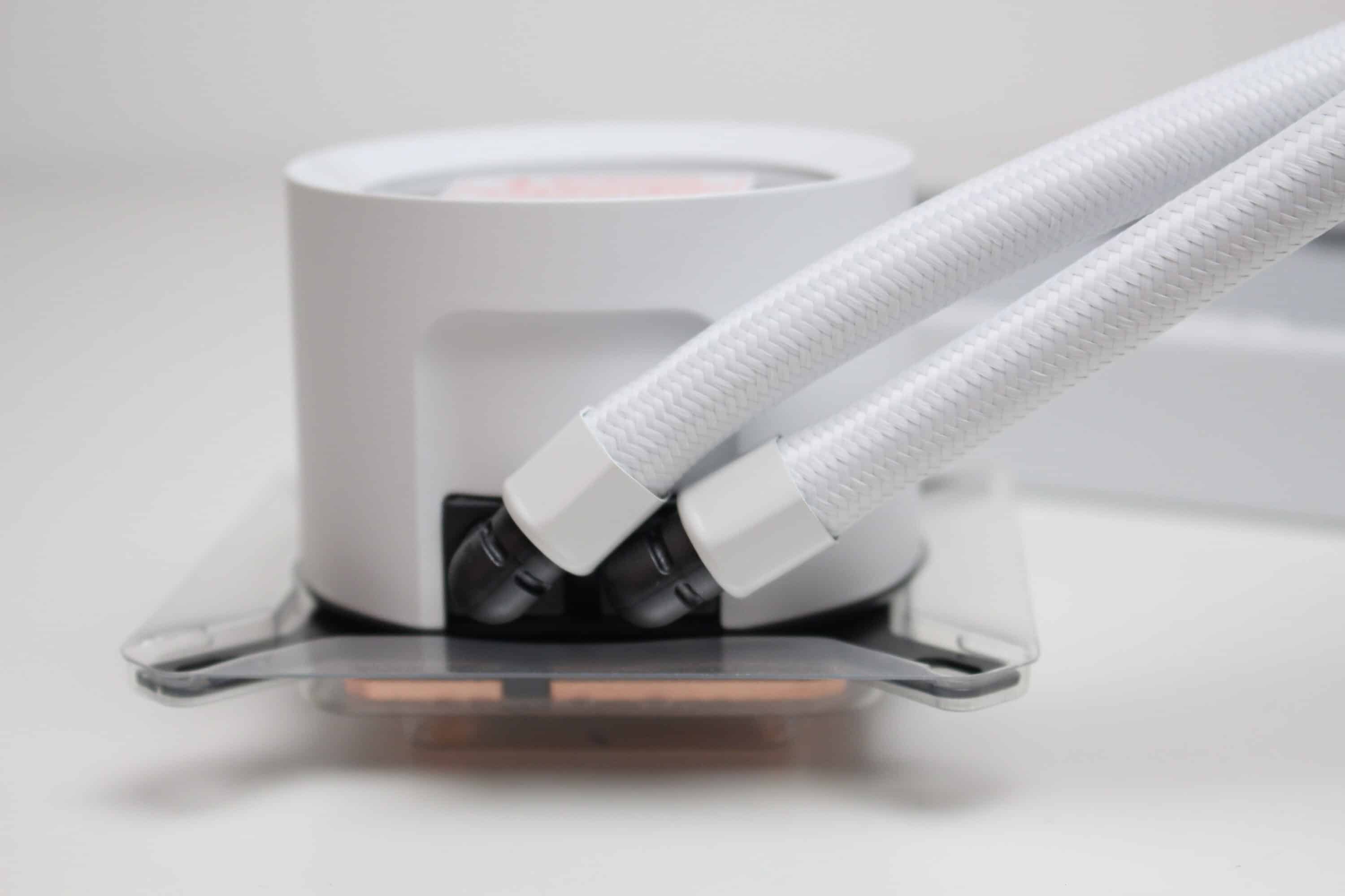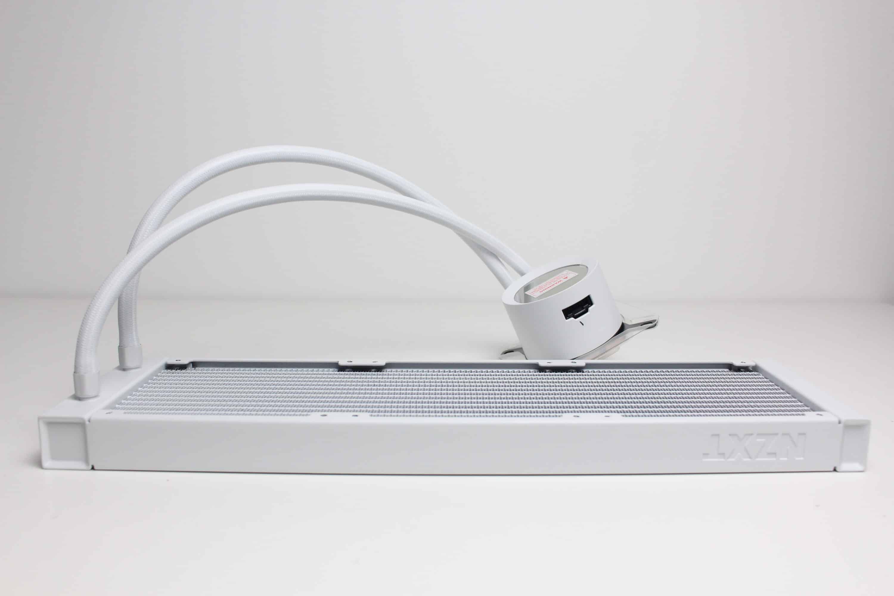 Sowohl am Radiator als auch an der Pumpe wurden die 420 Millimeter langen Schläuche in Muffen aus Metall gepresst. Damit ist die Kompaktwasserkühlung leider nicht wart- bzw. auffüllbar. Dafür verbaut NZXT am Pumpenblock zwei schwenkbare Schlauchgelenke und ummantelt die Schläuche mit einem weißen Nylon-Sleeve. Dieser verbessert den Knickschutz und natürlich auch die Optik.