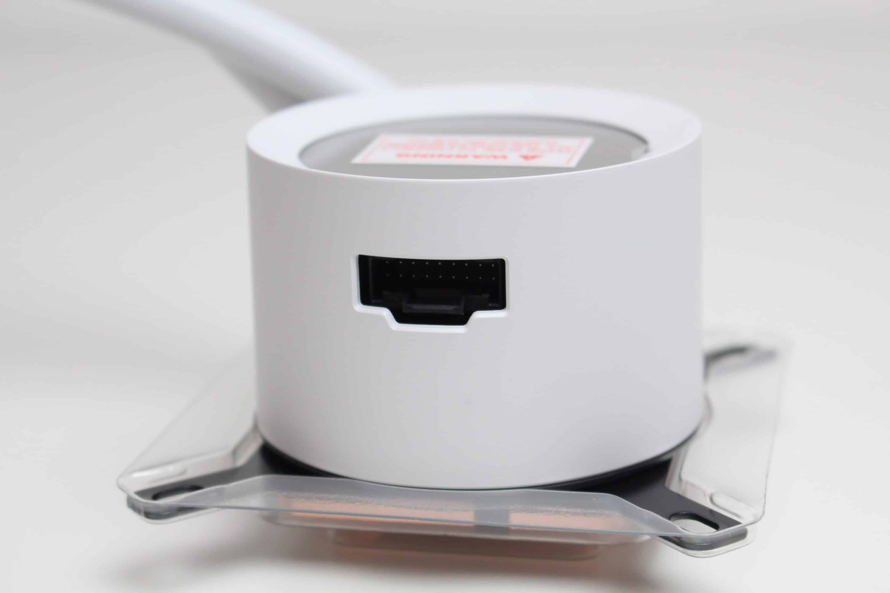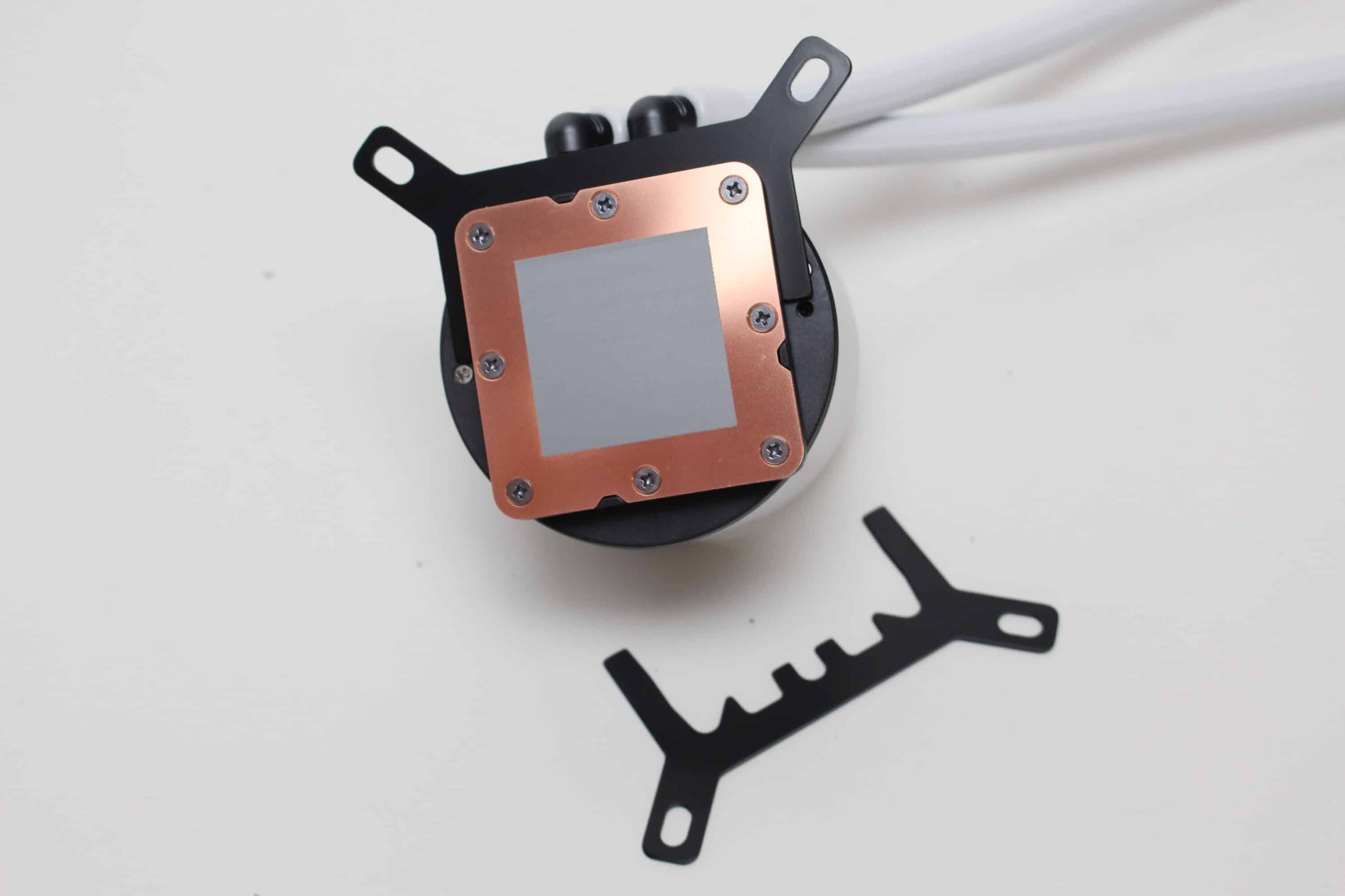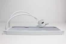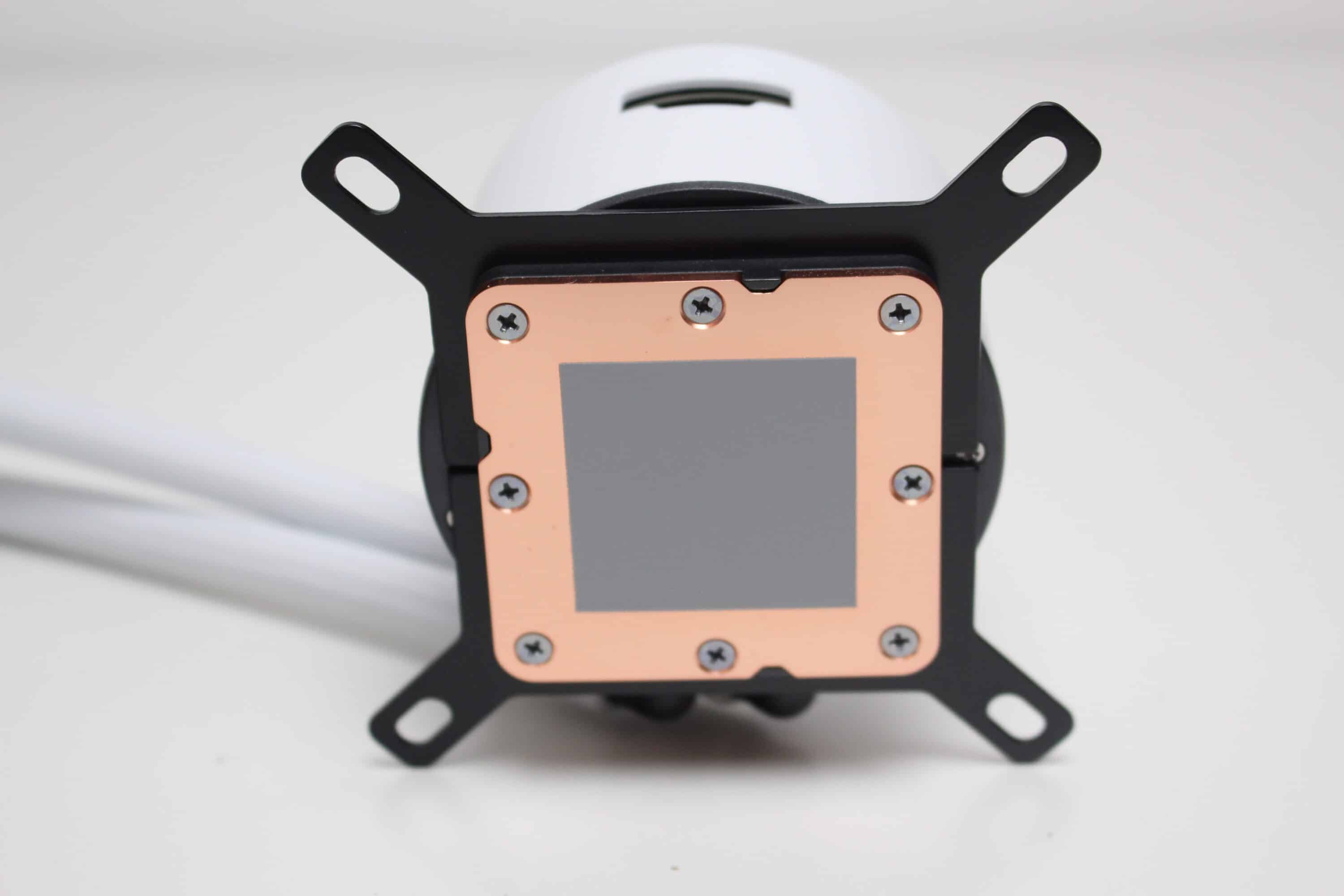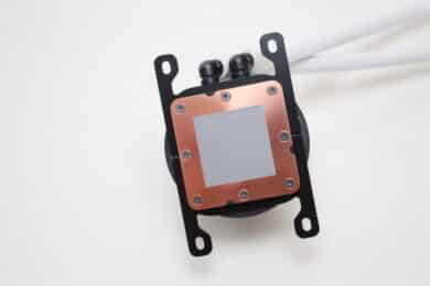 Der Pumpenblock der NZXT Kraken Plus 360 RGB unterscheidet sich optisch kaum von denen der bisherigen Kraken-Modelle. NZXT gestaltet den aus Aluminium und Kunststoff gefertigten Block rund und lackiert ihn ebenfalls weiß. Unterhalb des spiegelnden Deckels verbaut der Hersteller ein 1,54″-Display und am Boden sorgt eine Basisplatte aus Kupfer mit voraufgetragener Wärmeleitpaste für die ordnungsgemäße Aufnahme der CPU-Abwärme. NZXT gibt für die Pumpe einen Umdrehungszahlbereich von 1200 bis 2800 U/min an.