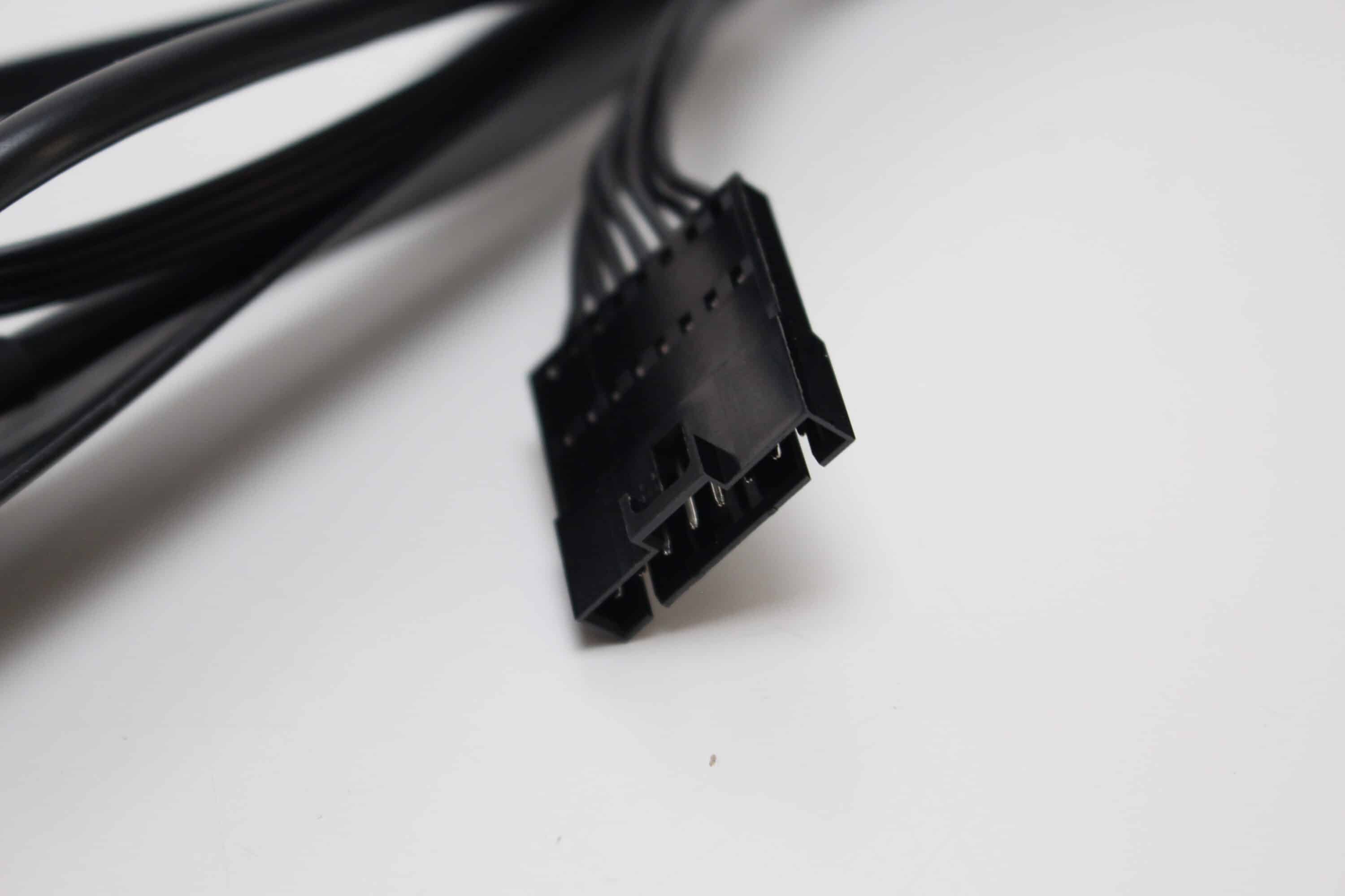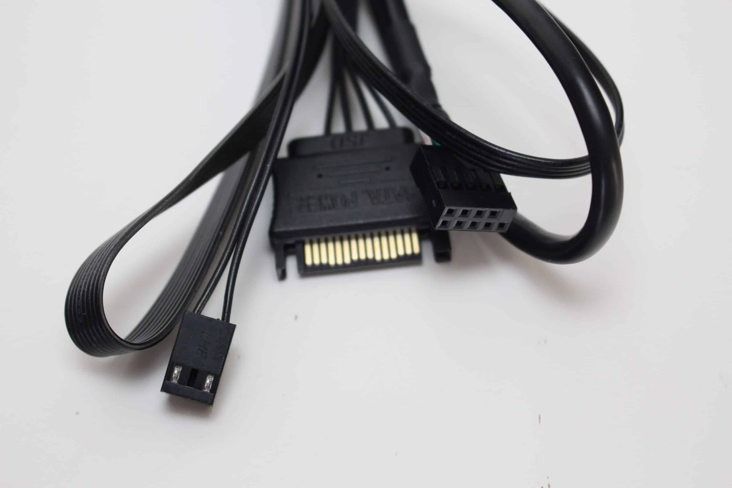 NZXT bringt bei der Kraken Plus 360 RGB ein proprietäre Anschlusskabel zum Einsatz. Das eine Ende steckt direkt in der Pumpe und splittet sich dann auf in einen SATA-Stromanschluss, ein 3-Pin 12V-Stecker, einen USB 2.0 Stecker sowie eine Buchse zum Anschluss des proprietären Lüfterkabels. Leider ist selbst bei der weißen Version ein schwarzes Kabel beigelegt. Für den Einsatz in einem „All-White“-System könnte das ein Deal-Breaker sein.