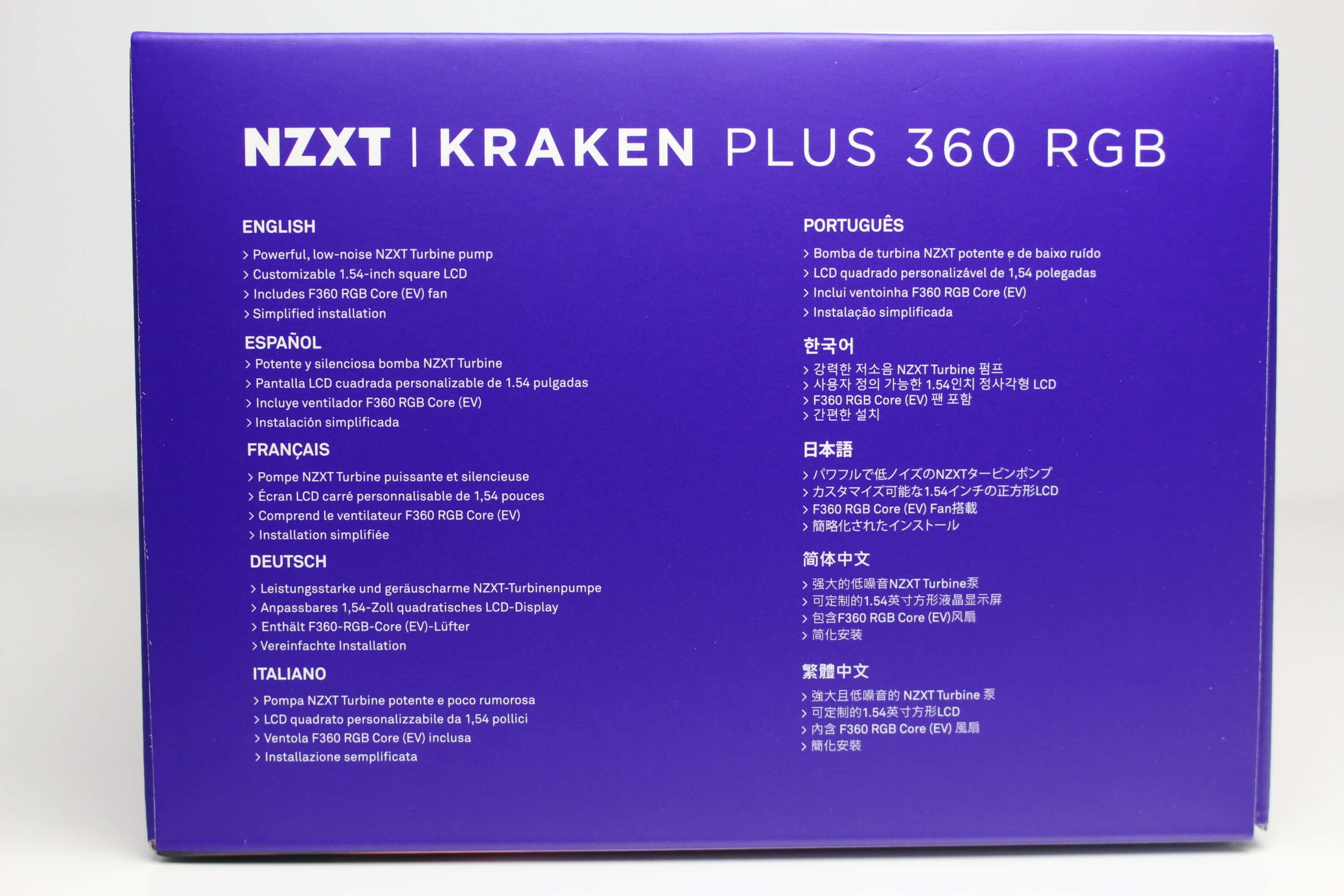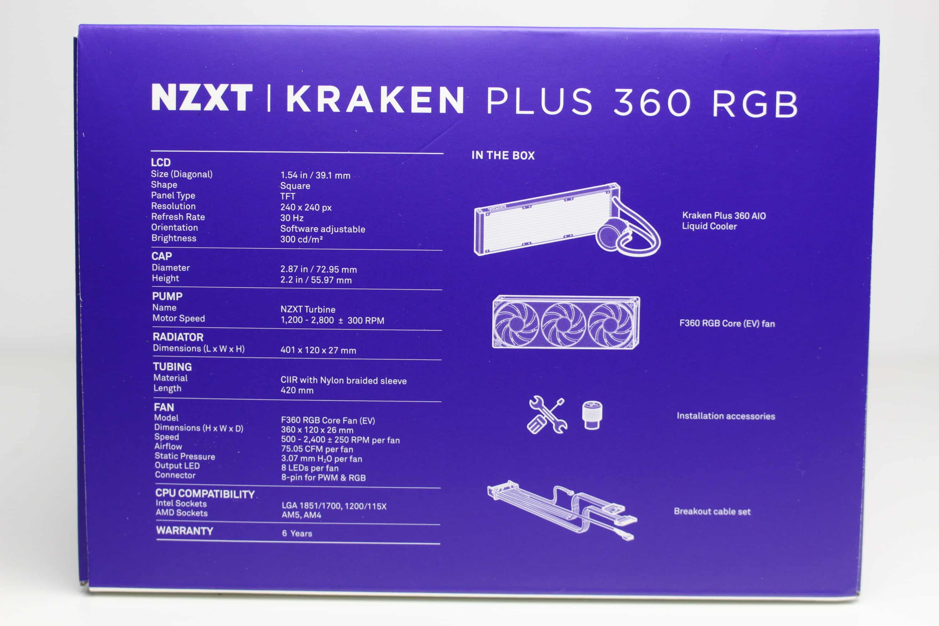 NZXT verpackt die Kraken Plus 360 RGB in einer auffällig gestalteten und farbig bedruckten Verpackung. An der Vorderseite platziert eine der Hersteller ein Foto der Kompaktwasserkühlung und an der Rückseite kann man das Produkt im eingebauten Zustand sowie eine Auflistung wichtiger Features erkennen. Die Seiten des Kartons färbt NZXT Lila und druckt dort in weißer Schrift eine Tabelle mit den technischen Daten sowie technische Zeichnungen auf.
