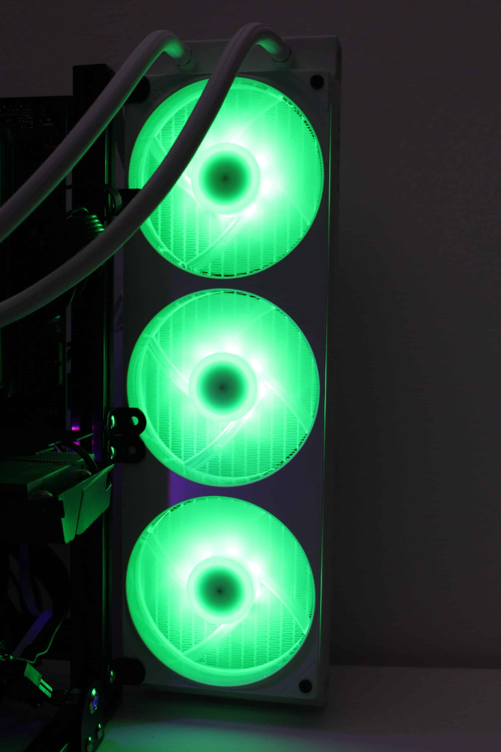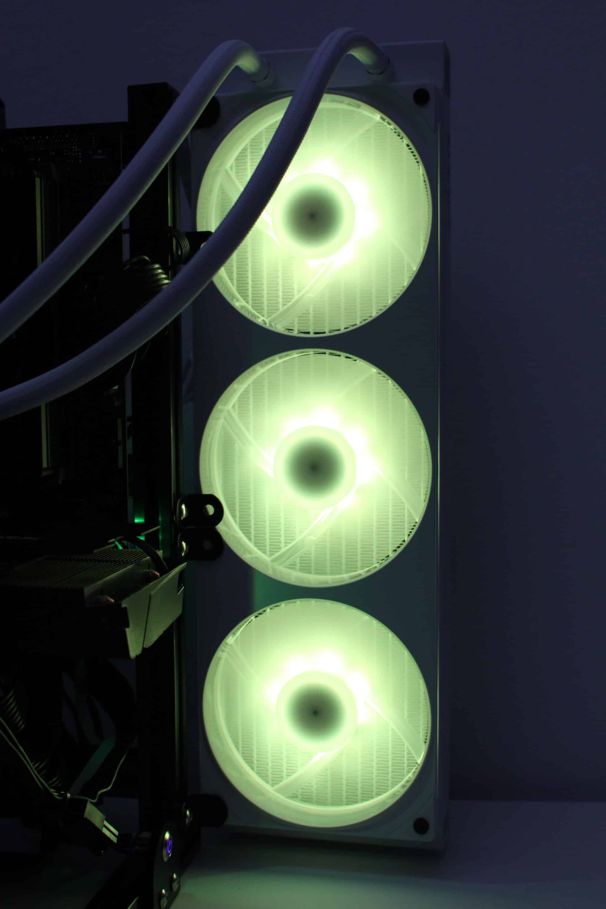 Die Lautstärke der NZXT Kraken Plus 360 RGB variiert allerdings sehr stark. Bei 500 Umdrehungen pro Minute sind die Lüfter zwar sehr leise, produzieren aber leider leichte Nebengeräusche. Von der Pumpe ist bei minimaler Umdrehungszahl (1260 rpm) nur ein sehr zurückhaltendes Summen zu hören. Ab ca. 1000 Umdrehungen pro Minute fangen die Lüfter des F360 RGB Core Lüfterrahmens nervig an zu brummen bzw. zu schwingen. Bei voller Umdrehungszahl sind sowohl die Lüfter als auch die Pumpe deutliche hörbar und als störend laut zu bezeichnen.