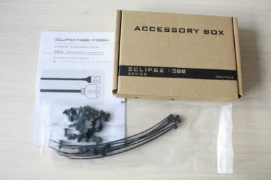 Das Phanteks Eclipse P300 Air kommt gut und sicher verpackt in einem braunen Karton mit schwarzer Schrift und ist von normalen Styropor-Blöcken umhüllt. Auf dem Karton sind nur Bilder des Produktes zu sehen, grundsätzliche technische Daten gibt es hier leider nicht. Um die Gefahr von Kratzern zu reduzieren, hat der Hersteller zudem das Seitenfenster mit einer zusätzlichen Schutzfolie beklebt. Das mitgelieferte Zubehör befindet sich in einer braunen Schachtel innerhalb des Festplattenkäfigs. Vorhanden sind alle wichtigen Schrauben, eine Bedienungsanleitung, sechs schwarze Kabelbinder und eine Garantieanleitung. Außerdem gehören zum Lieferumfang ein vorinstallierter 120-Millimeter-Lüfter, vorinstallierte Abstandshalter, sowie Staubfilter für Deckel und Netzteil.