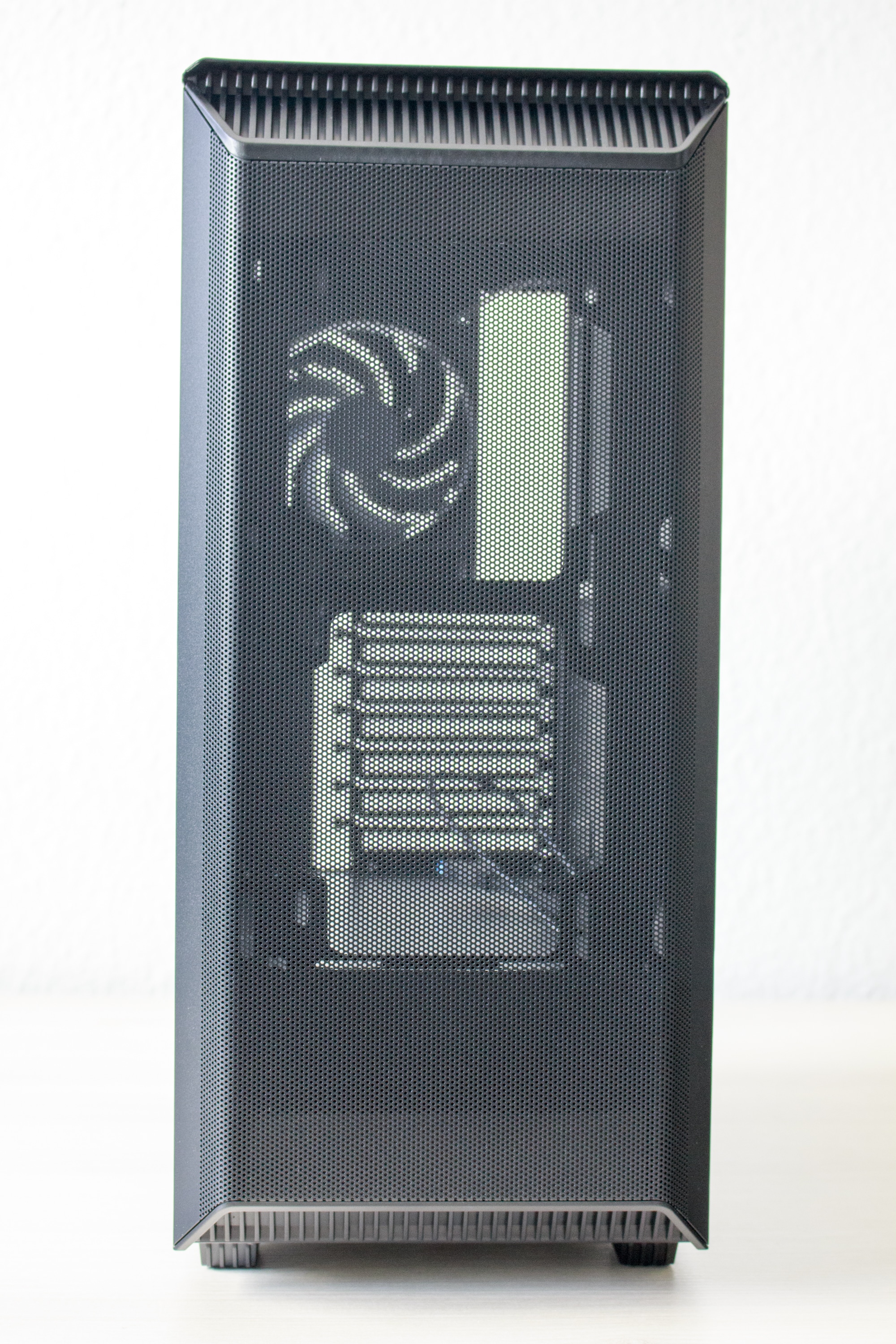 Die äußerliche Gestaltung des Eclipse P300 Air ist als schlicht zu bezeichnen und unterscheidet sich vom ursprünglichen P300 kaum. Der einzige Unterschied fällt direkt bei der Betrachtung der Front auf. Diese ist nämlich nicht geschlossen, sondern besteht komplett aus einem fein strukturierten Mesh. Die markanten Lüftungsgitter im oberen und unteren Bereich des Frontpanels sind hingegen geschlossen worden. Einen zusätzlichen Staubschutz hinter dem Mesh gibt es ebenfalls nicht. Zieht man die mit Metallnasen befestigte Front ab, kommen zwei Montageplätze für zwei 120- oder 140-Millimeter-Lüfter und der nach vorne ausgerichtete Festplattenkäfig zum Vorschein.