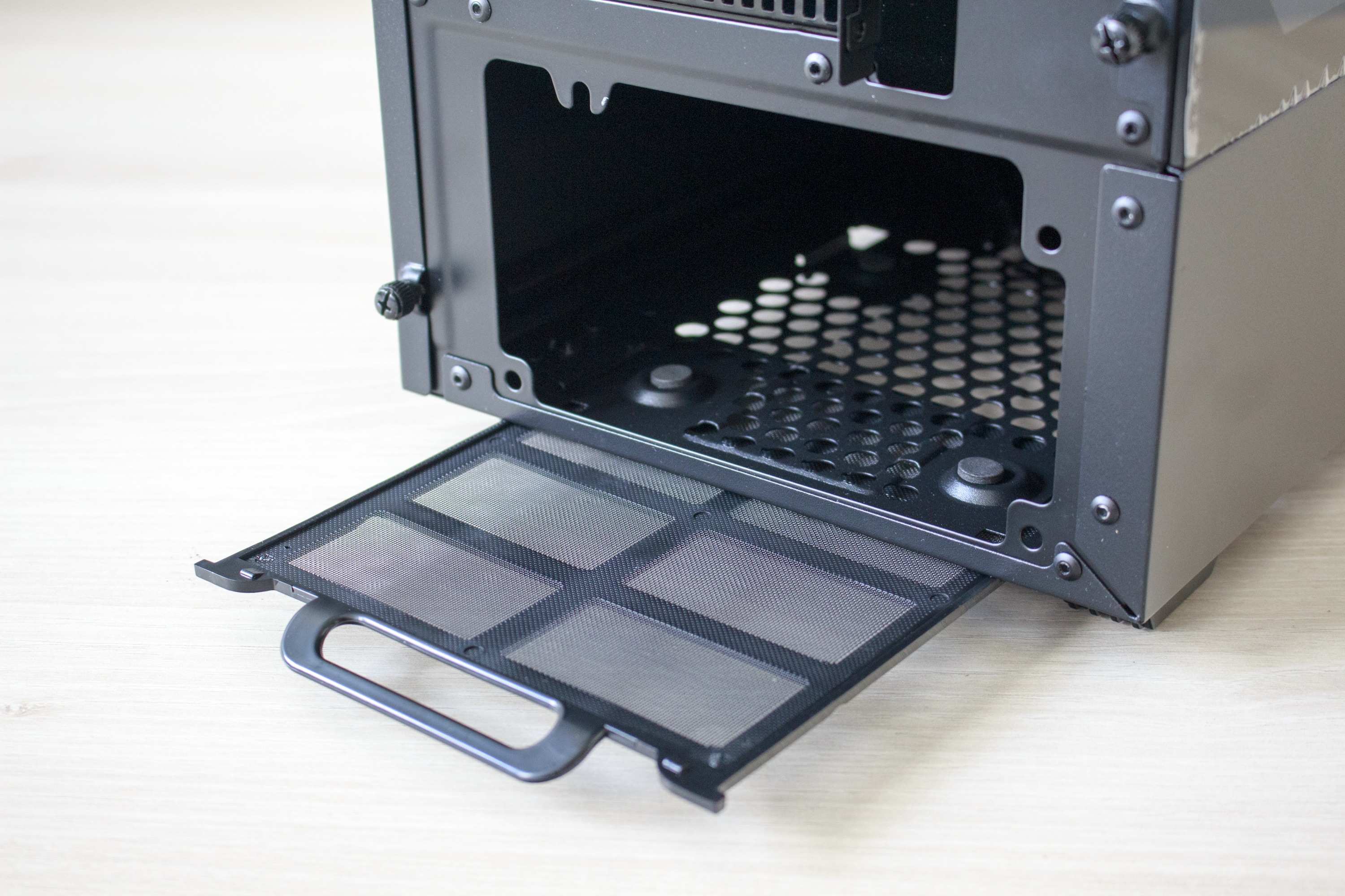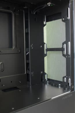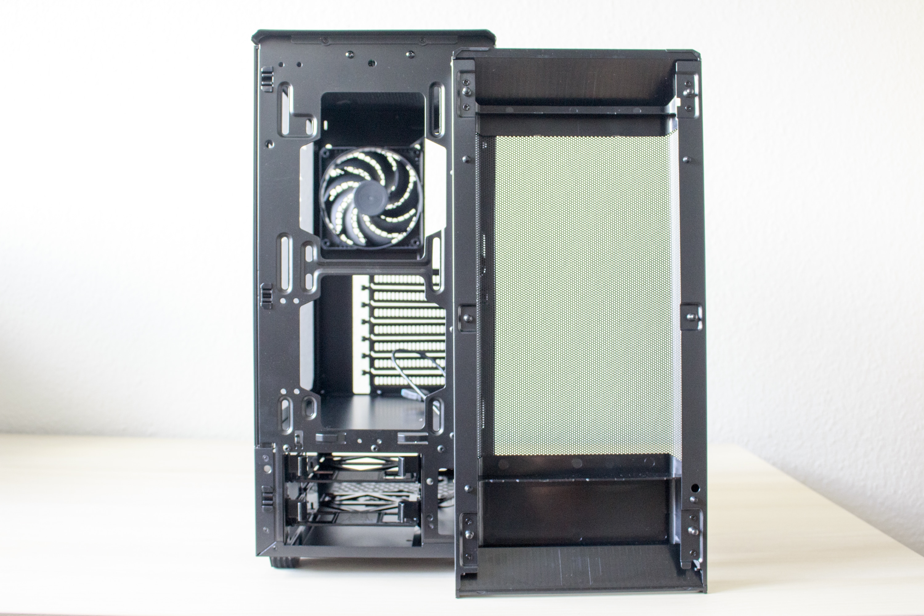 Das linke Seitenteil ist aus Tempered Glass gefertigt und nicht getönt. Außerdem ist zu erwähnen, dass das Glasfenster nicht die komplette linken Seite bedeckt. Der untere Bereich besteht aus Stahl und gehört zum Korpus und nicht zum Seitenteil. Die rechte Seite ist komplett aus Stahl gefertigt und weist eine ausreichende Stabilität auf. Beide Sidepanels sind mit Rändelschrauben befestigt und verfügen über praktische Griffmulden. Ein nettes Feature ist außerdem, dass die Rändelschrauben nach der Demontage an den Seitenteilen verbleiben und somit nicht verloren gehen können.