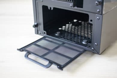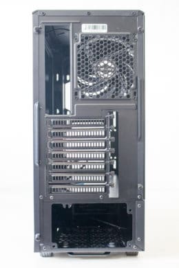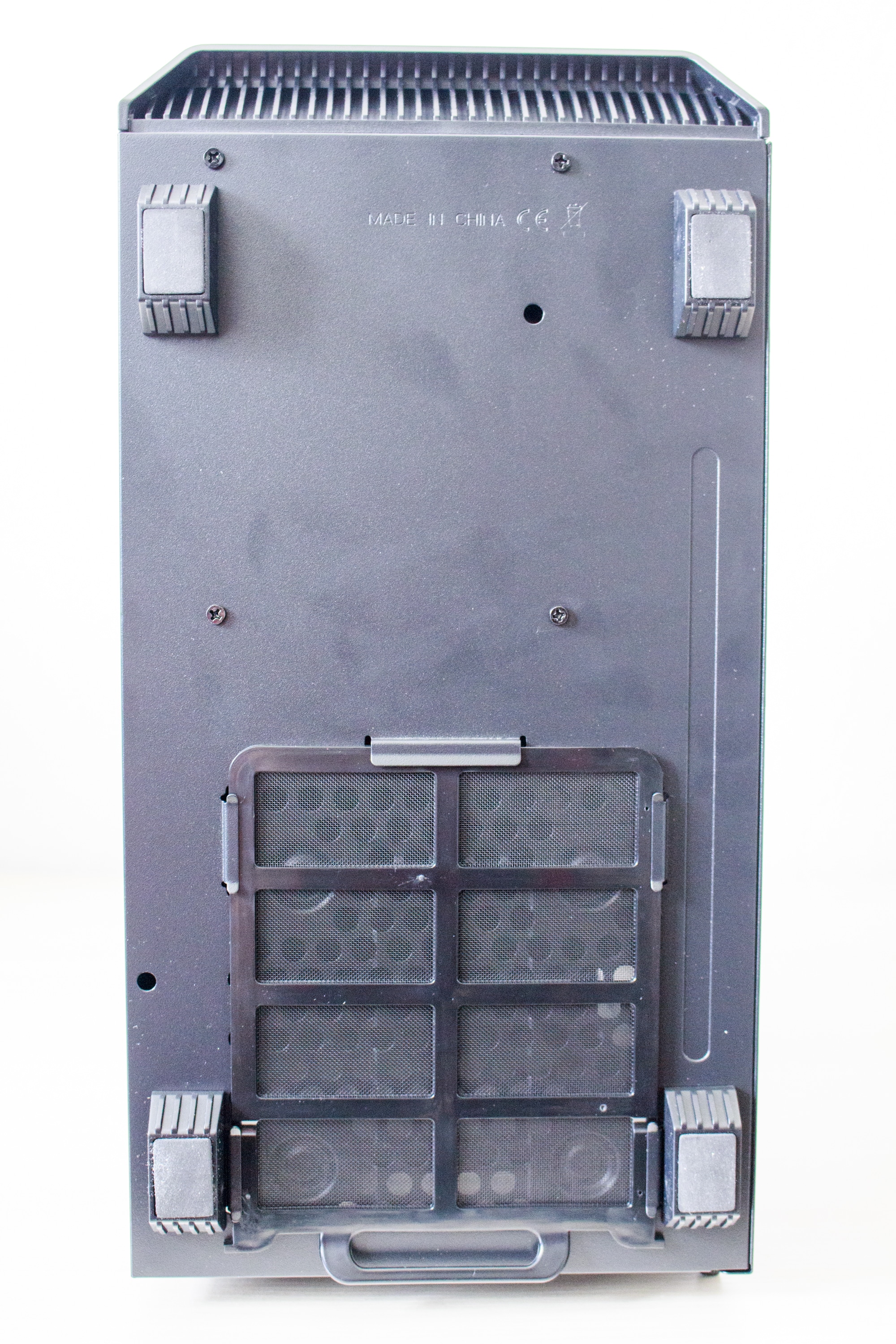 An der Rück- bzw. Unterseite gibt es eine Standard-Ausstattung. Das Netzteil wird unten montiert und darüber finden sich sieben PCI-Slotblenden. Des Weiteren gibt es an der Rückseite Platz für einen vorinstallierten 120-Millimeter-Lüfter und die Öffnung für das I/O-Shield. Das P300 Air steht auf vier soliden Füßen aus Kunststoff und verfügt über einen einfach entfernbaren Staubfilter für das Netzteil.