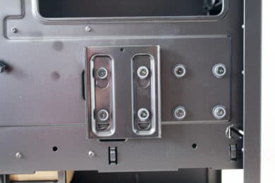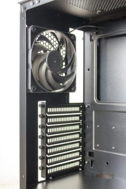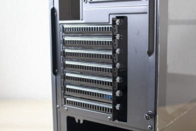 Die sieben PCI-Slotblenden sind alle wiederverwendbar, verfügen über Lüftungsschlitze und wurden alle außerhalb des Gehäuses mit praktischen Rändelschrauben befestigt. Außerdem ist an dieser Stelle zu erwähnen, dass es zwischen den Slotblenden keine störenden Stahlstreben gibt.