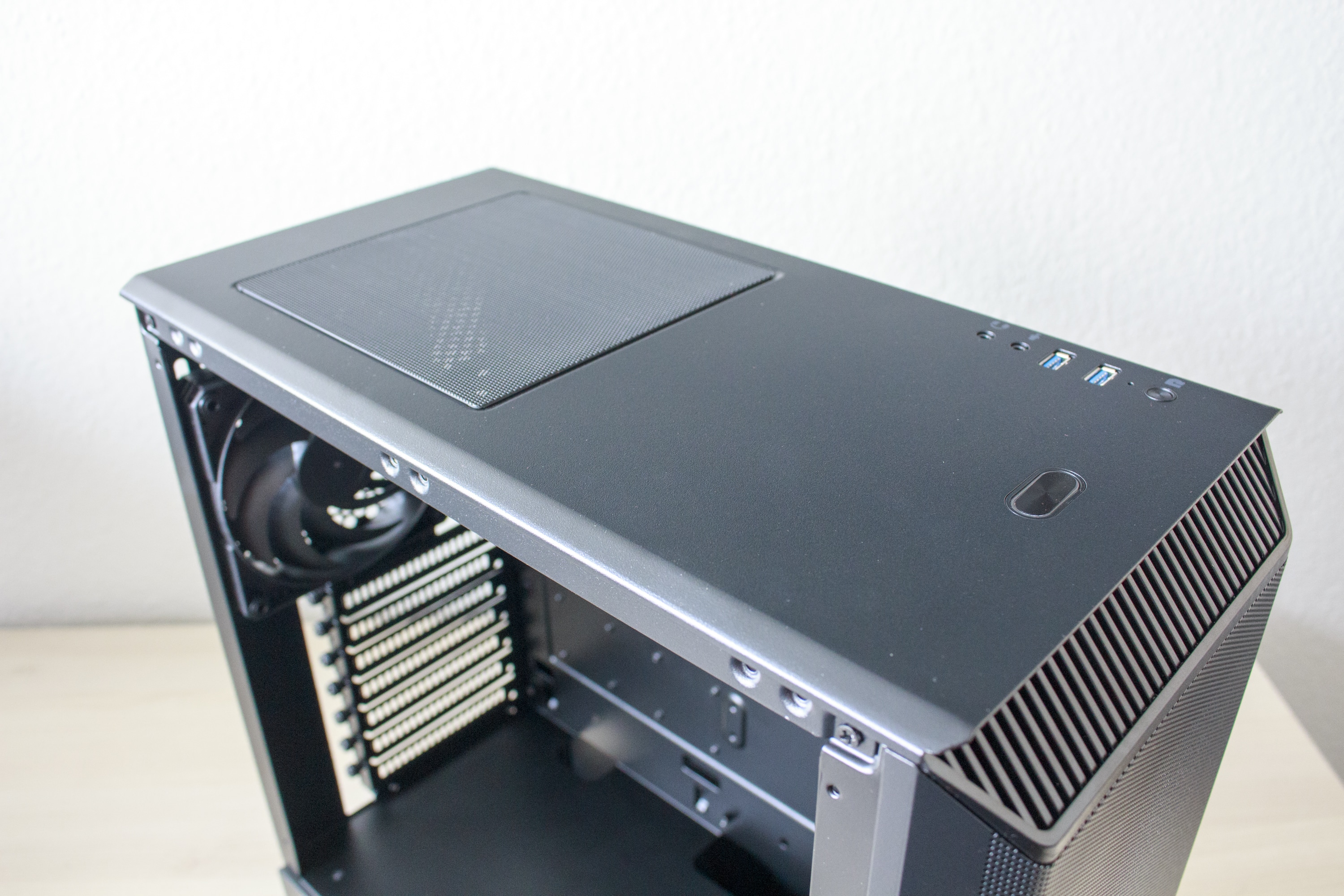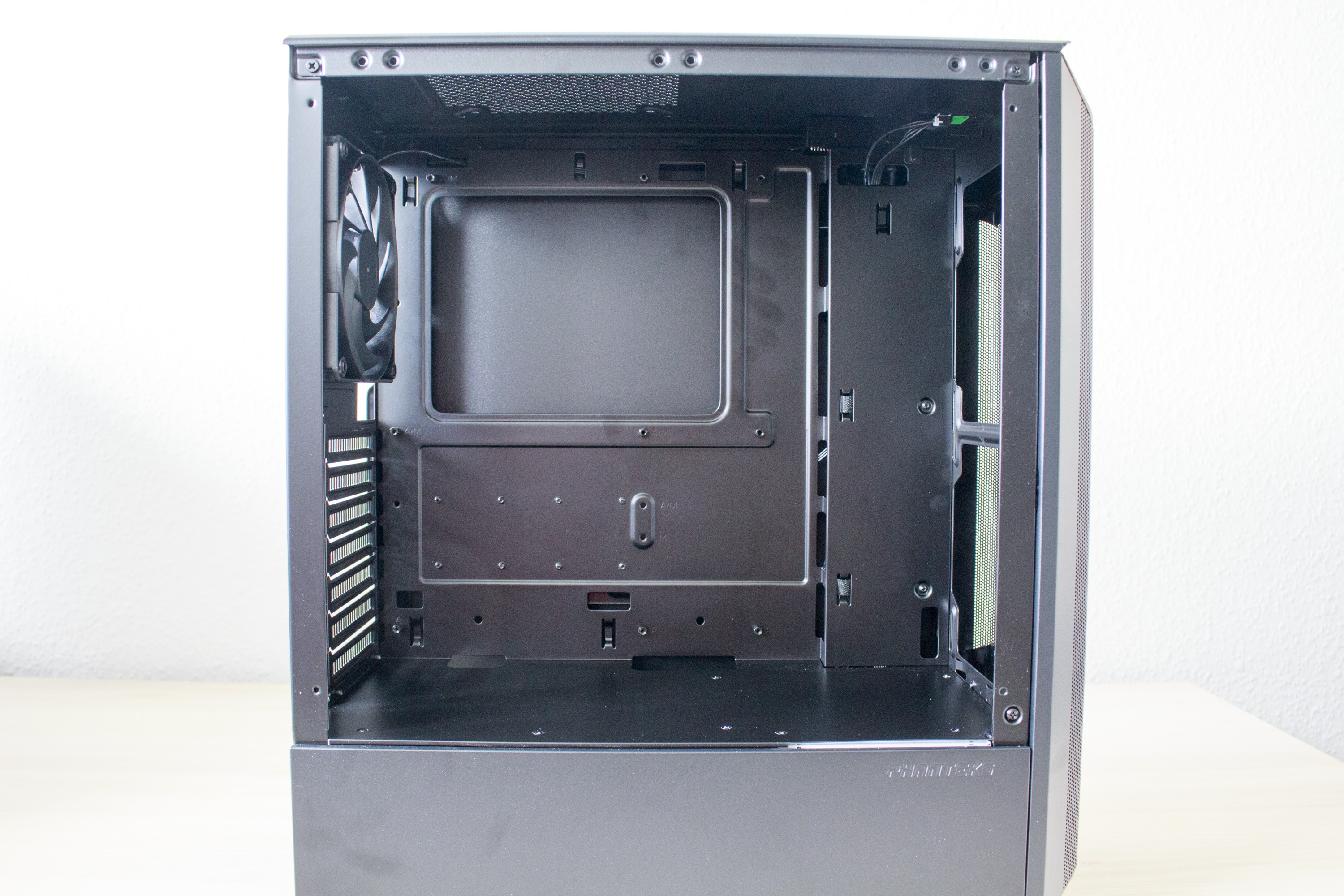 Oberhalb der Abdeckung finden wie gewohnt das Mainboard und die Erweiterungskarten Platz. Aufgrund der kompakten Maße dieses Midi-Towers gibt es hier jedoch nicht unendlich viel Platz und es können nur normalbreite ATX-Mainboards verbaut werden. Rund um das Mainboard-Tray gibt es, neben den bereits genannten, sieben weitere Öffnungen für das Kabelmanagement. Die rechten Ausgänge sind nicht parallel zum Tray sondern um 90 Grad angewinkelt. Im vorderen Bereich ist genug Platz um dort einen 240- oder 280-Millimeter-Radiator verbauen zu können. Durch die Abwesenheit von Festplattenkäfigen, können dort montierte Lüfter ungehindert frische Luft in den Innenraum befördern.