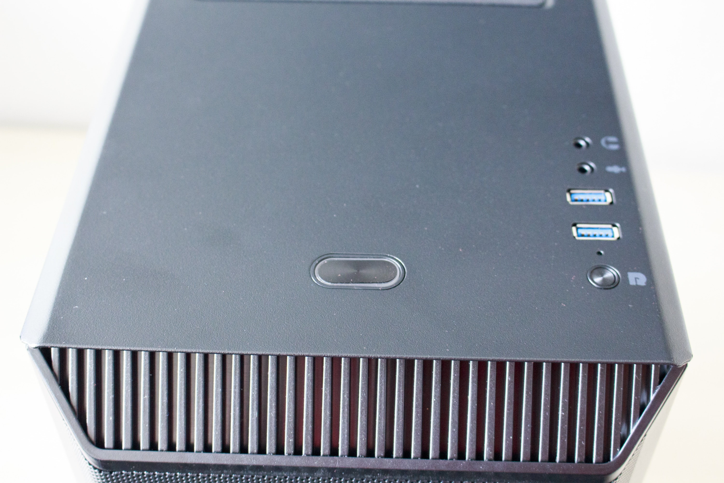 Der Deckel des P300 Air ist zweckmäßig gestaltet worden. Im vorderen Bereich findet man den mittig angebrachten Power-Button und das seitlich untergebrachte I/O-Panel. Dieses verfügt über zwei USB 3.0-Anschlüsse, zwei Ports für Kopfhörer bzw. Mikrofon und einen Reset-Taster. Im hinteren Bereich der Deckelpartie gibt es dann noch eine zusätzliche Lüfter-Öffnung für einen Ventilator mit einer Rahmenbreite von 120 oder 140 Millimetern. Zum Schutz vor Staub wurde diese Öffnung noch mit einem magnetischen Staubfilter versehen.
