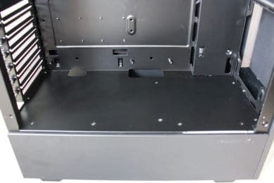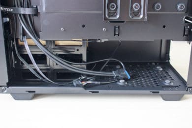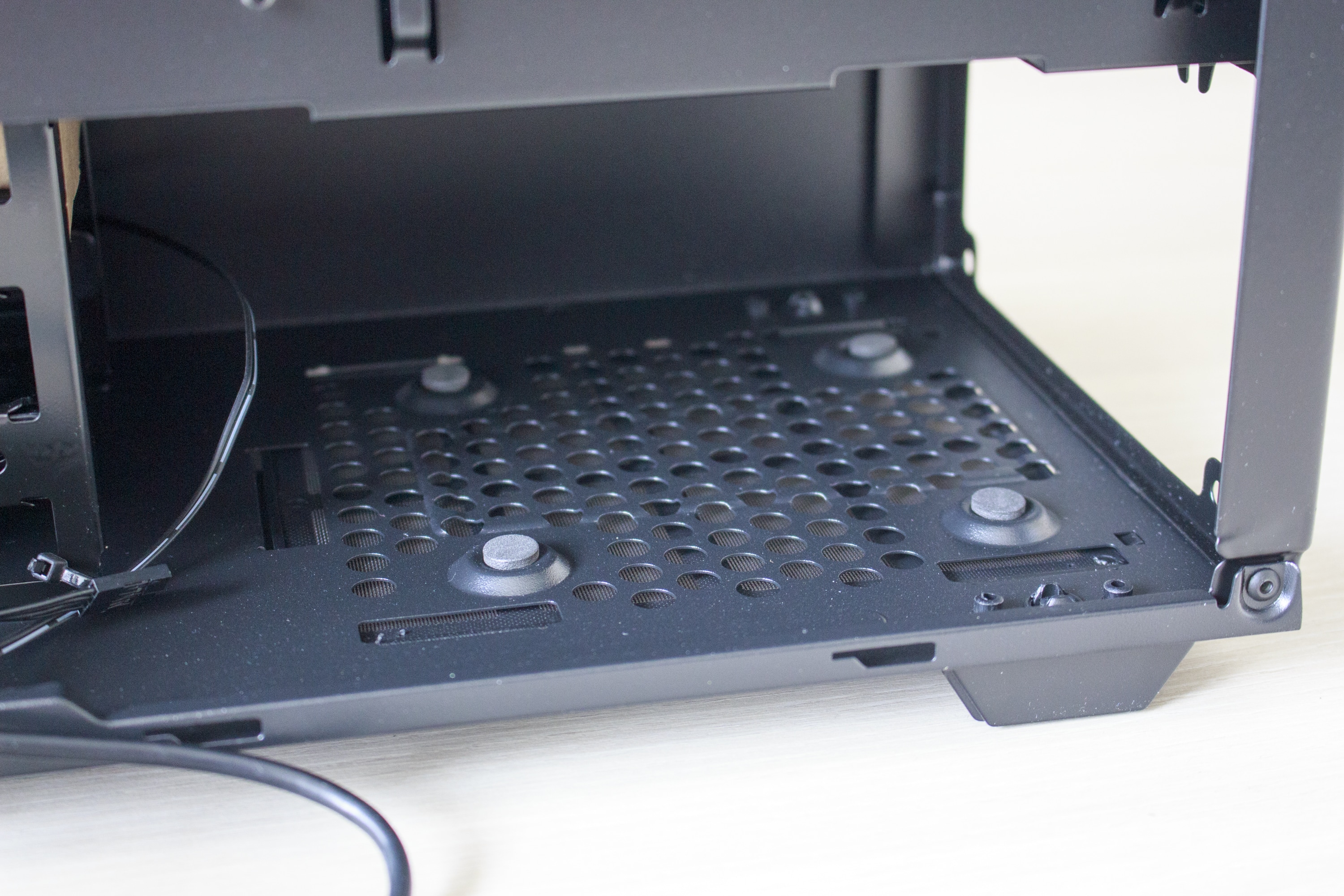 In der Zone unterhalb der Abdeckung findet das Netzteil auf vier runden Gummipuffern Platz. Daneben hat der Hersteller den Festplattenkäfig befestigt. Dieser wurde aber in einer unüblichen Position angebracht. Im Vergleich zu anderen Herstellern werden die HDD-Schlitten nämlich nach vorn entfernt und nicht zur Seite. Möchte man keine HDD verbauen, kann man den Käfig auch komplett ausbauen. Dazu muss man mit einem Schraubendreher lediglich sechs Schrauben entfernen.